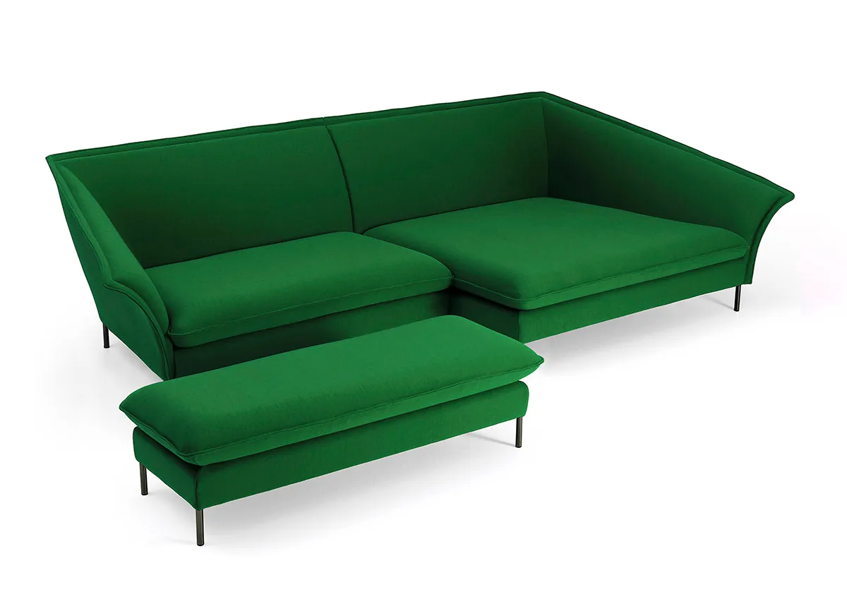 Grand is a large and generous sofa with or without chaise lounge as well as separate bench/ottoman. Grand is available in a right, left and straight variant with accompanying footstool.