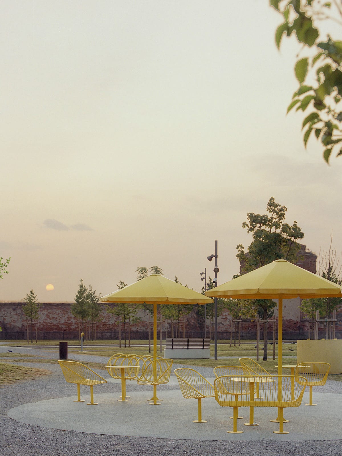 The Korg furniture group and the Four Seasons parasol create shaded spaces for social interaction in the park.