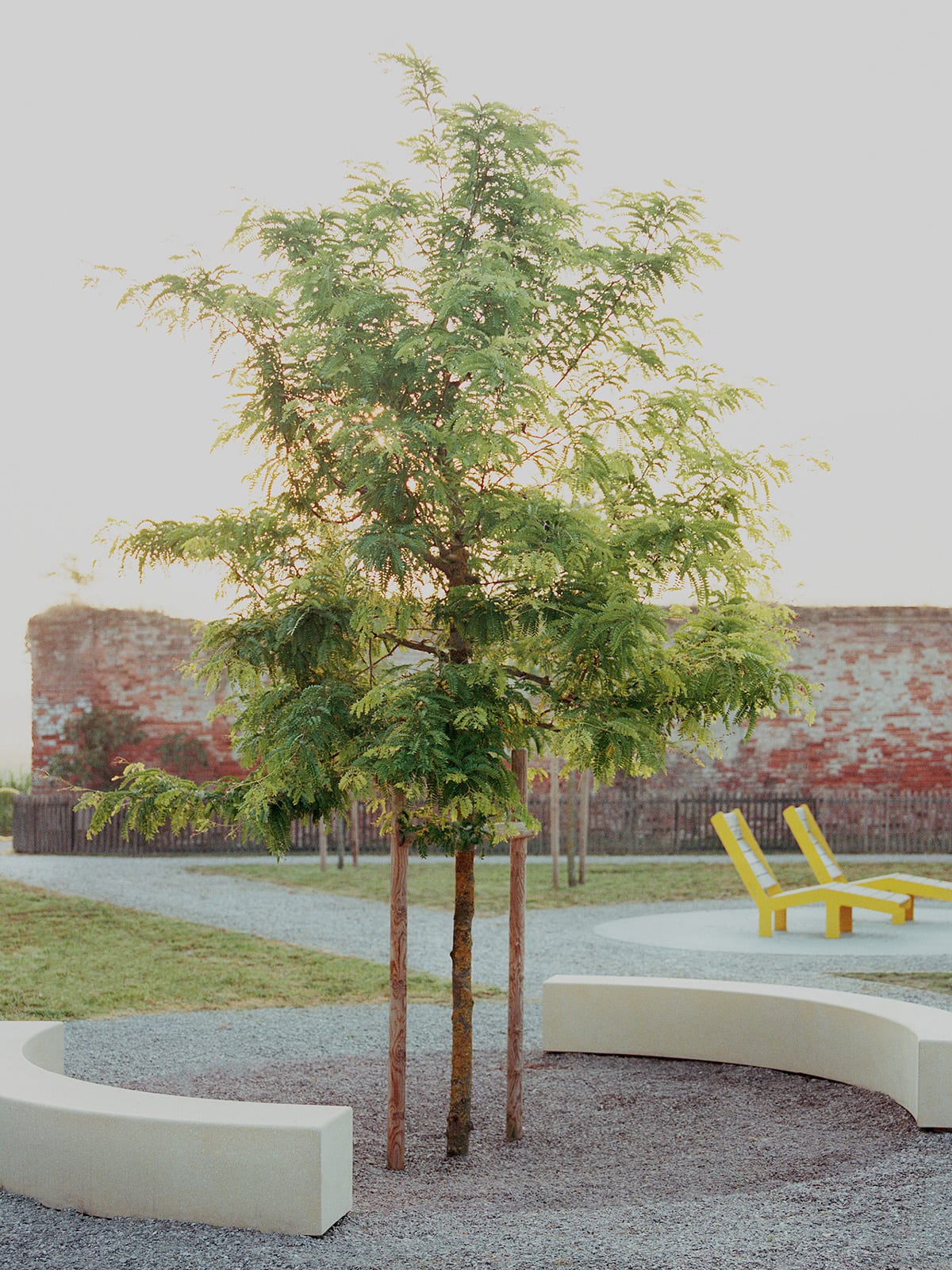For the furnishing, Nola was the natural choice. “We selected Nola’s products for their uncommon lightness, elegance, and the softness of their formal language. For us, it was essential that the furniture dedicated to social interaction carried an almost domestic character—welcoming, playful, and friendly.” The result includes lounge areas with benches, armchairs, parasols, and sunbeds that have quickly become some of the park’s most popular features. “They are so in demand that queues often form to use them,” Ghisellini notes.