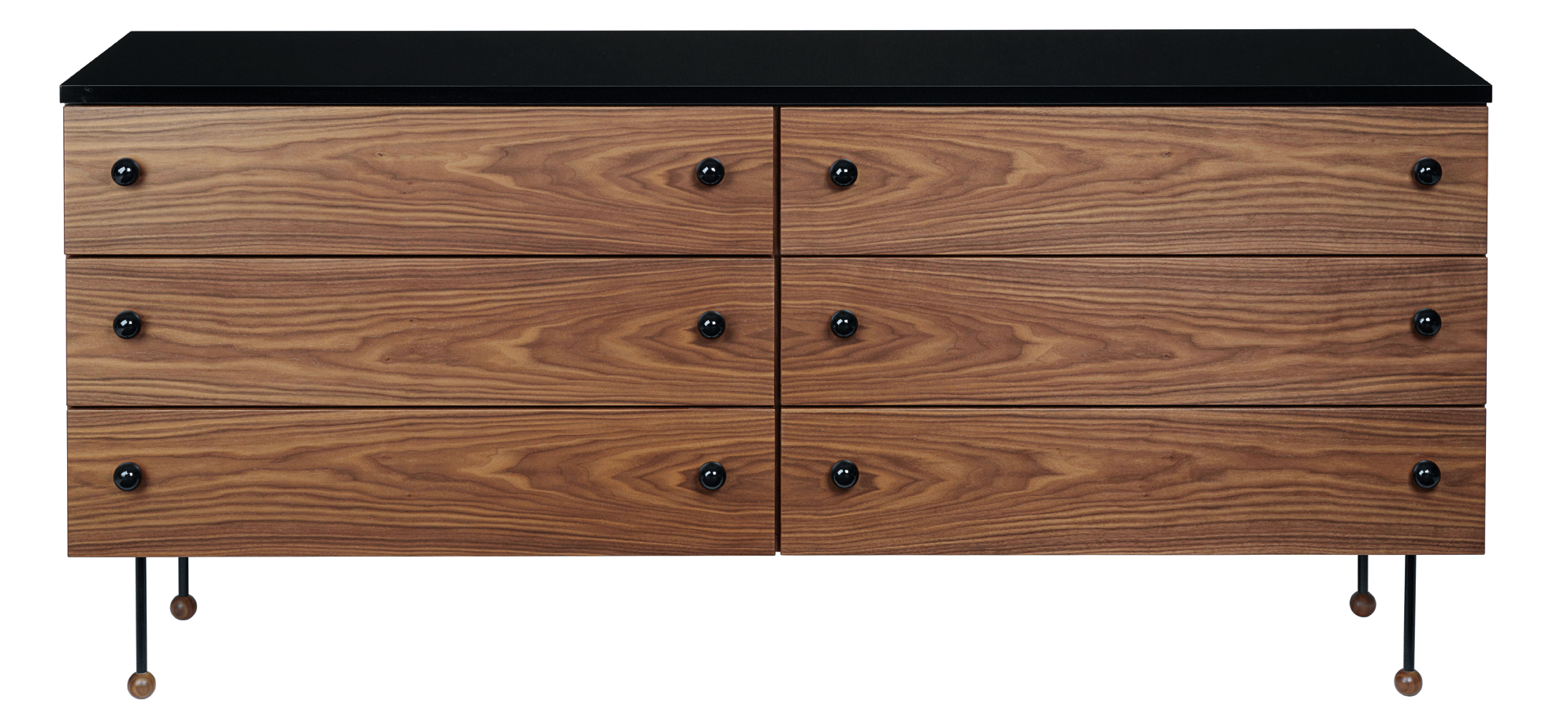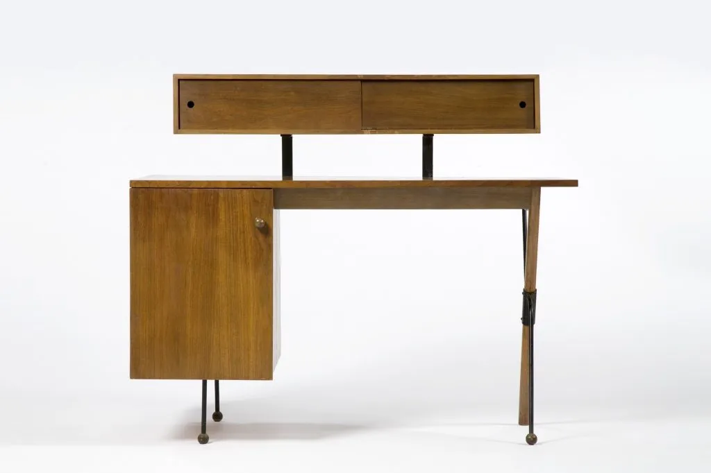Grossman’s furniture production in California was achieved through partnerships with manufacturers including Glenn of California, Barker Brothers and Ralph O. Smith & Co. These relationships allowed her to move from custom one-off pieces to serial production, adapting her designs to American industrial methods. Her furniture from this period — lounge chairs, dining tables, storage systems — shows Swedish formal restraint combined with American material experimentation and scale. She worked with walnut, teak and birch alongside industrial materials like tubular steel and bent plywood.