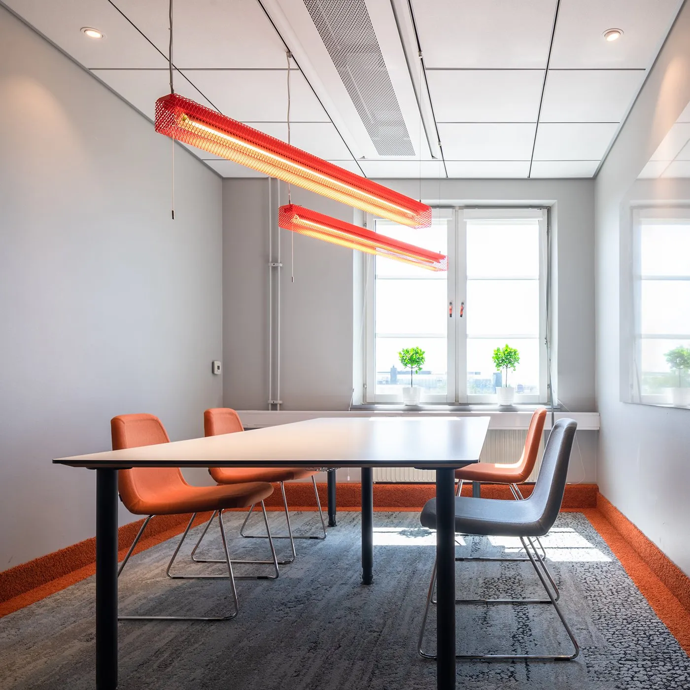 Front have been praised for their exploration of the design process and their innovative thought process and forms. On occasion, they have used help, allowing the final result to be determined by magicians, animals or chance. A constant flow innovative processes can be seen in their output, and in Grid, industry standard sheet metal with various hole formations decorates the series of pendant and ceiling fittings. Grid is available in three patterns. Two different perforated metal patterns and one in expanded metal. L 1250 mm.