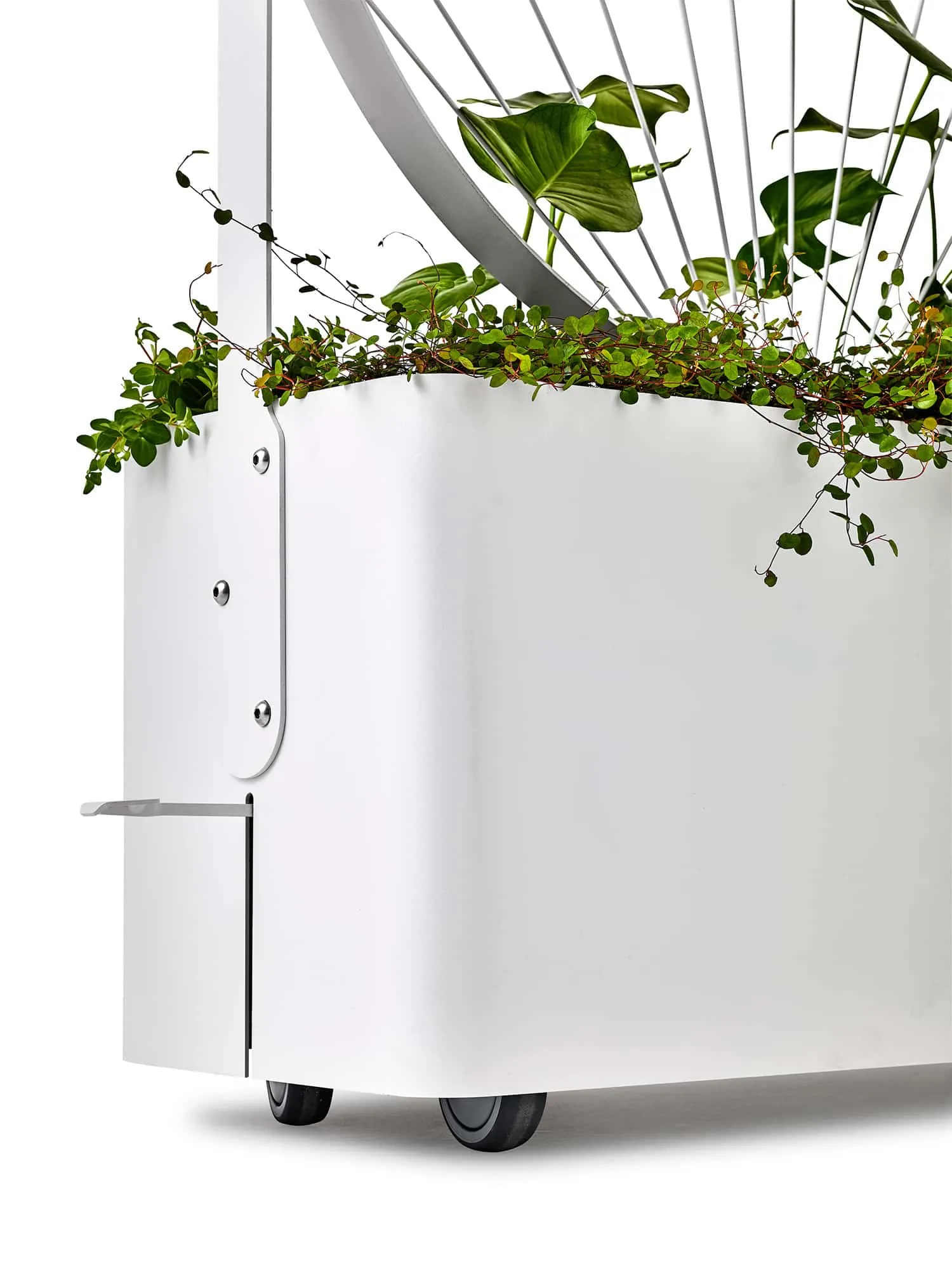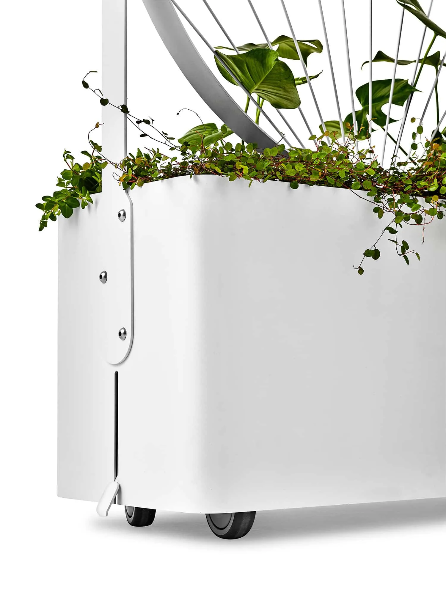 Gro celebrates the beauty of nature, making it possible to bring climbing plants, vines and creepers into environments built by man. The planter is fitted with frameworks designed in three interchangeable patterns: the striking Romb design, the leaf-patterned Blad and the geometrical Triangel. When several planters are placed in a row, their decorative geometrical designs can create an attractive screen or provide a stylish means of dividing space. Rollers integrated into the base make Gro easy to move; despite its substantial size, the planter can glide from one space to another. The Mona irrigation tank is available as an optional accessories.