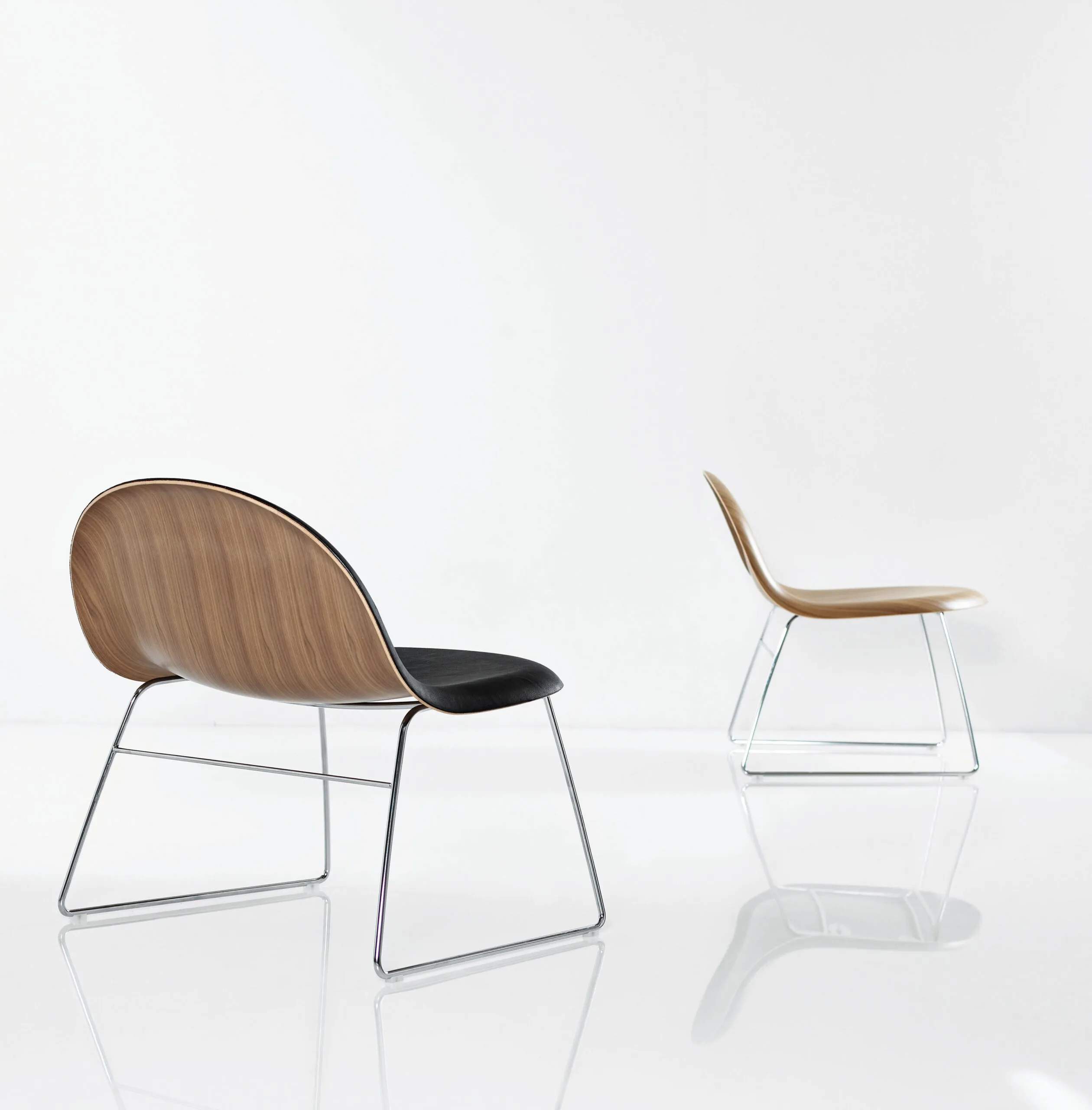 GUBI CHAIR are available in beech, maple, oak, and walnut veneer and front padding in fabric or leather. The bases are mat chrome or chrome, stackable or non-stackable, or with four legs.