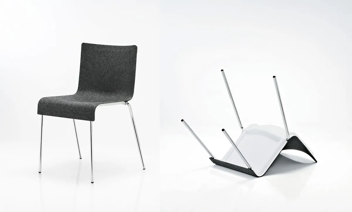 The chair is initially launched in a plain colour or in two-coloured felt in a combination of black, dark grey, light grey, off white and sand colour.
