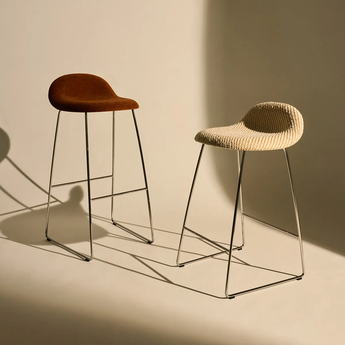 The GUBI 3D Chair in veneer also offers a variety of upholstery options, enhancing its adaptability. All veneer versions of the GUBI 3D Lounge Chair come fully upholstered. Three base types are available: a four-legged base and a stackable sledge base in black powder-coated steel, as well as a standard sledge base in both polished stainless steel and an outdoor suitable black powder-coated steel. Each contributes to the chair’s slender and lightweight silhouette.