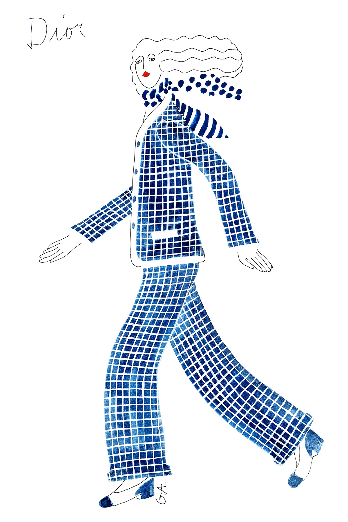 Illustration depicting a blue checked suit from Dior by Gunila Axén for Dagens Nyheter, 1967. For Dagens Nyheter she was a fashion illustrator 1966–1974.