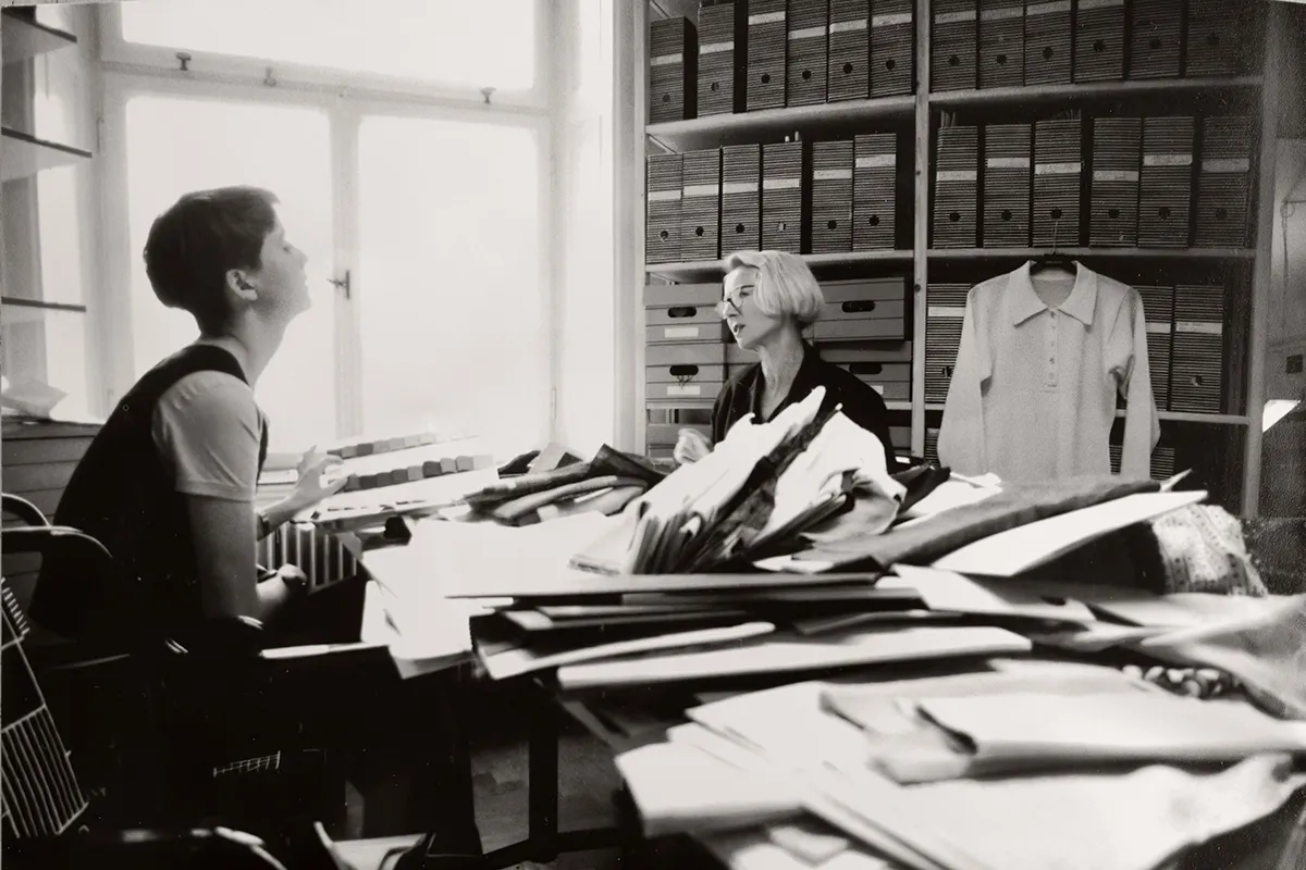 From a catalog from 1988 for Axén & Co who made clothes for women in their career between 1984–1999. In the picture, Gunila Axén and Anna Karin During select fabrics for the upcoming collection.