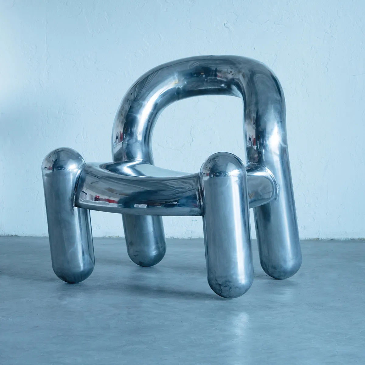 Transitioning from the virtual environment to tangible reality, the meticulous process of crafting the armchair began. For its superior formability compared to steel, along with the advantage of less weight, and as a climate-smart choice for a 100% metal object, aluminum emerged as the ideal material. Collaborating with skilled sheet metal workers, accustomed to shaping motorcycle gas tanks, enabled the production of the armchairs seat. On Ekerö, craftsmen painstakingly created the domes, encapsulating the legs, through manual pressure turning. The parts were then masterfully combined through the works of a skilled TIG welder. Achieving the unique deep- to bright-red color gradation required the expertise of an airbrush motif painting studio.