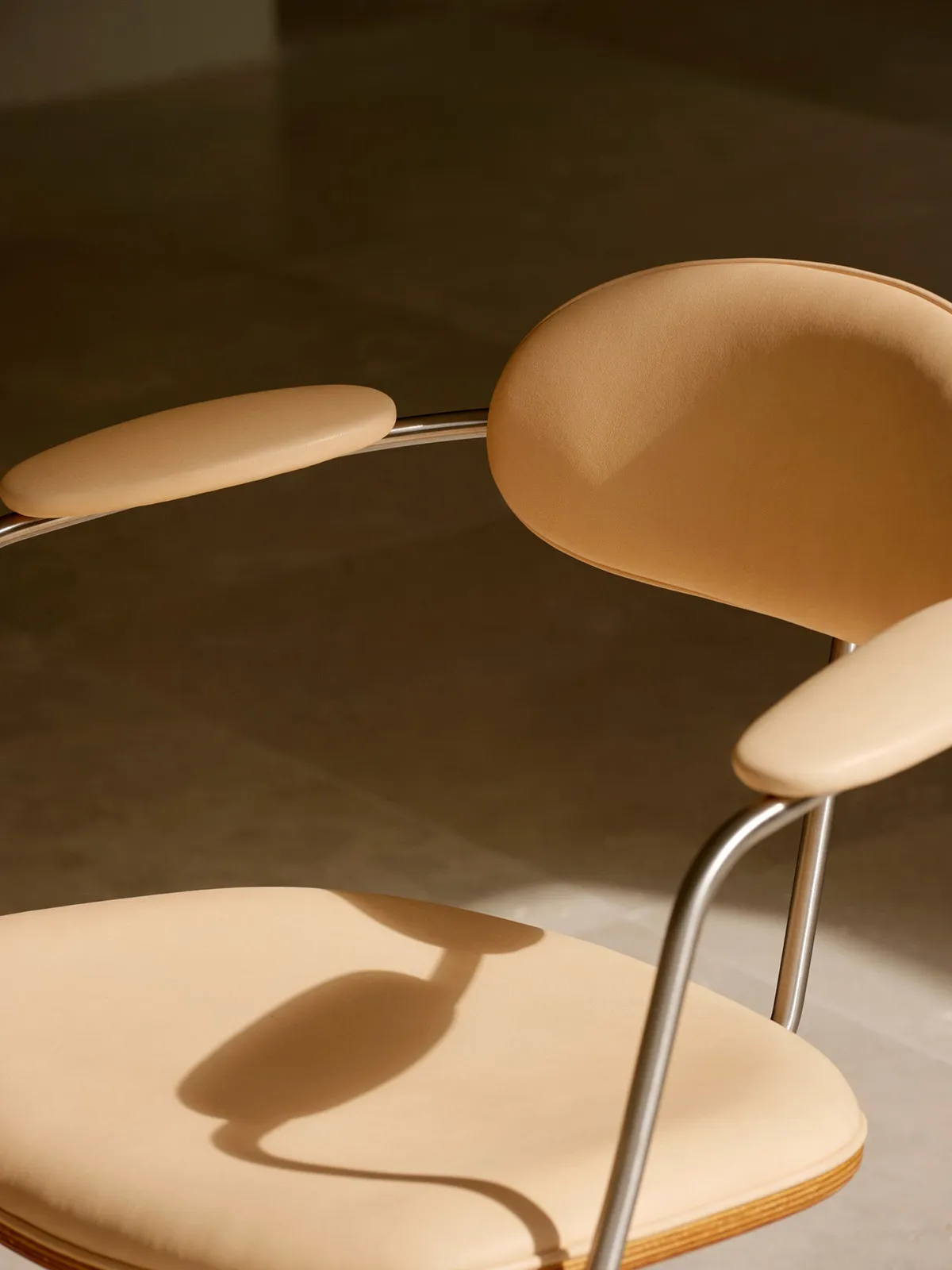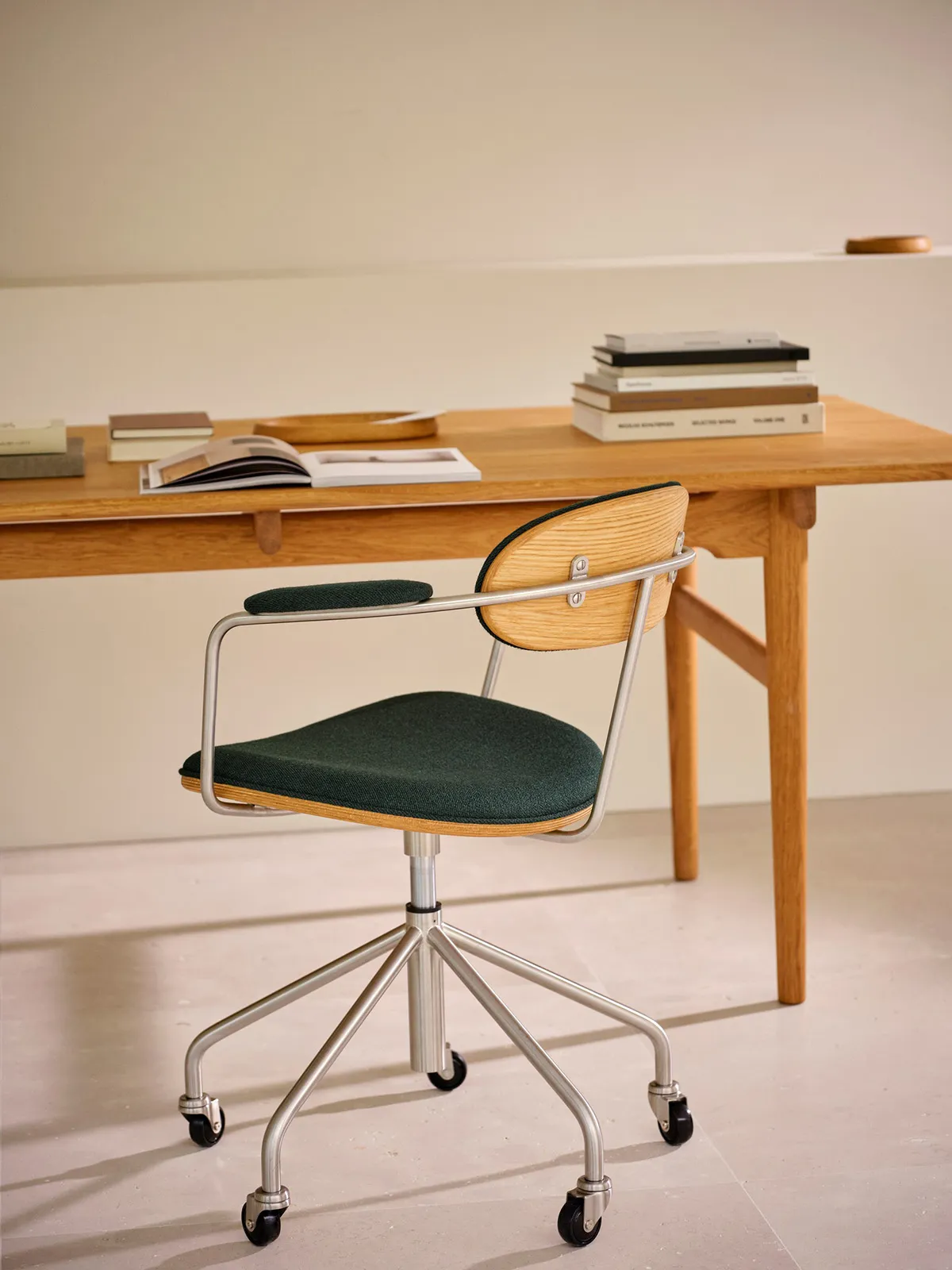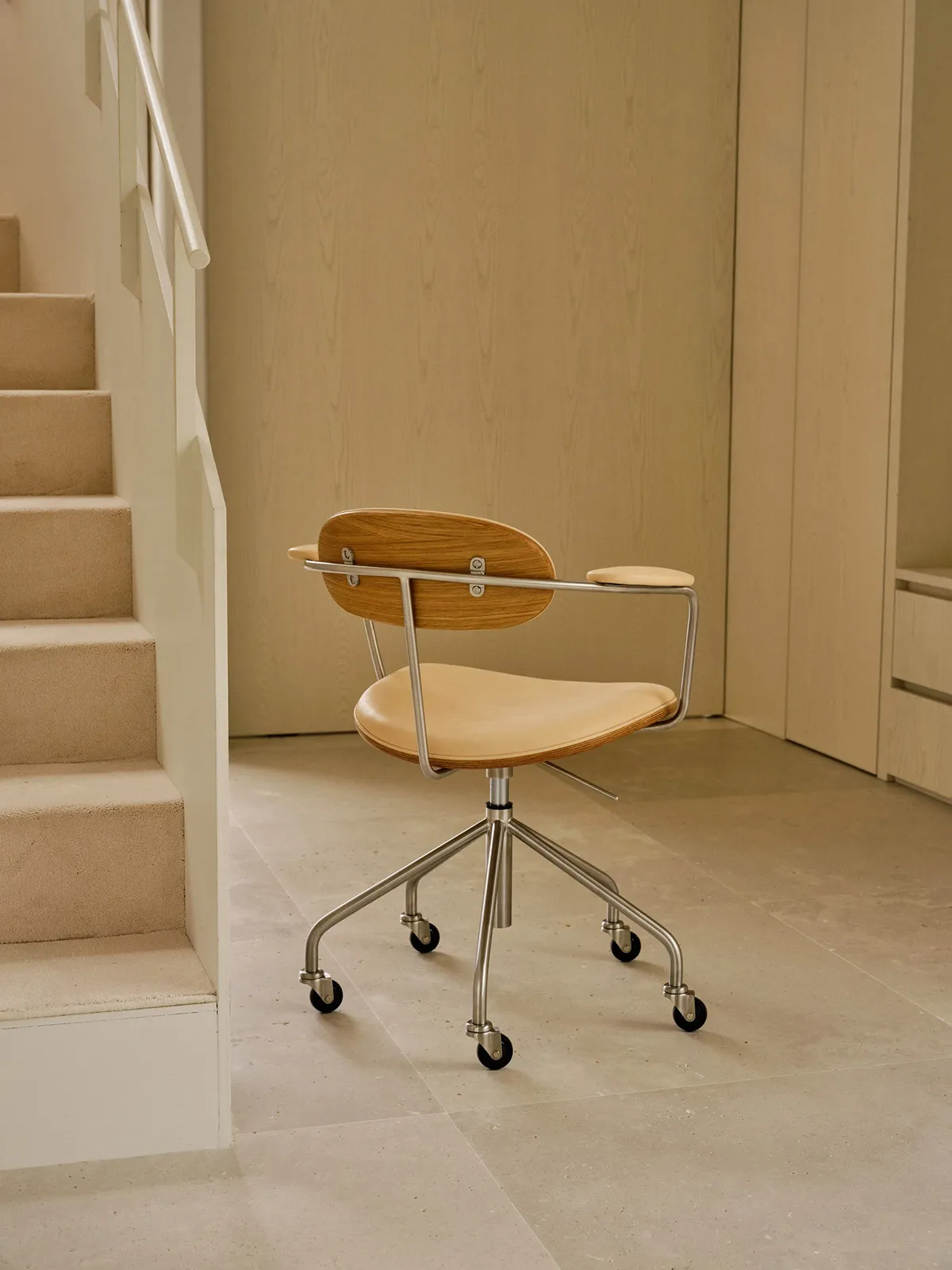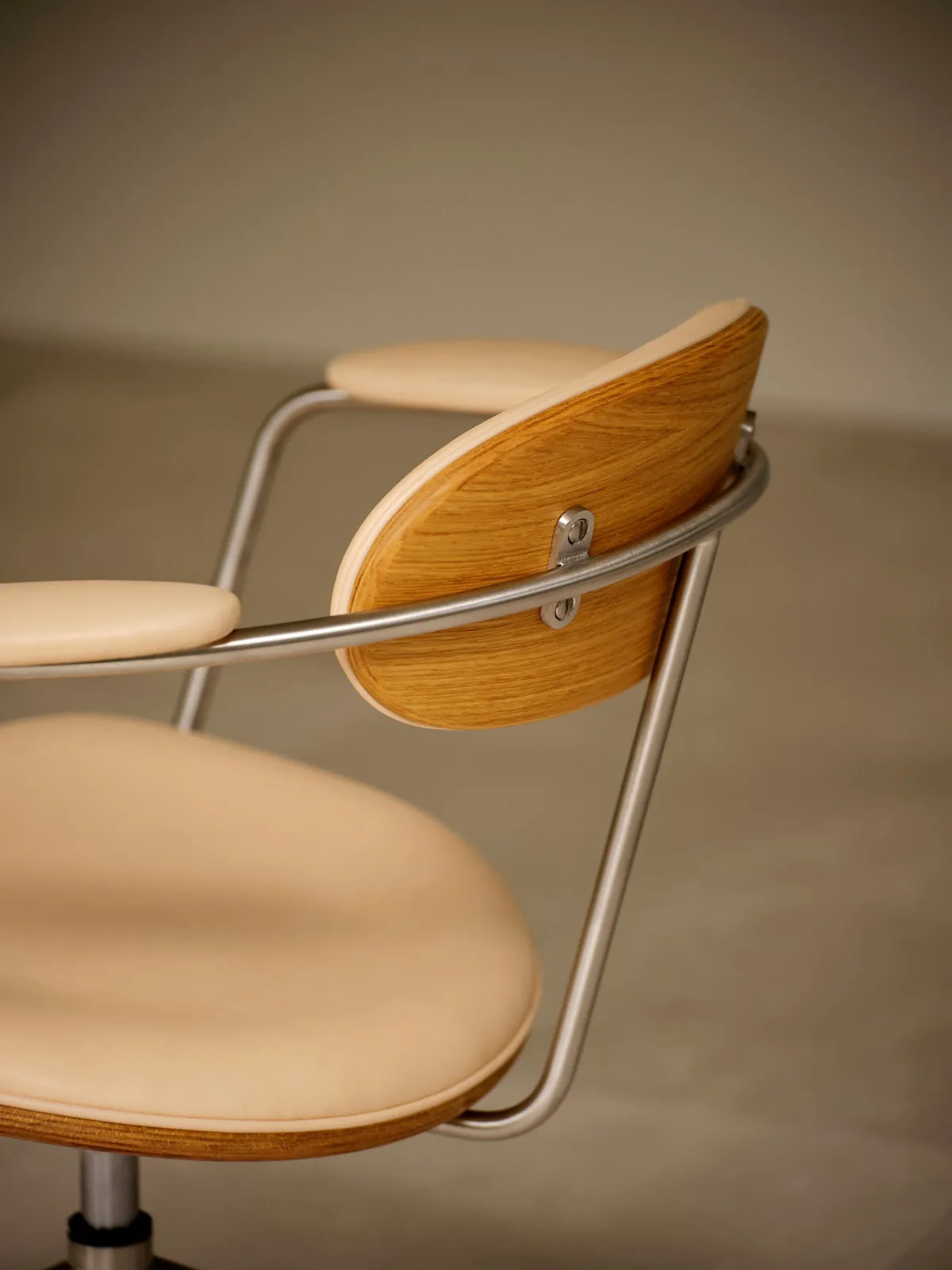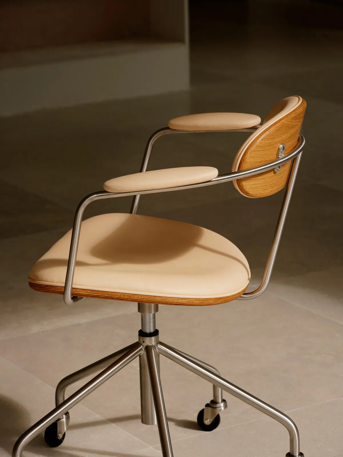 The Swivel Chair has an industrial design idiom, blending a sleek, brushed-steel frame softened by the oak, fabric and leather details of the chair’s seat, arm and backrest. The height of the original version of the chair has been adjusted using a spindle, requiring the user to rotate the seat to achieve their desired height. For a more user-friendly design, the spindle has been replaced with an easy-to-use height-adjustment lever operating a modern gas lift cylinder. In addition, the relaunched chair is equipped with five castors, instead of the original four, to comply with modern stability requirements. Custom castors made of brushed steel provide the finishing touch to the industrial aesthetic.
