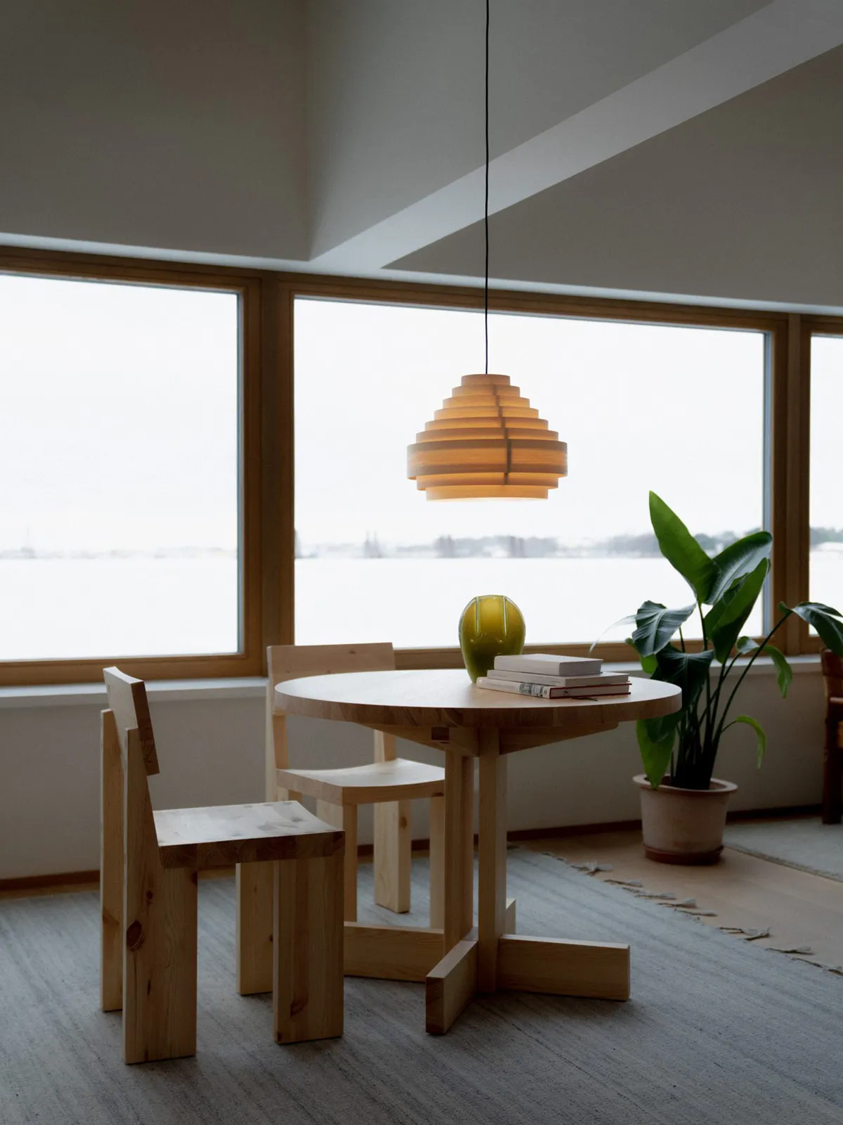 The warm glow of light filtering through pine veneer combined with an unexpectedly graphic and elemental form is the enduring appeal of these iconic designs by Hans-Agne Jakobsson. When Vaarnii began exploring the use of pine wood in lighting design, it quickly became clear that the iconic designs of Hans-Agne Jakobsson from the 1960’s could not be bettered. Pine is used efficiently; it’s tone and grain are employed to maximum effect in designs that project material mass but boast actual lightness. Vaarnii has re-engineered three of Jakobsson’s pendant designs using solid Finnish pine to support circular strips of high-quality pine veneer, reintroducing these classic 20th century designs to the market after decades of absence.