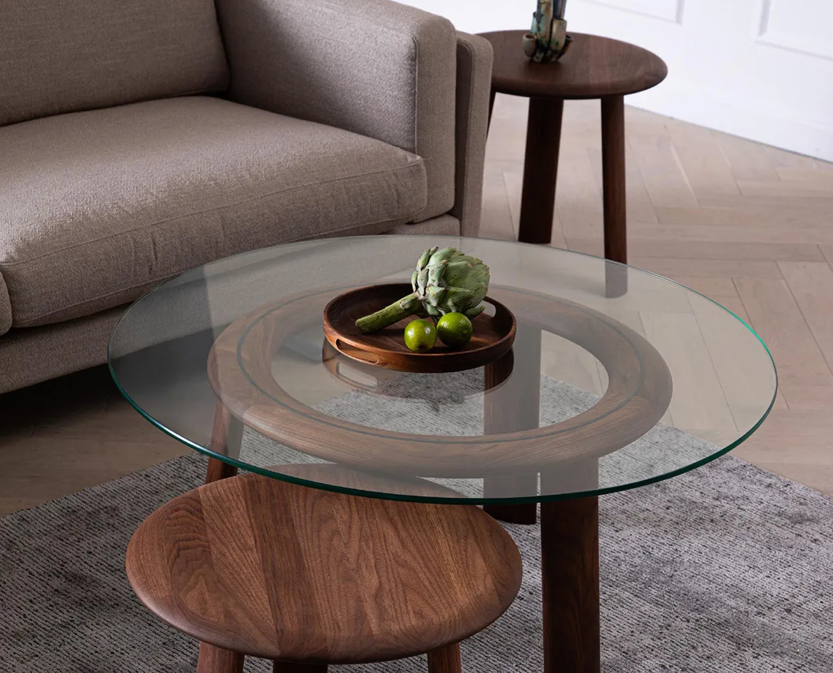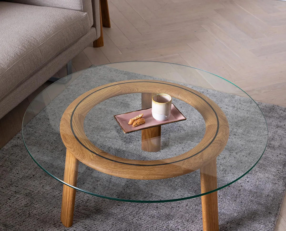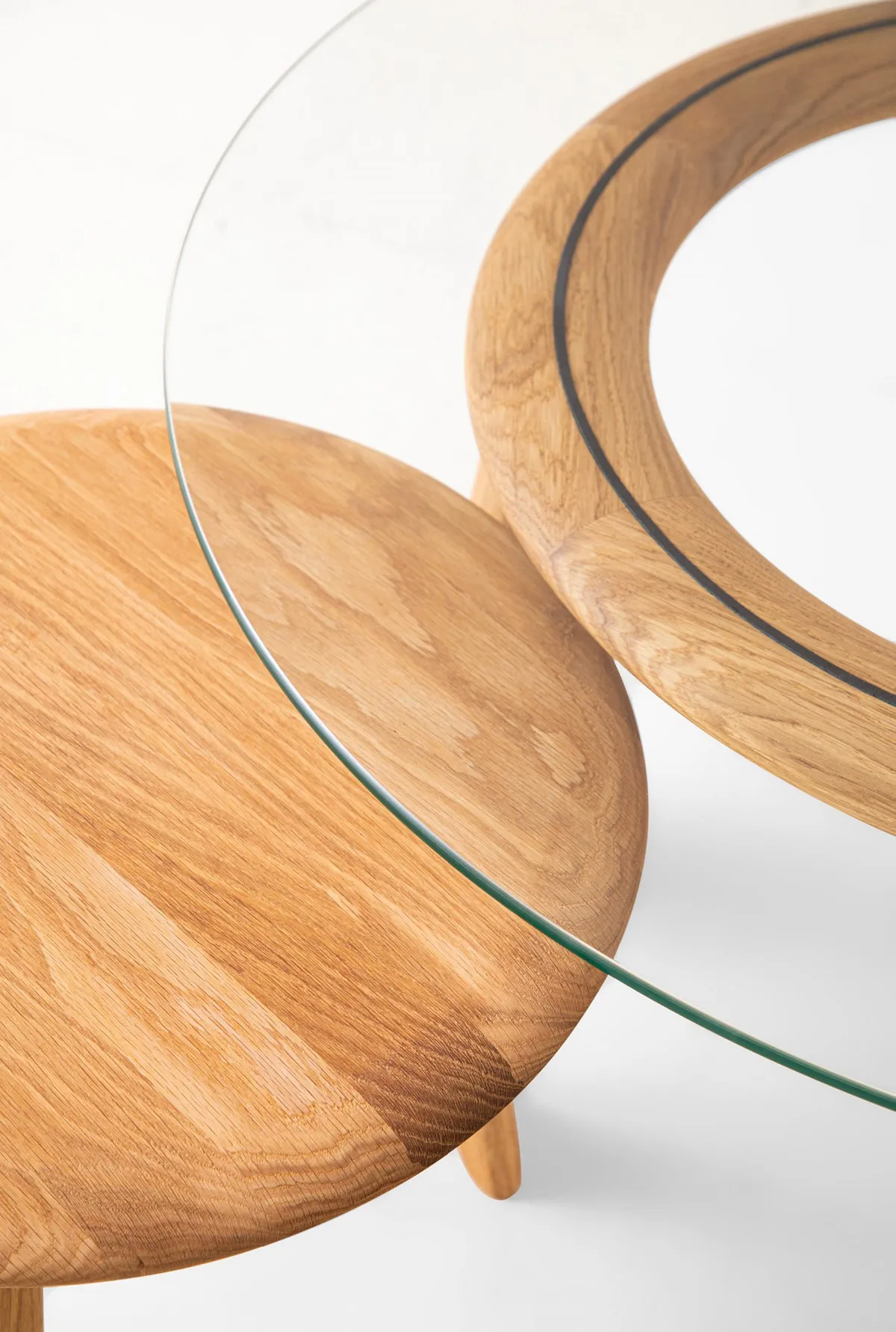 A thoughtfully integrated leather cord, discretely recessed within the wooden ring, secures the glass top with elegant efficiency—a detail that exemplifies Scandinavian design’s marriage of function and form. This subtle yet essential element ensures stability while maintaining the table’s clean, uncompromised aesthetic.