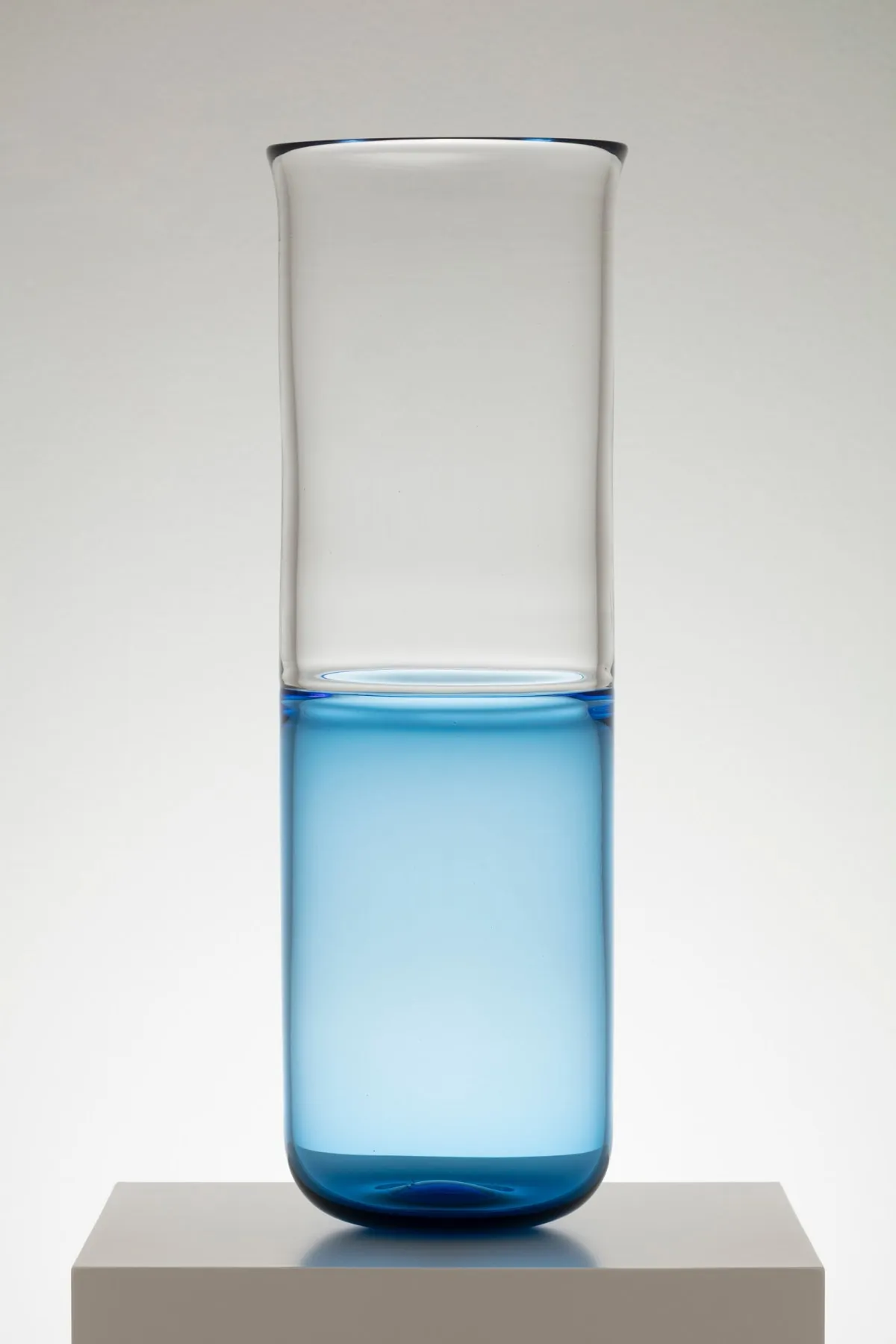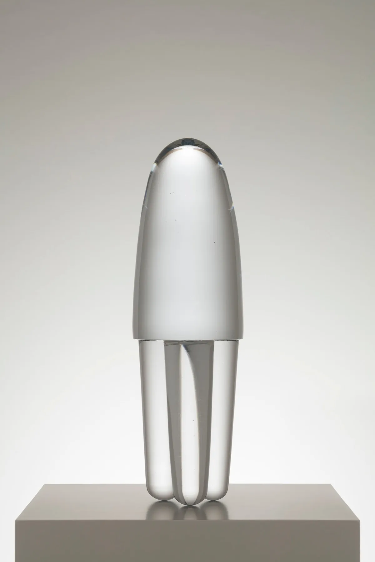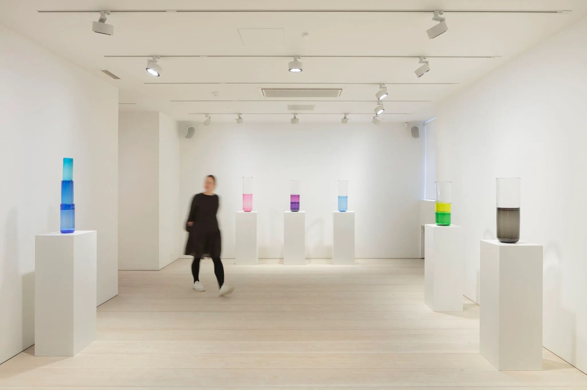 Glass, with its reactive sensitivity, naturally lends itself to the creation of multi-layered forms. As a material born from the transformation of sand through intense heat, then cooled into solid form, glass inherently embodies shifting states of matter. Koskinen’s minimalist visual vocabulary resonates beautifully with the fragility of his medium. Most of the featured sculptures were handcrafted at the historic glassworks in Iittala and Riihimäki, with select pieces produced in Switzerland. This marks Koskinen’s fifth solo exhibition at Galerie Forsblom.