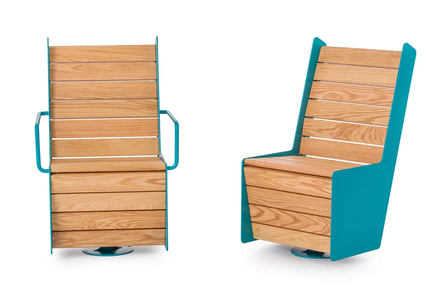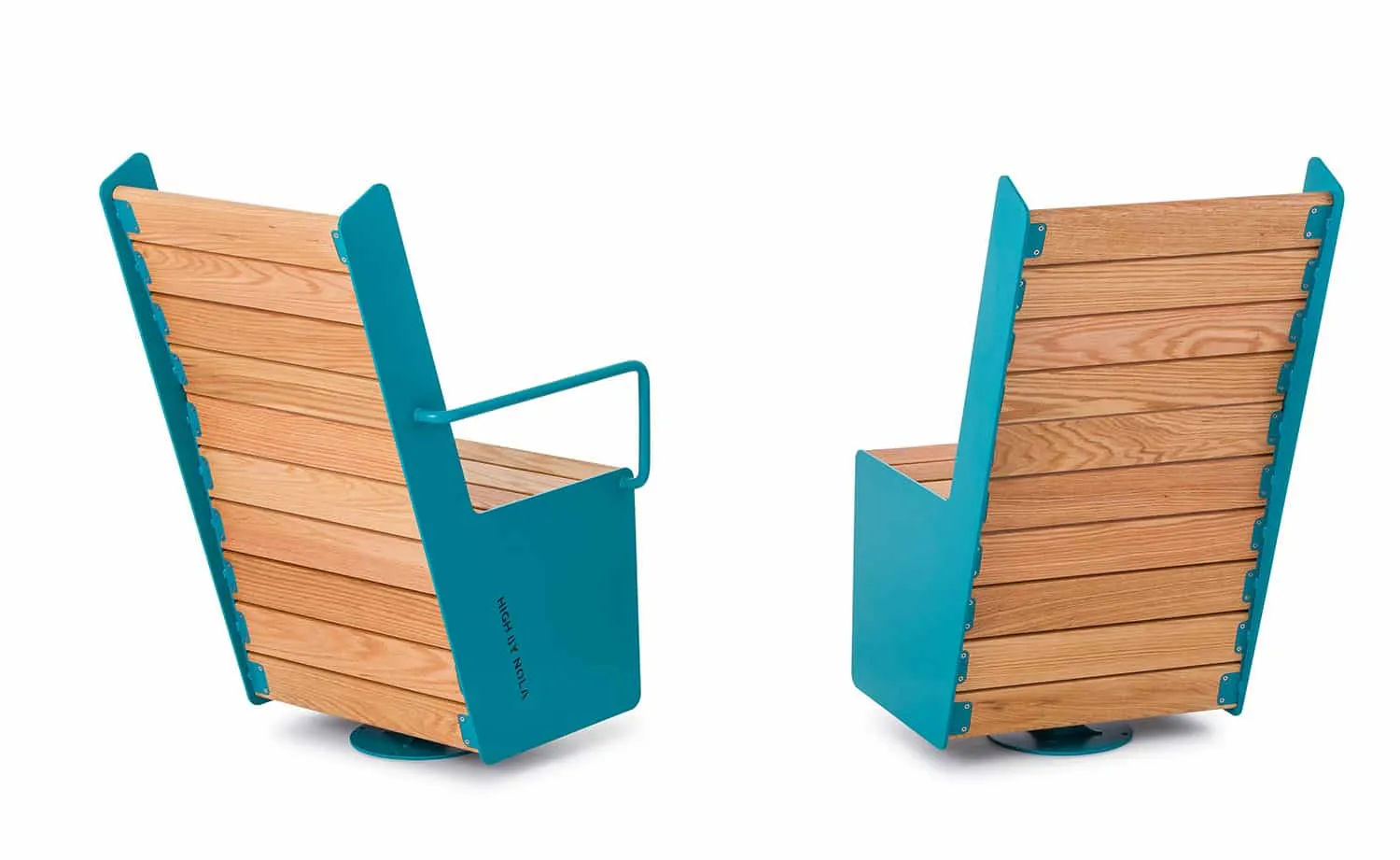 This swivel chair strikes a perfect balance between functionality and form. The seat and backrest are crafted in a single expression that extends from the base to the full height of the chair. The seat is created by slats of oiled oak attached to side panels made from laser-cut steel. The chair’s slatted construction and robust structure create an all-weather ergonomic seat accessible to a wide range of body types and abilities. The High swivel chair is a new addition to the Low/High furniture group.