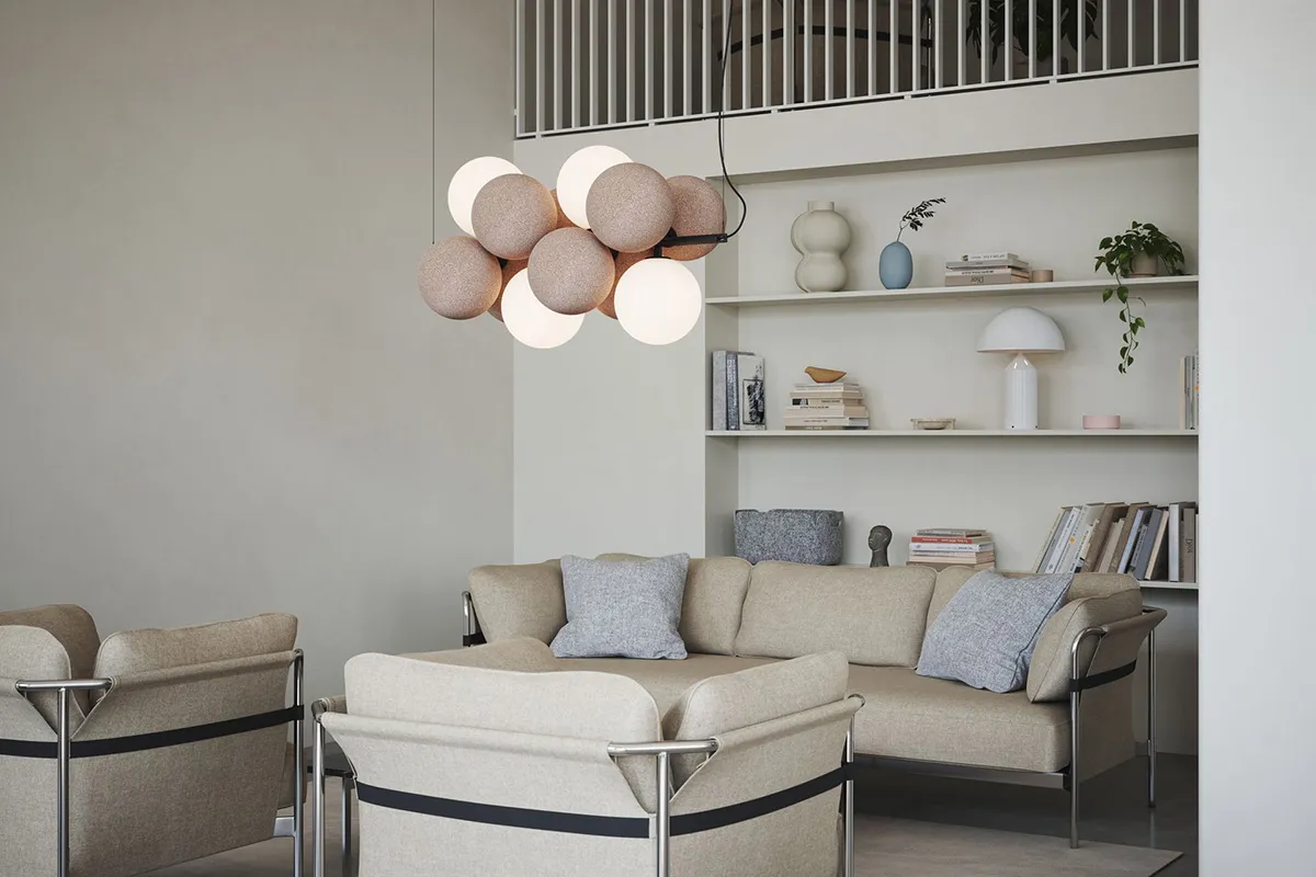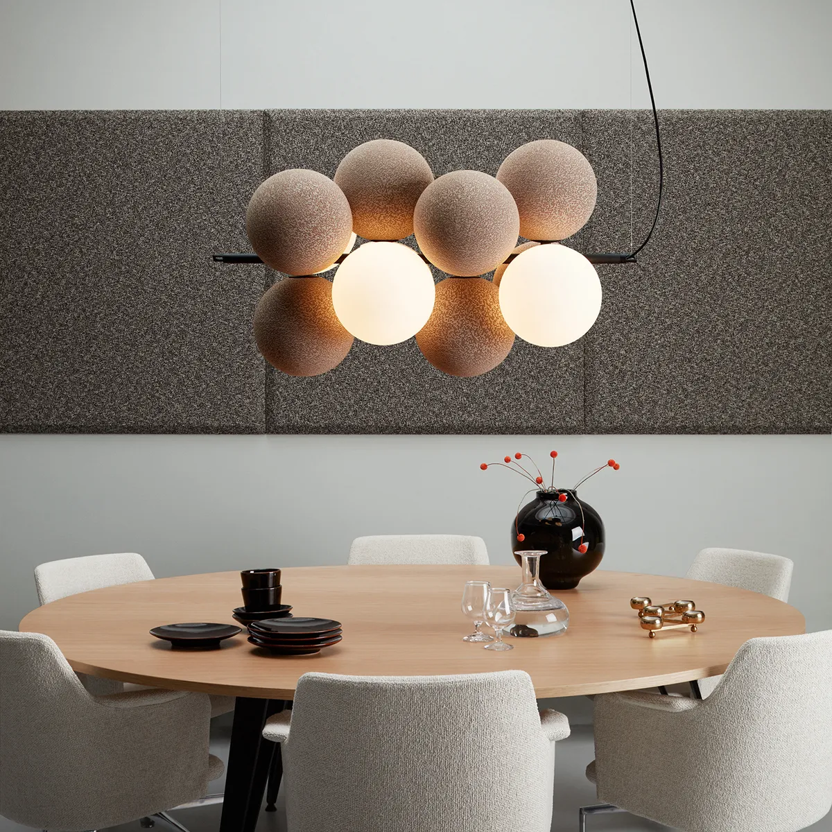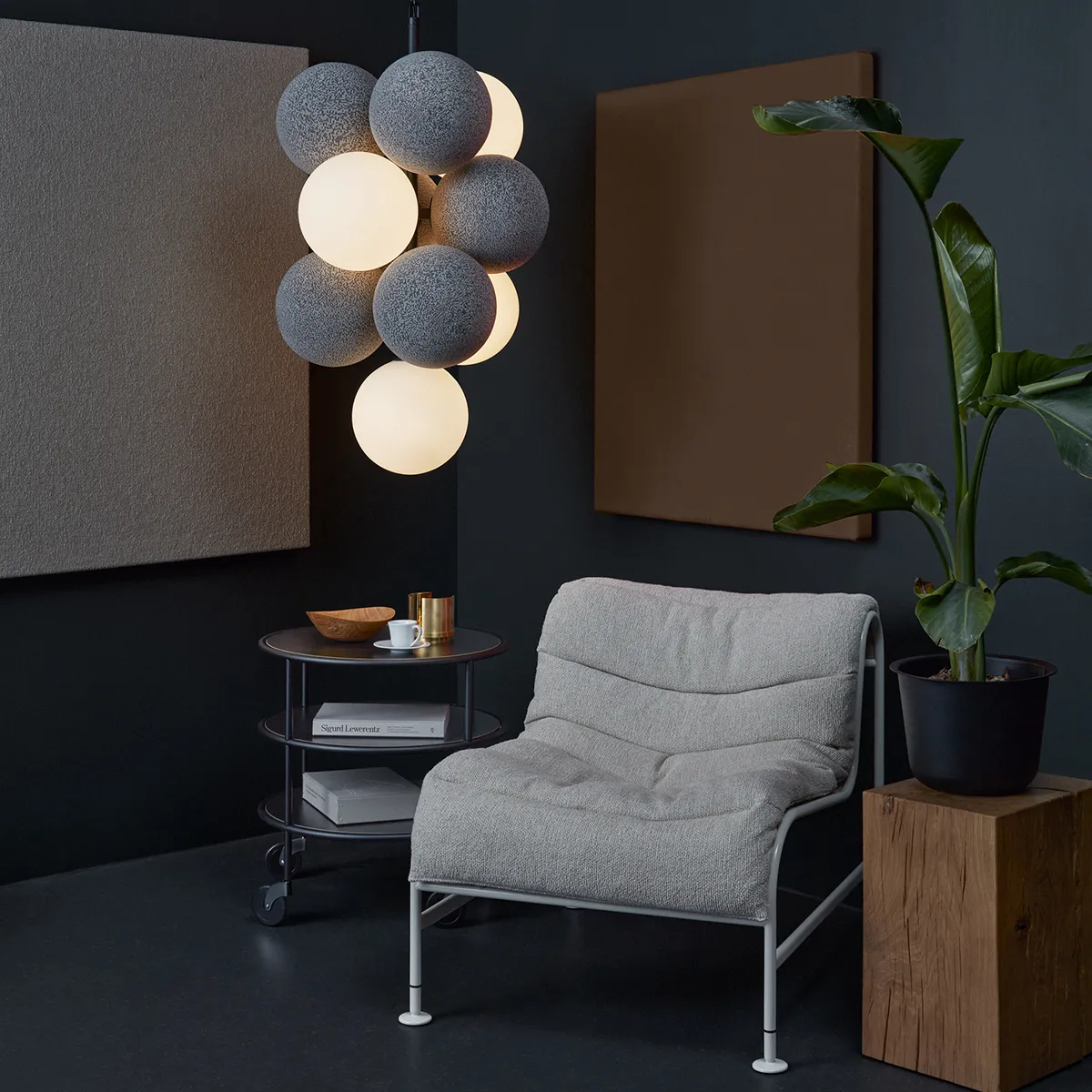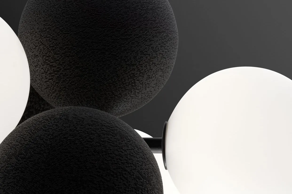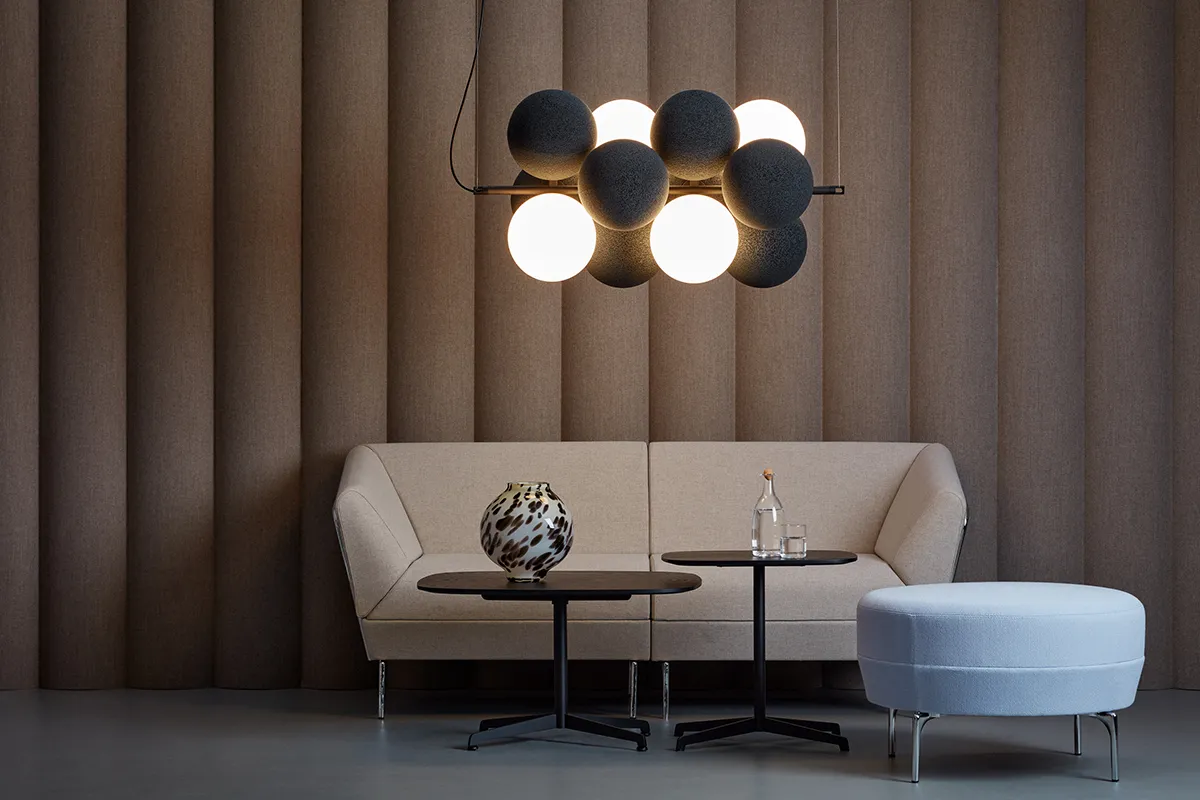 Holly functions as a light sculpture consisting of large, luminous orbs made of milk glass and non-luminous, acoustic orbs filled with textile remnants and reclaimed polyester encased in a 3D-knitted fabric — an innovation introduced with Holly that greatly reduces textile waste. Holly awakens thoughts and associations that might soar to the Moon or the Sun. But the designers’ source of inspiration was rather more down to earth. “We were thinking of holly and its beautiful berry clusters. Our working name for it was Holly, as well,” explains Klock.