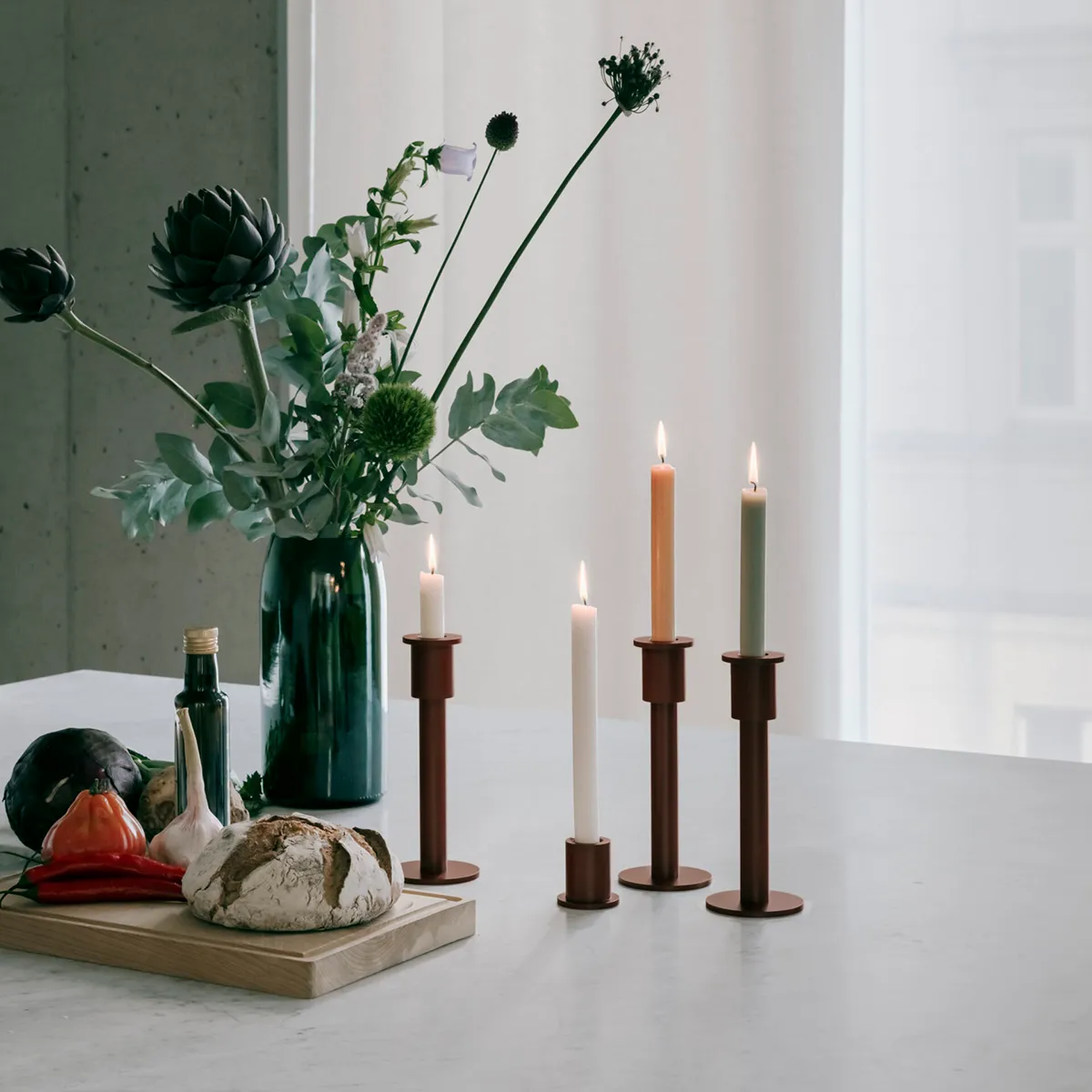 While entirely crafted from steel, its wall bracket and candleholder are coated with a rich, deep shade of red oxide, creating a bold contrast to the highly polished surface of the wall mirror. The holder can also be removed and used on its own, or with a matching candlestick for added height.