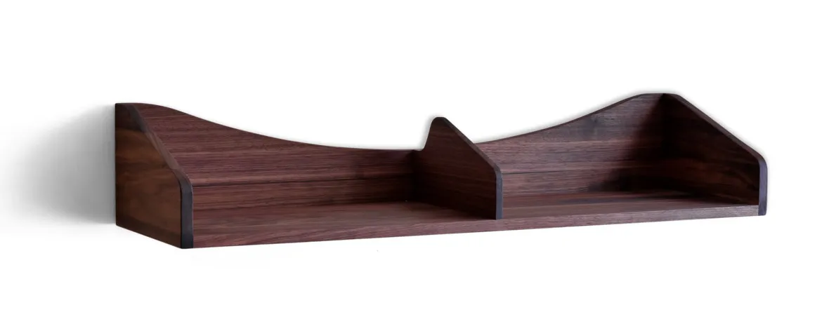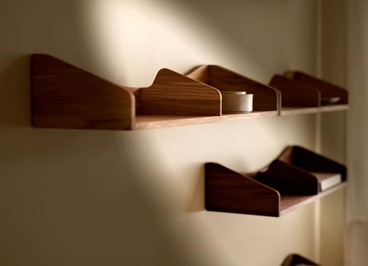 The Hulsø Shelf will be available in oil-treated solid oak or walnut and can be mounted on the wall individually, in rows, or in free formations. When multiple shelves are combined, they create a cohesive organic expression with soft, curvy lines, adding both function and decoration to any space. Additionally, the shelf features a specially designed wall bracket that allows for adjustment after mounting.