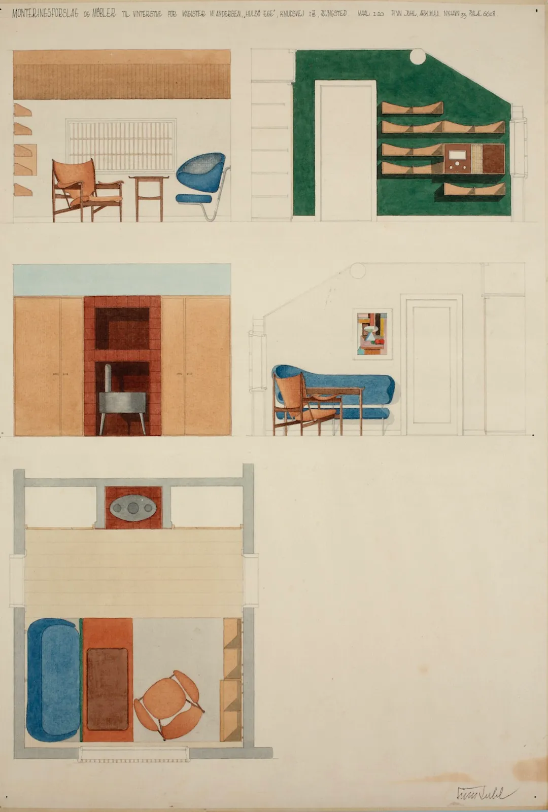 Finn Juhl’s original drawing of the interior at Magister W. Andersen’s home in Hulsø Ege, Rungsted. Photograph by Pernille Klemp, Design Museum Denmark.