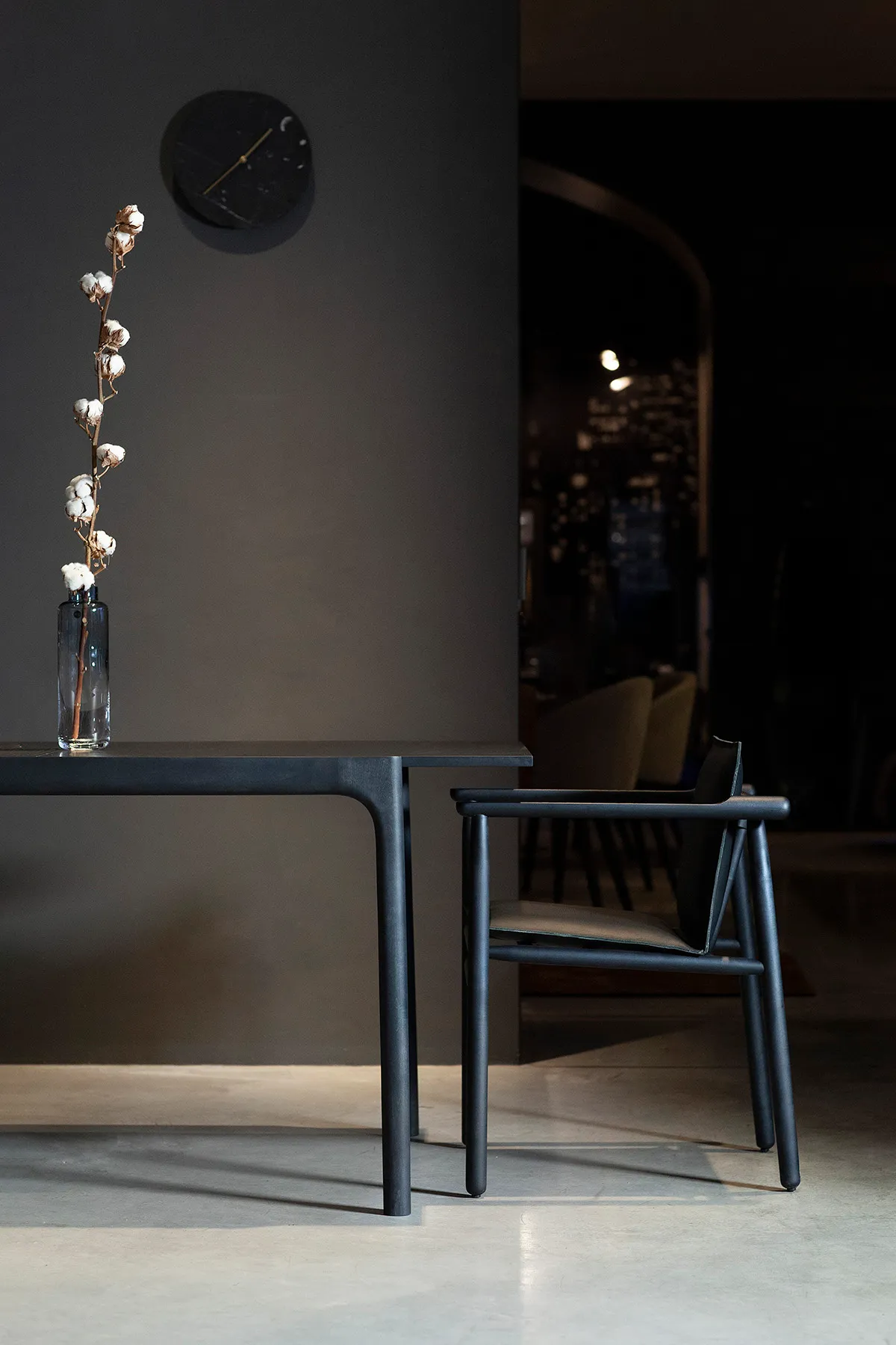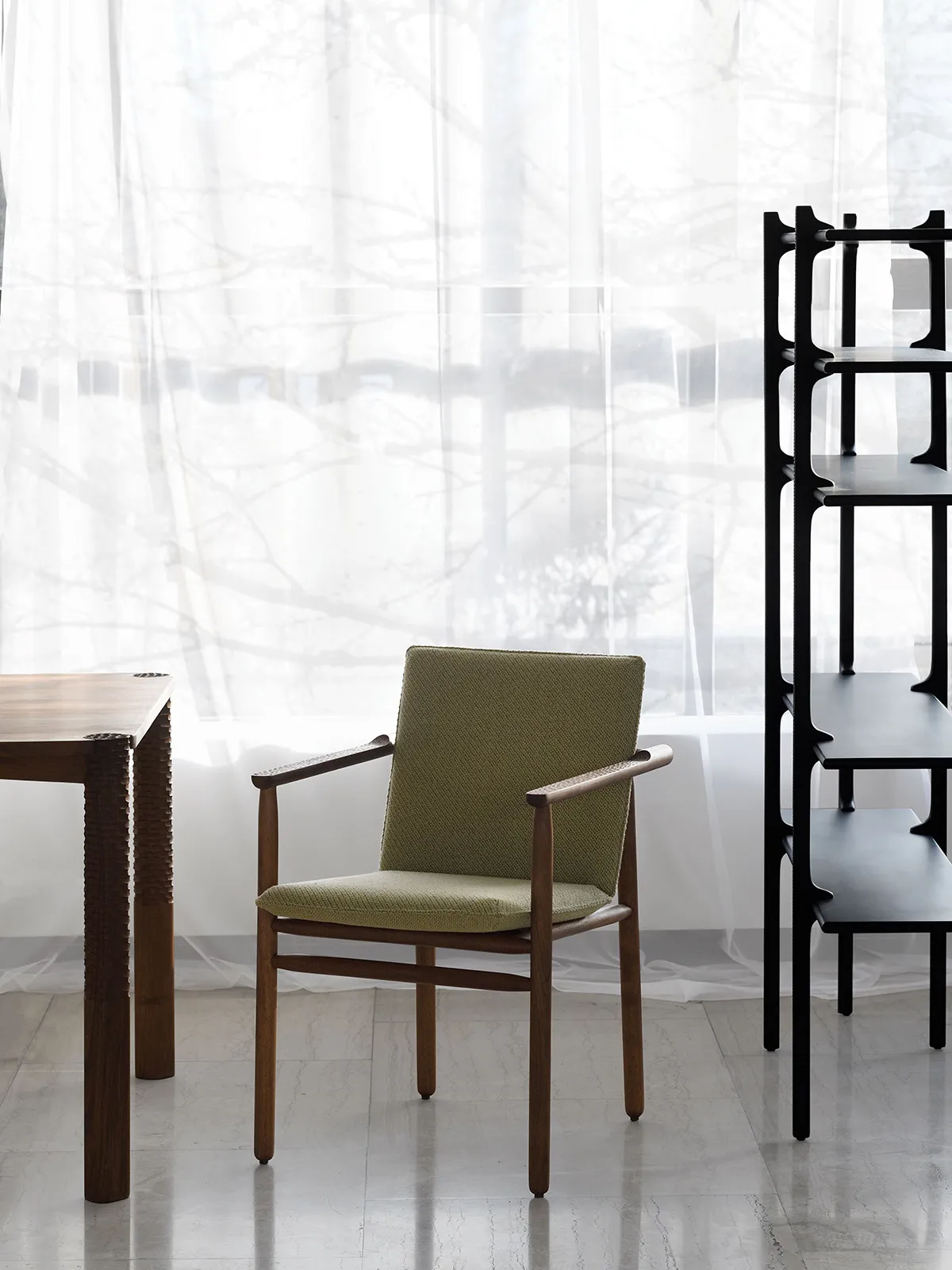 The chair comes in a version without armrest and with armrests. The refined hand-carved details on the flat-cut surfaces of the armrests and the back beam add to the chair’s character and tactility.