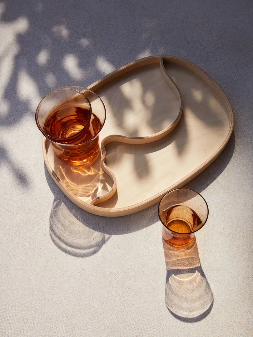 The plywood trays come in two sizes: 300x220mm and 500x365mm. Made of smooth oak plywood, they feature a divider in the shape of Aalto’s iconic wave, making them safe and stable to carry. The trays are perfect for the kitchen either for organizing everyday items beautifully or carrying wine glasses out to the balcony.