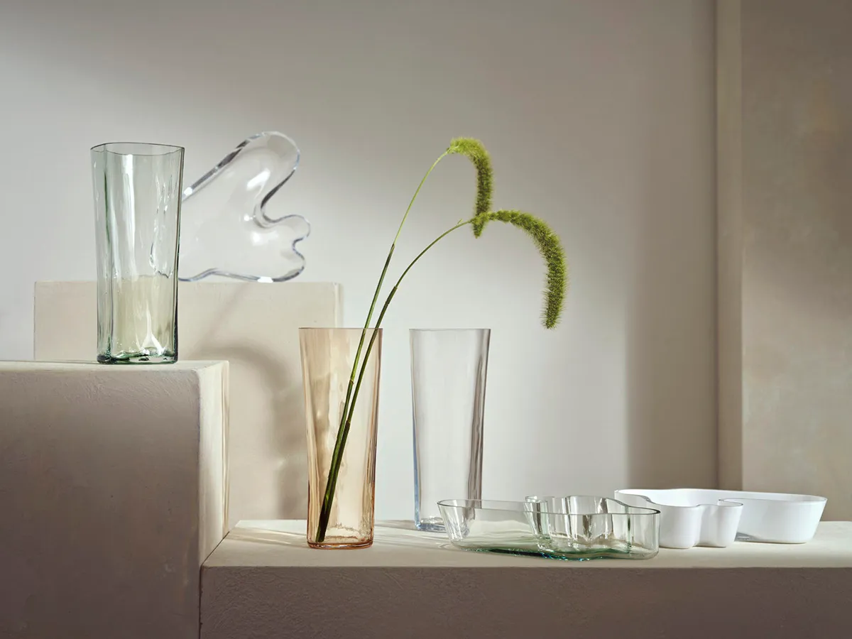 In 2023, Iittala celebrates Alvar Aalto’s 125th birthday by launching two new vases and a bowl from the Alvar Aalto collection from 1936. The original, rarely seen shapes from the collection are scaled to sizes for today´s use, and versatile flower arrangements. The selected colours follow the original colours from the 1930´s. Iittala also re-introduces glassware by Aino and Alvar Aalto. The mouthblown glasses are introduced in the typical 1930´s glass colour Rio brown and they are available only in 2023.