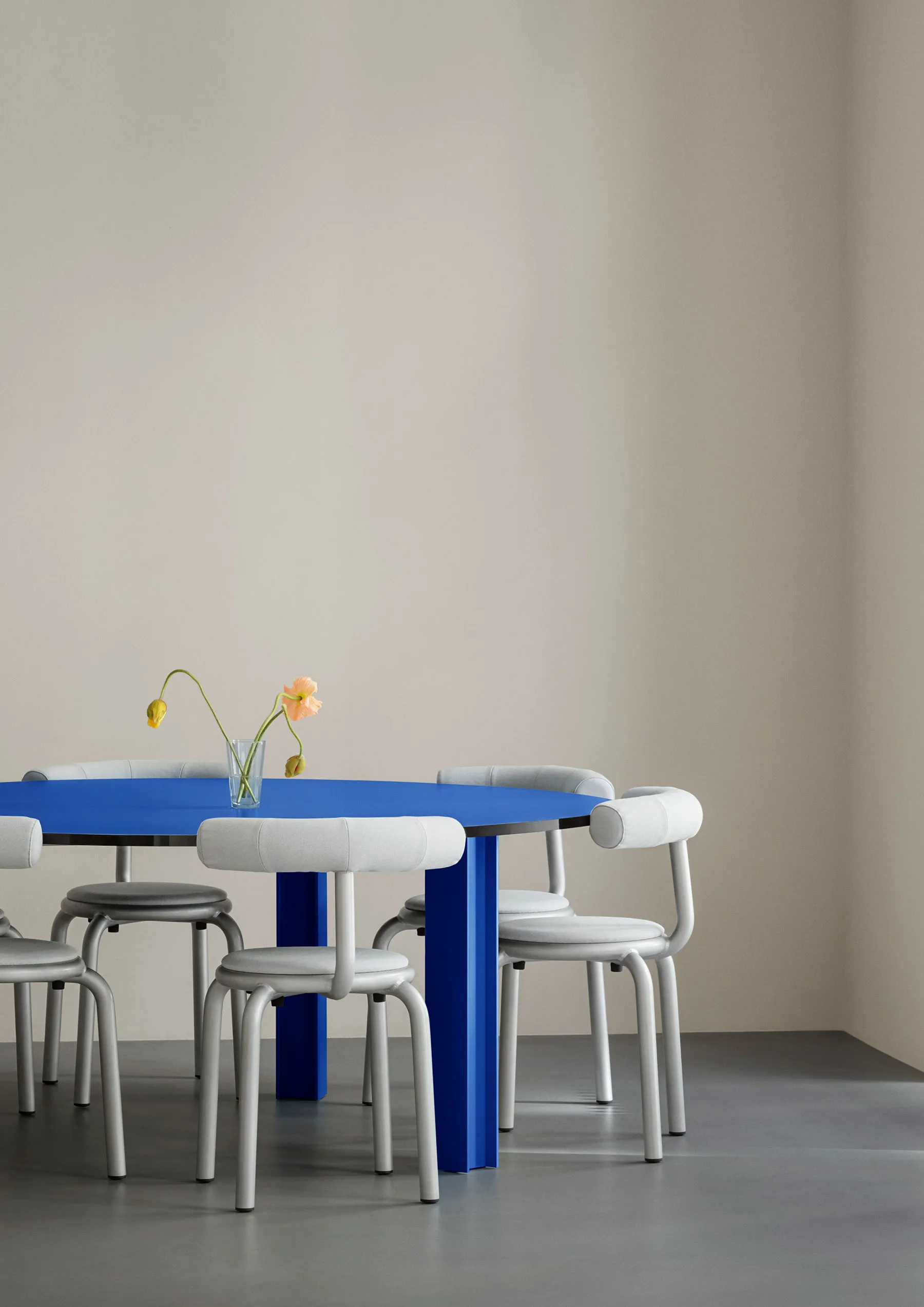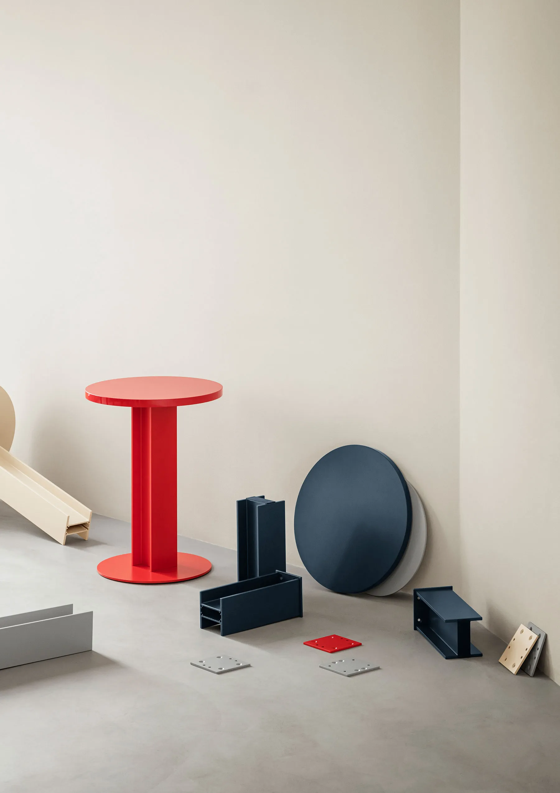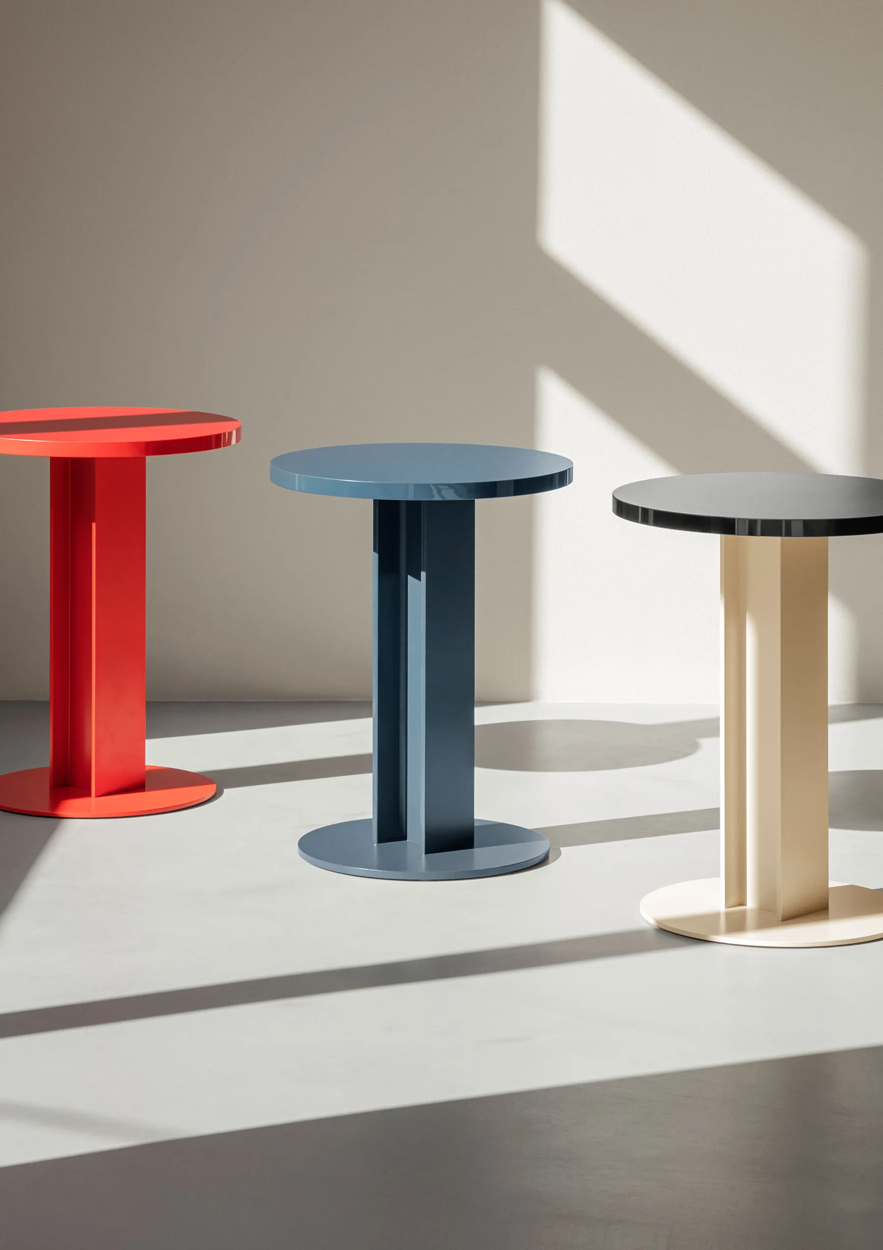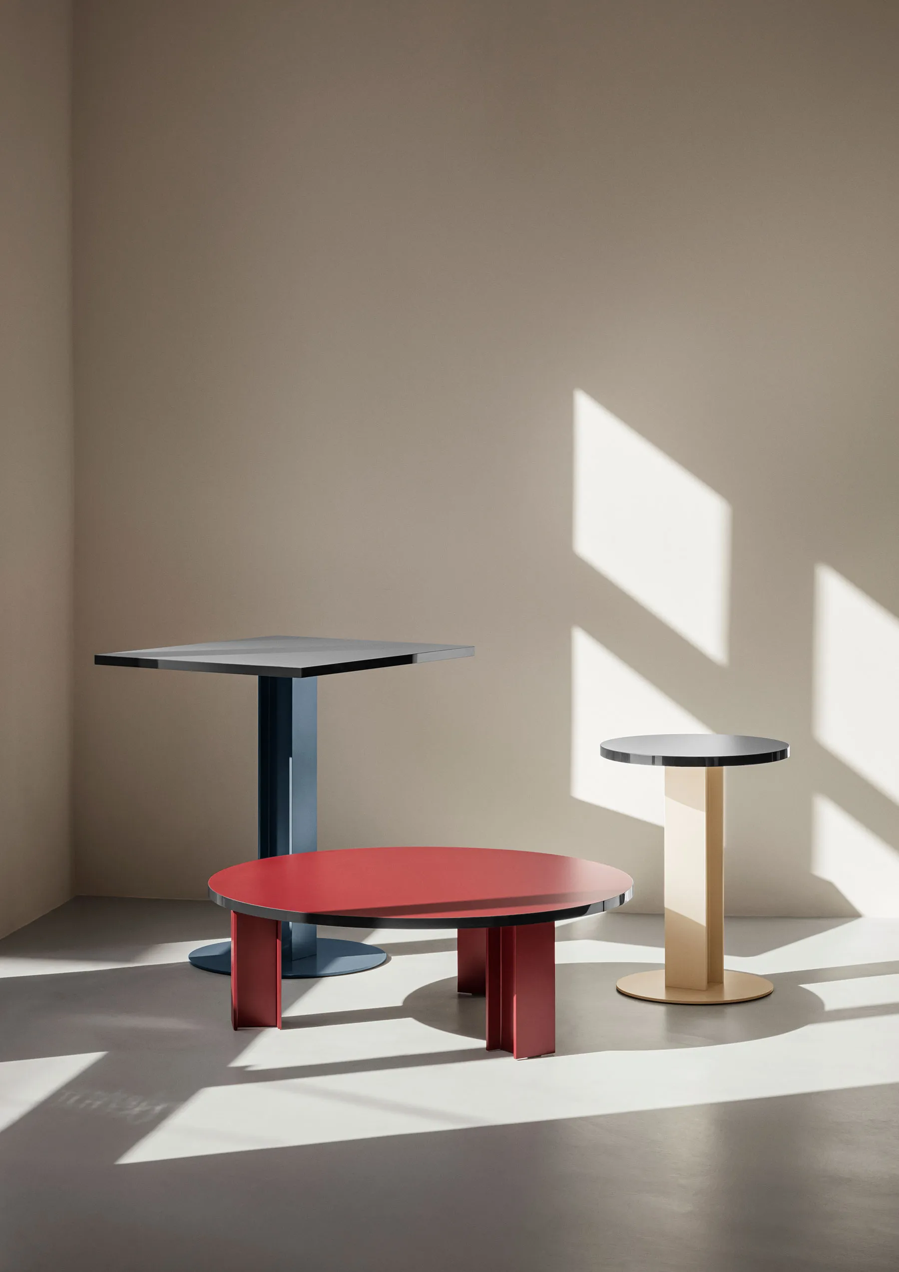 The tables are charming and grounding, acting as visual as well as social touchstones, with the ultimate purpose of encouraging people to gather around, and between them create a shared world. The striking interplay between the tables’ vertical and horizontal elements will help define any work or living space, while their sharp lines and elevated yet witty industrial character, ground them in our everyday.
