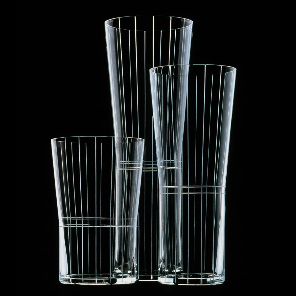 Slowfox are cylindrical vases and bowls with various sand-blasted patterns and glass graffiti. Tanteralla is a carafe for sherry or liqueur with a matching glass. Skyline is a series of vases of three heights, decorated with thin sanding cuts. Babusjka is a series of nesting bowls in four sizes for main dishes and desserts, made of sand-blasted and clear glass. With the little pitcher in the middle, the Babusjka series forms a flower to make a poetic whole.