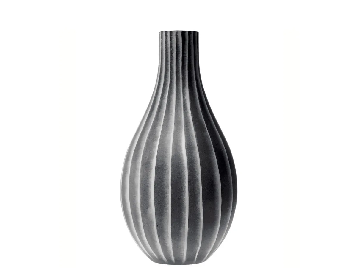 “It becomes an account of how I think and view form,” says Ingegerd Råman. “What’s entirely new is that I’ve worked with black glass – the opposite of transparent glass. Several original forms are reinterpreted in blue-black glass mass, where the glass’s glossy surface leaves the sand-engraved line with matte traces, like a fog mark in the black night.”