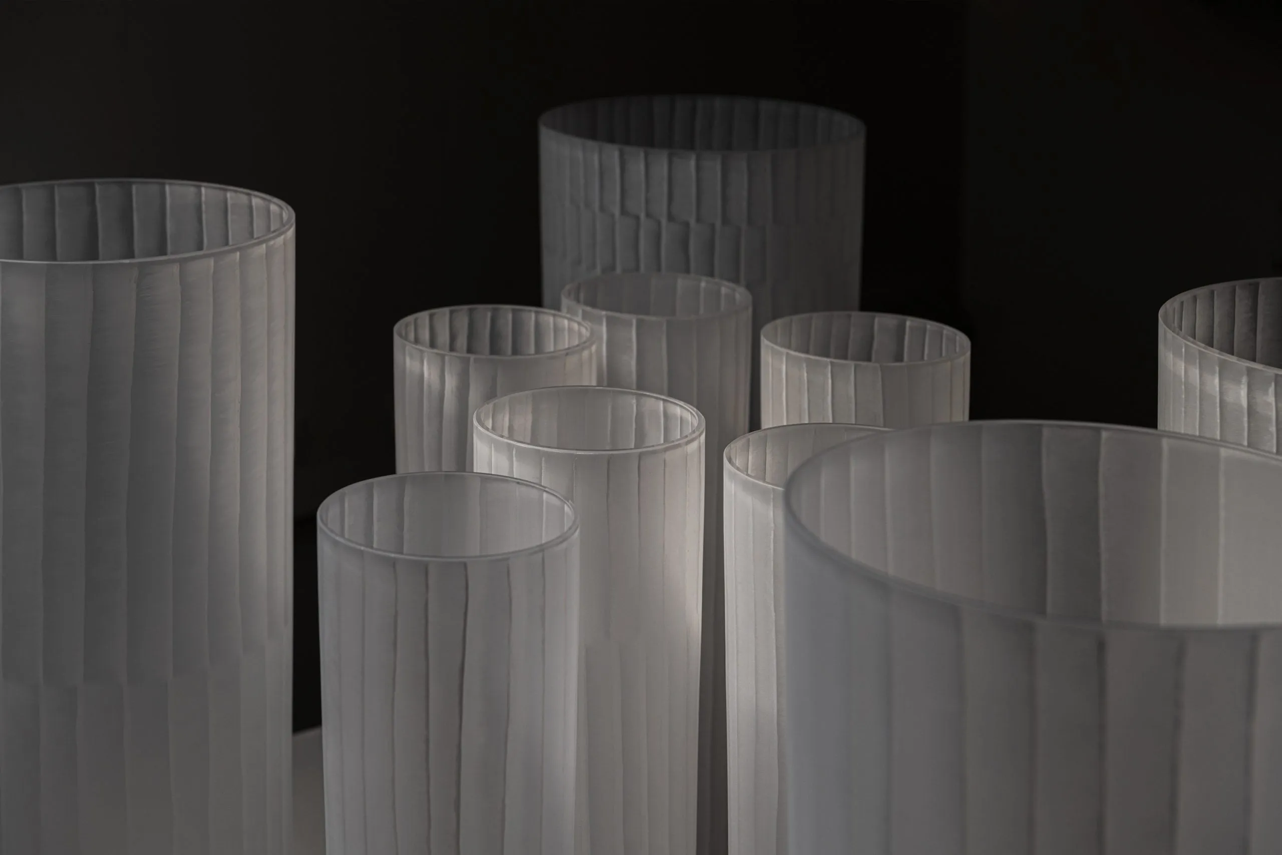 In the exhibition, precise relationships and positions rule. In this room, where nothing has been left to chance, it is the lines of the hand that on the glass draw the movements of life. Notable is that the unique glasses are only available during this particular exhibition. After the project, they return to the emptiness of the clear glass and become ready to be reborn in new contexts.