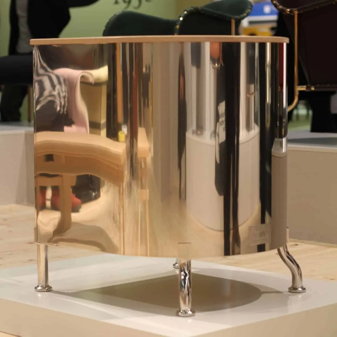 Electro polished stainless steel. Solid oak, nubuck leather.