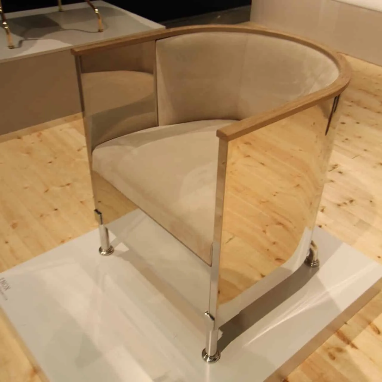The INOX armchair was designed in 2015 by Mats Theselius for Källemo. Made with high-polished stainless steel. Armrests in whitewashed oak. Seat in nubuck. Limited edition of 199 pieces.