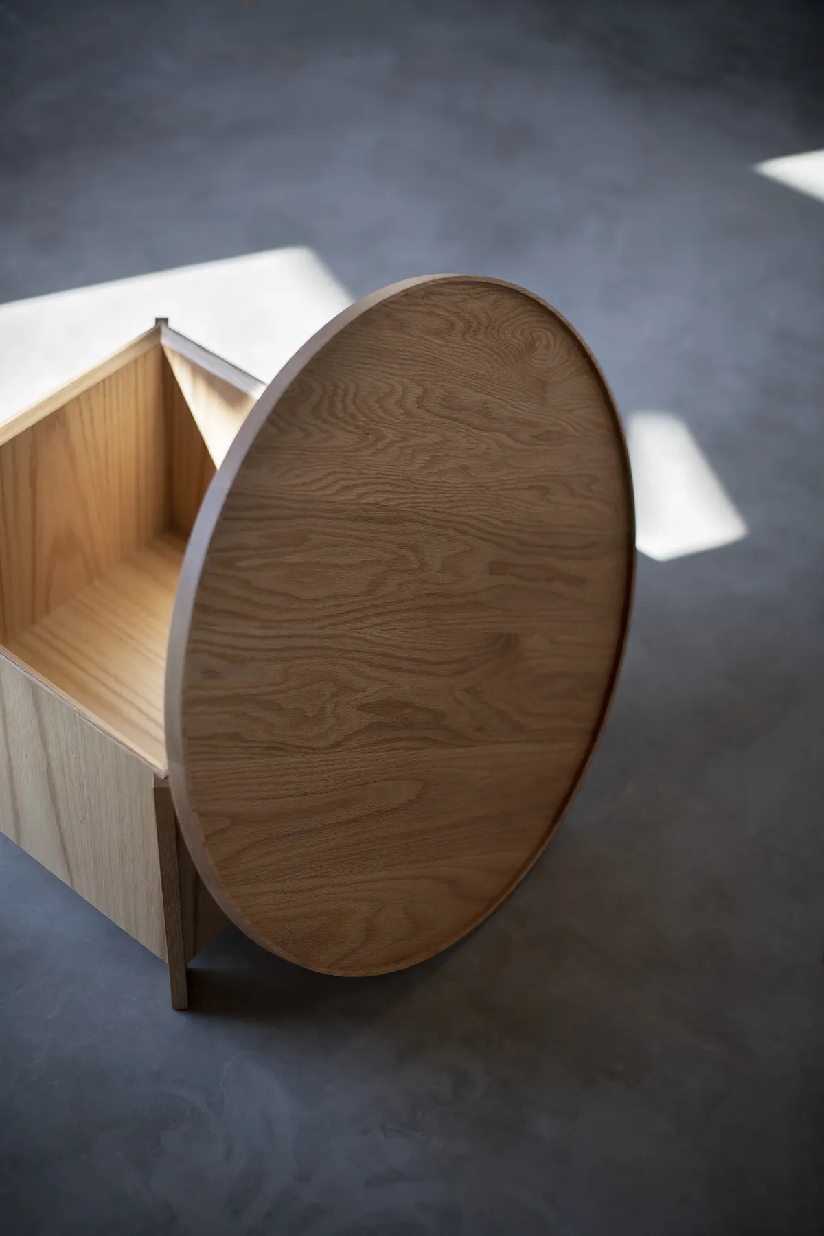 A fusion of Scandinavian and Japanese design approaches, the table comprises two distinct shapes – a rectangular box that serves as storage, edged by slightly convex battens that form the legs, lifting it just high enough above the ground to convey an impression of lightness and grace. On top, a circular tray with a delicate raised edge can be removed to provide access to the storage area beneath.