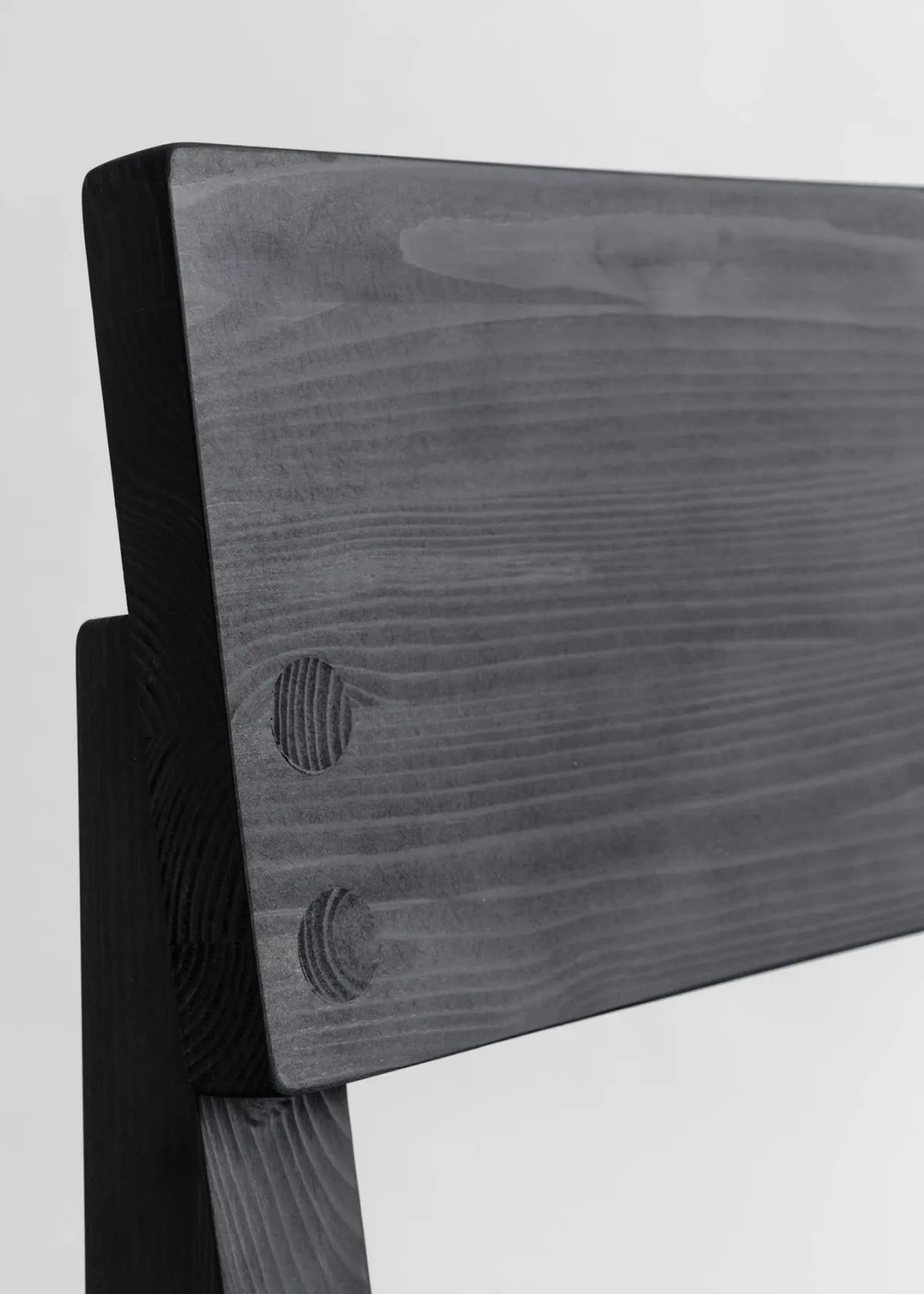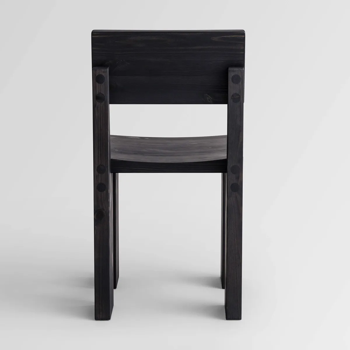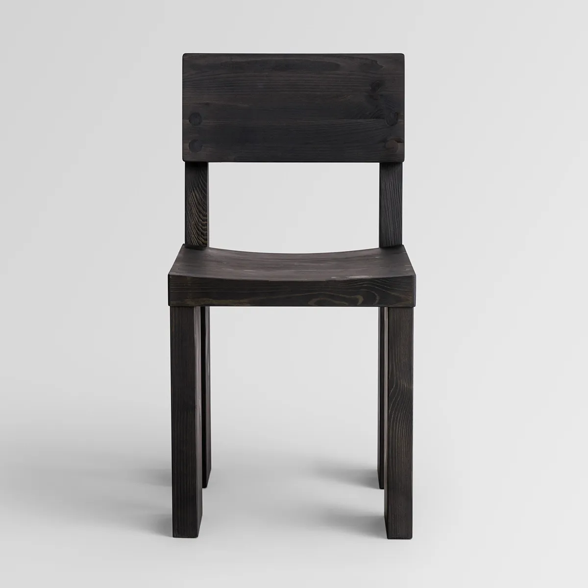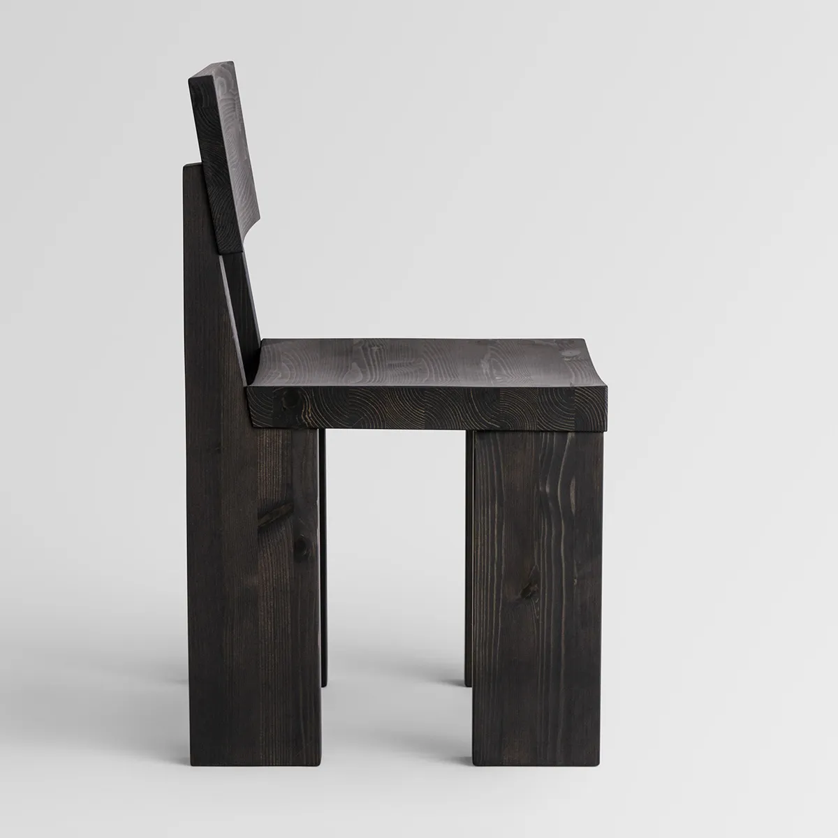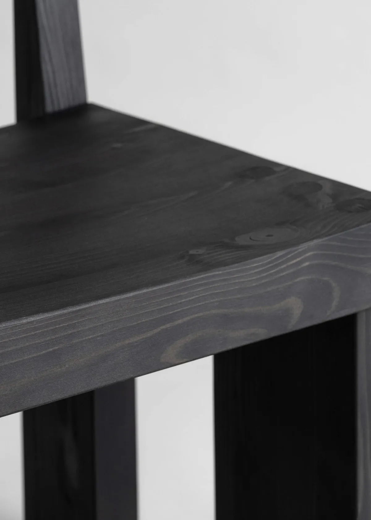 The 001 Dining Chair in Black features a deep black stain, unique to Vaarnii, through which pine’s distinctive grain remains pleasingly visible.
