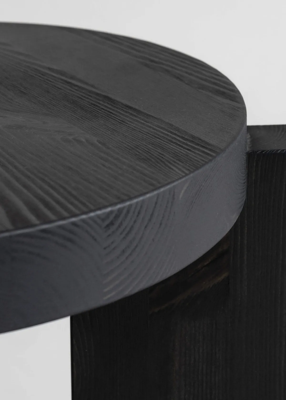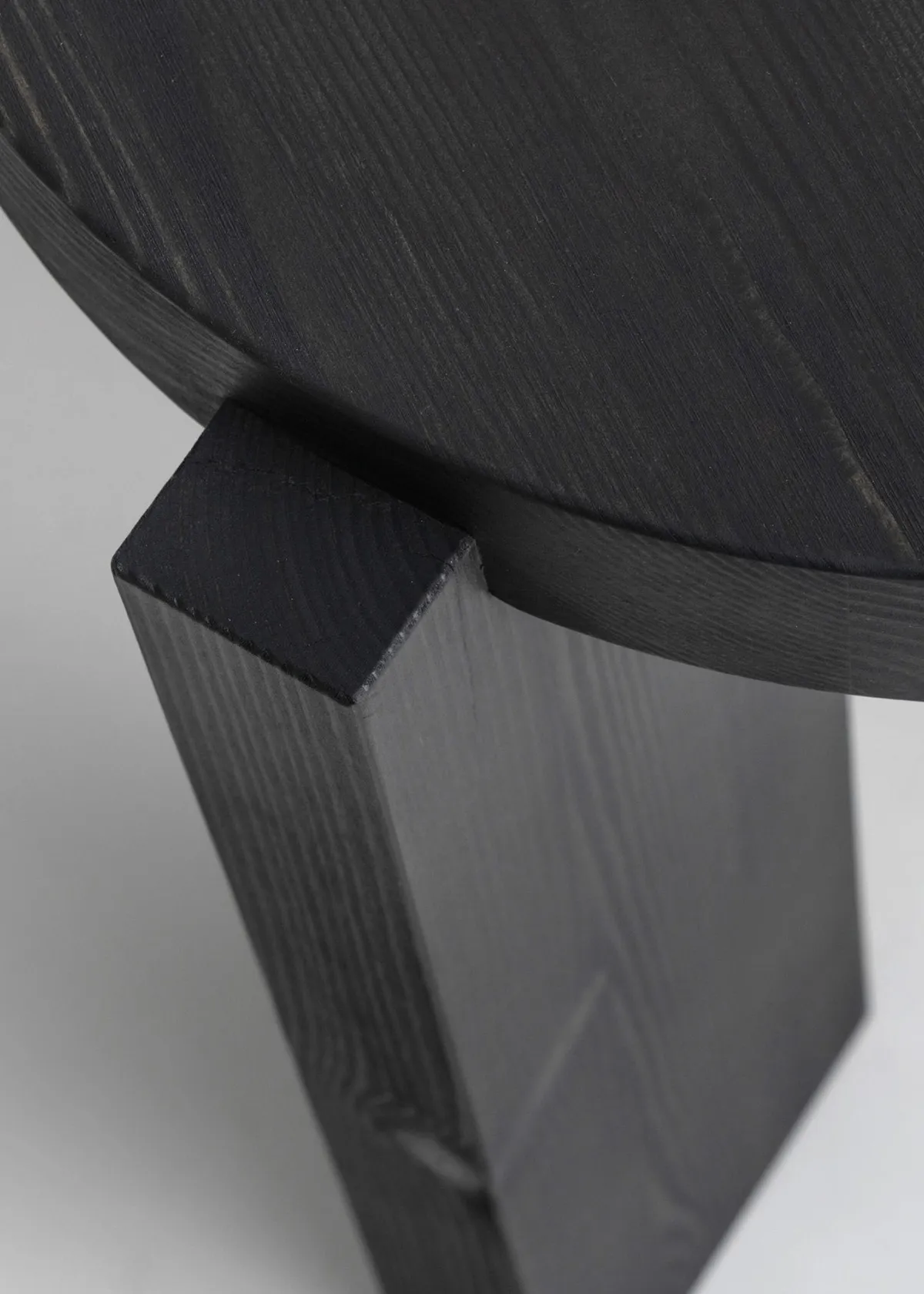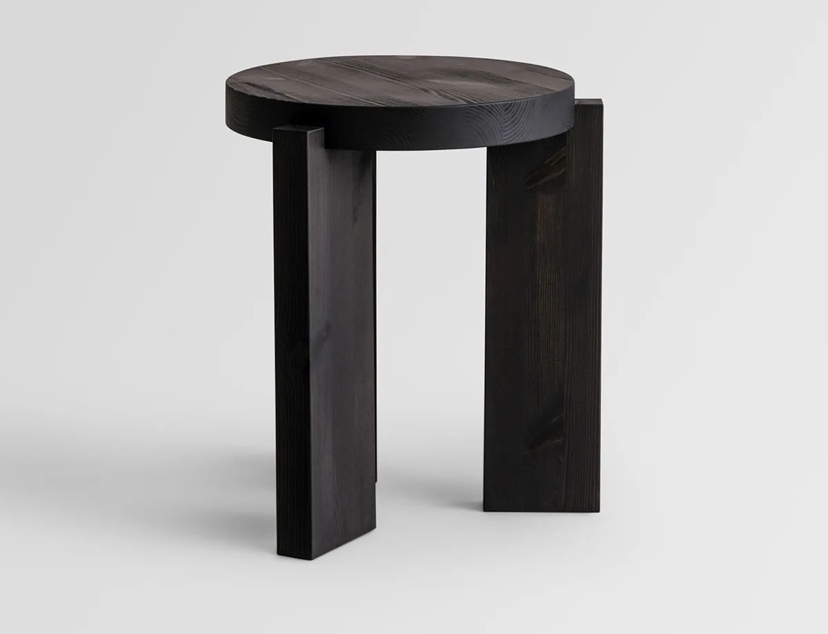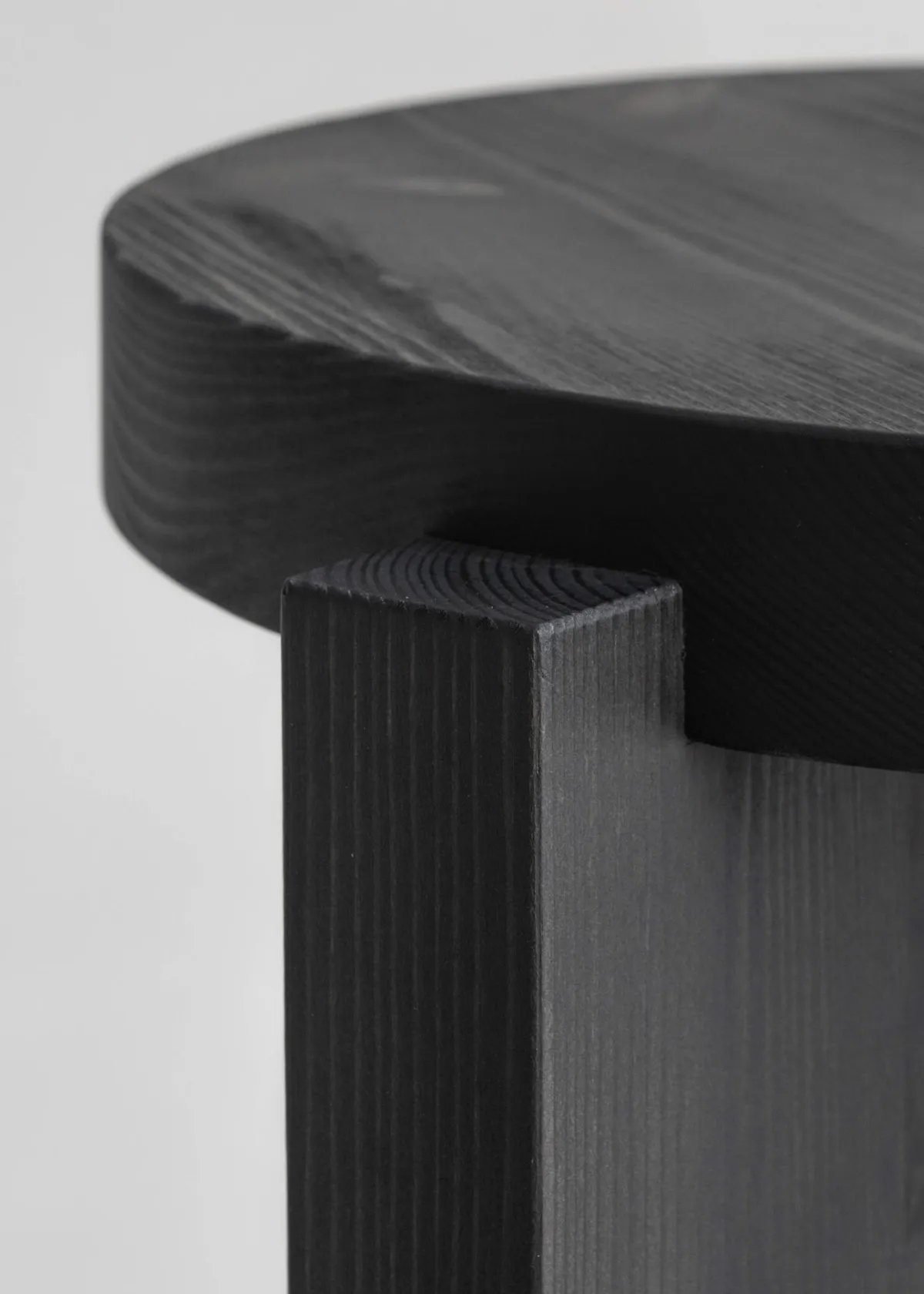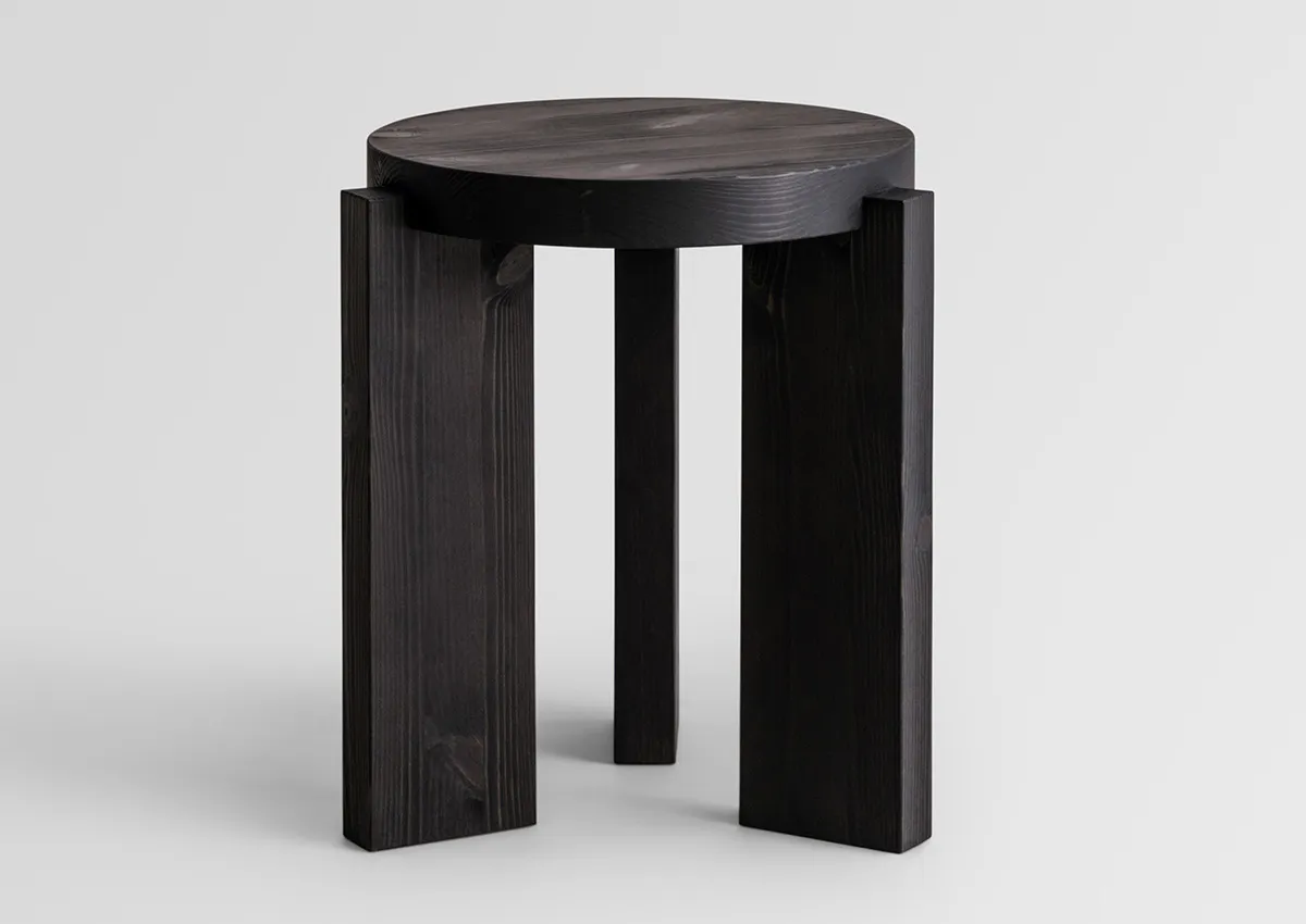 The 001 Stool in Black features a deep black stain, unique to Vaarnii, through which pine’s distinctive grain remains pleasingly visible.