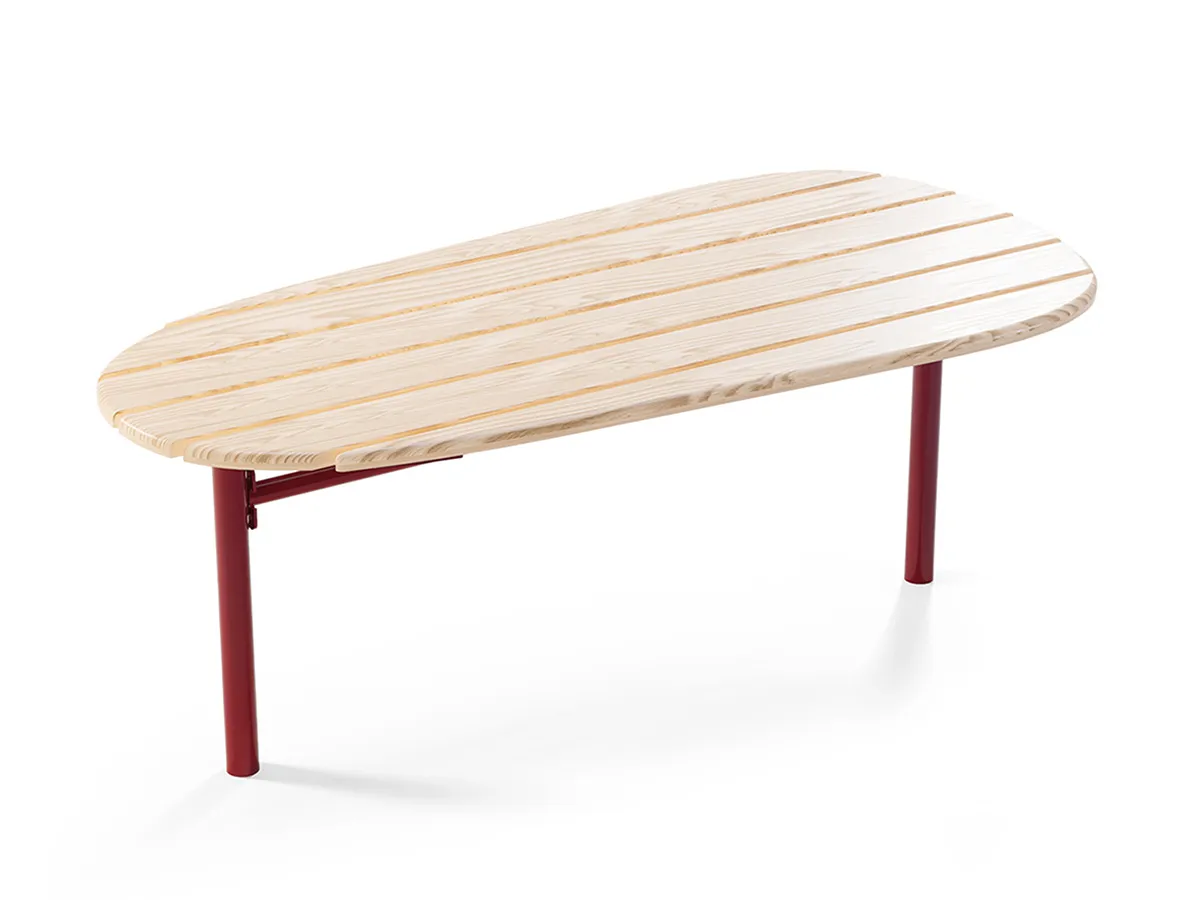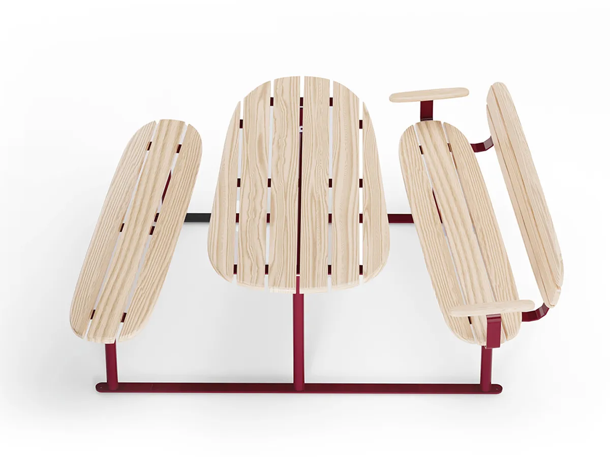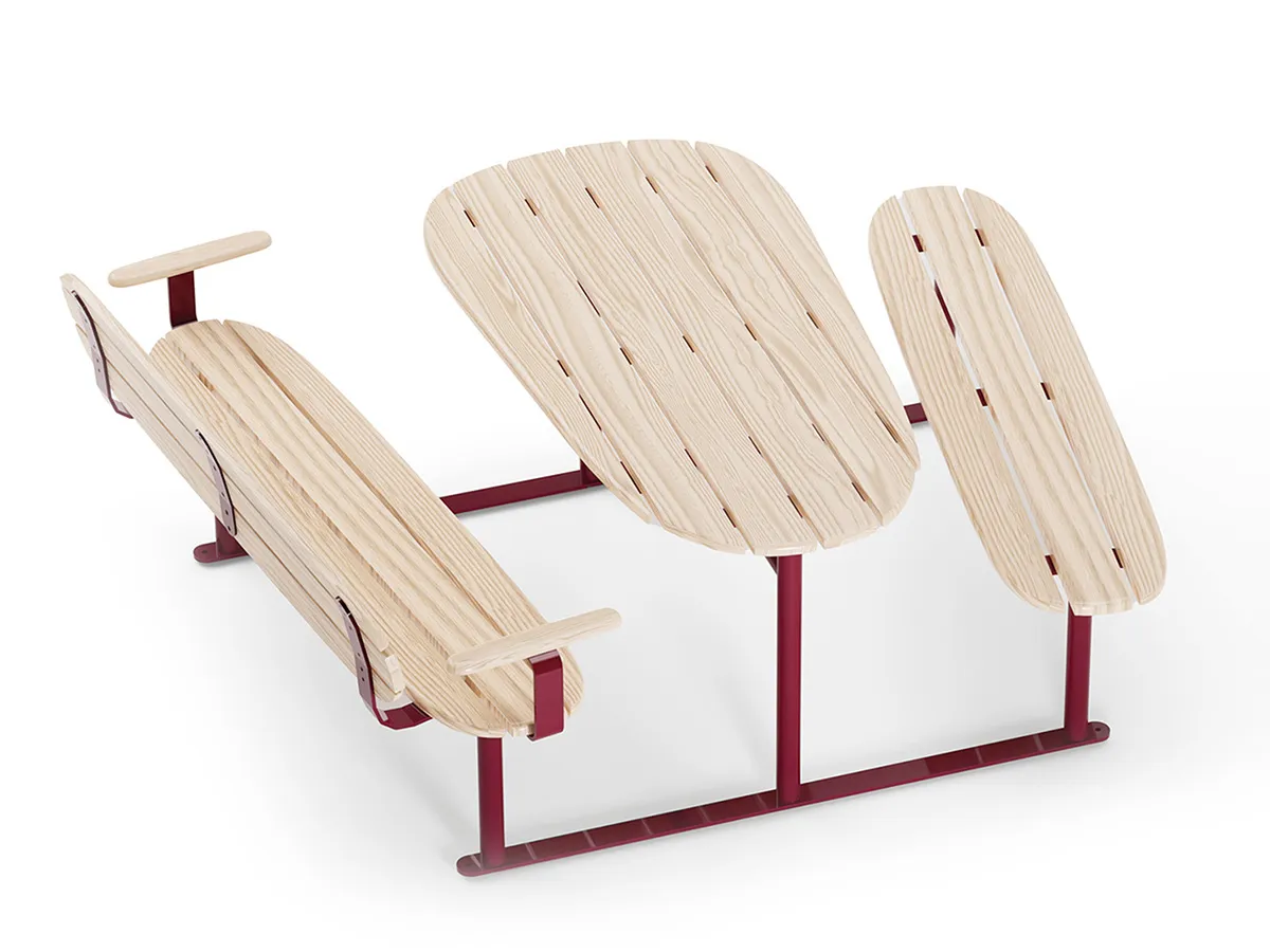 The furniture is crafted from wood and hot-dip galvanized steel and can be purchased individually, with or without armrests on the sofa and bench, as well as in groups. The pieces are cast or bolted to the ground.