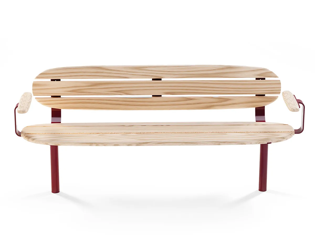 Kajen park bench Designed by Thomas Bernstrand Conventional wooden slats form the seat and backrest …