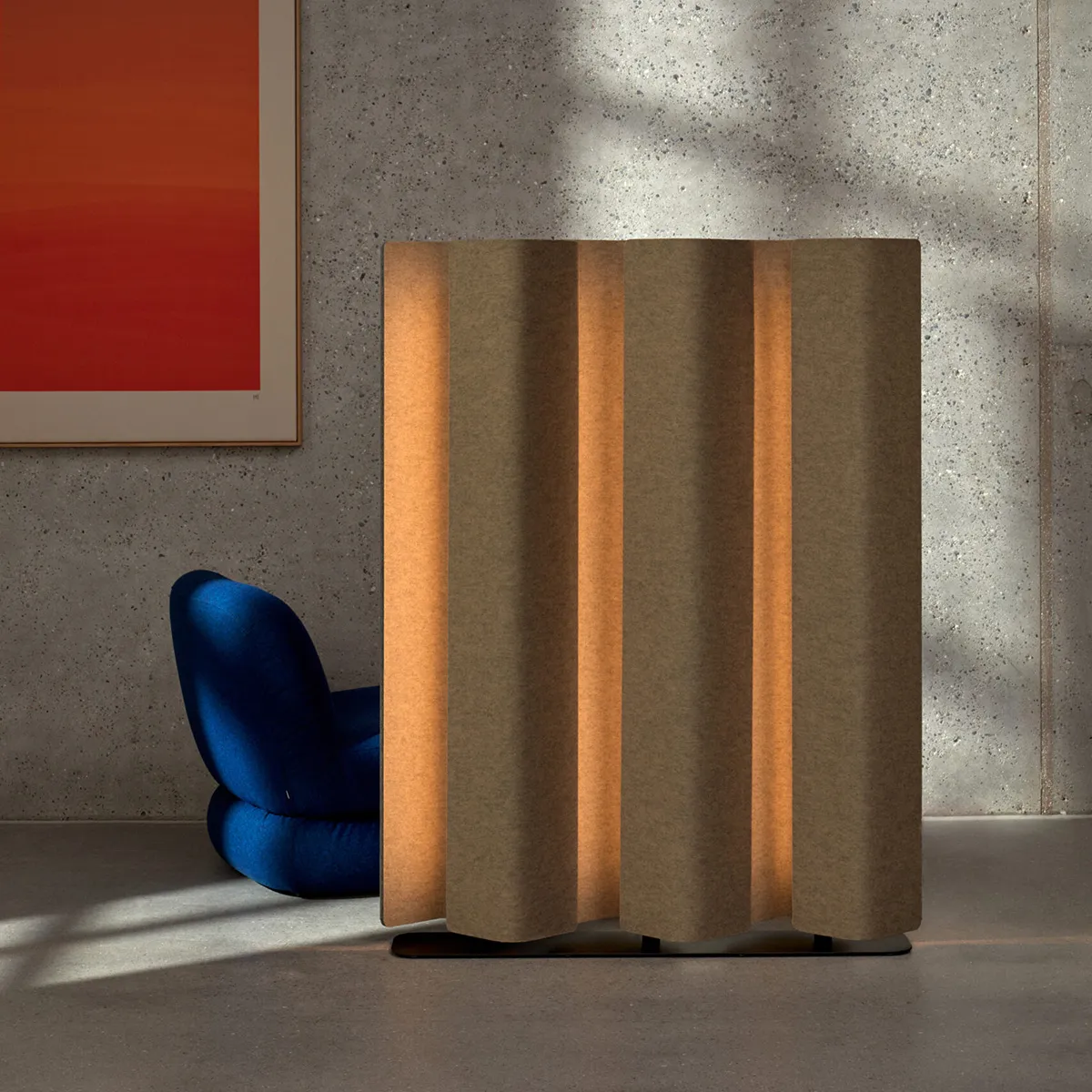 In collaboration with designer Khodi Feiz, Abstracta takes a new approach to acoustic lighting — one that aims to create a peaceful atmosphere. The result is Vika, a sculptural floor screen that radiates atmospheric light while managing both low-frequency and high-frequency noise. “It’s another way of thinking about sound and light,” says Feiz.