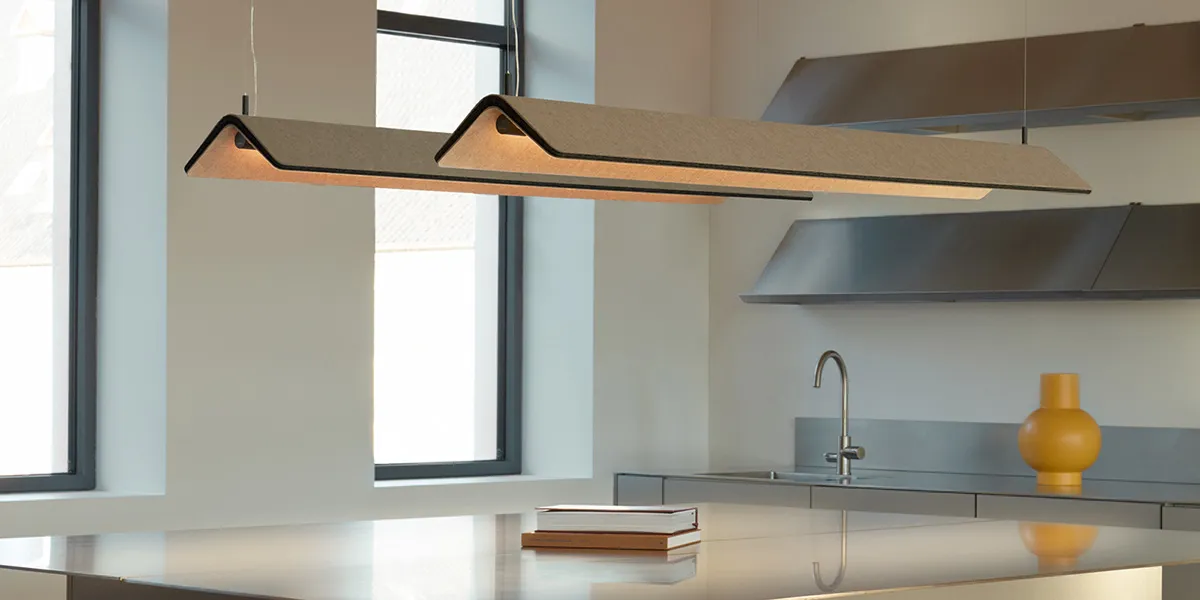 A clever thing about Vika is that both the floor screens and the ceiling luminaire are designed to be close to those in the room who are its sound sources. This stops sound waves before they can bounce off the walls and ceiling.