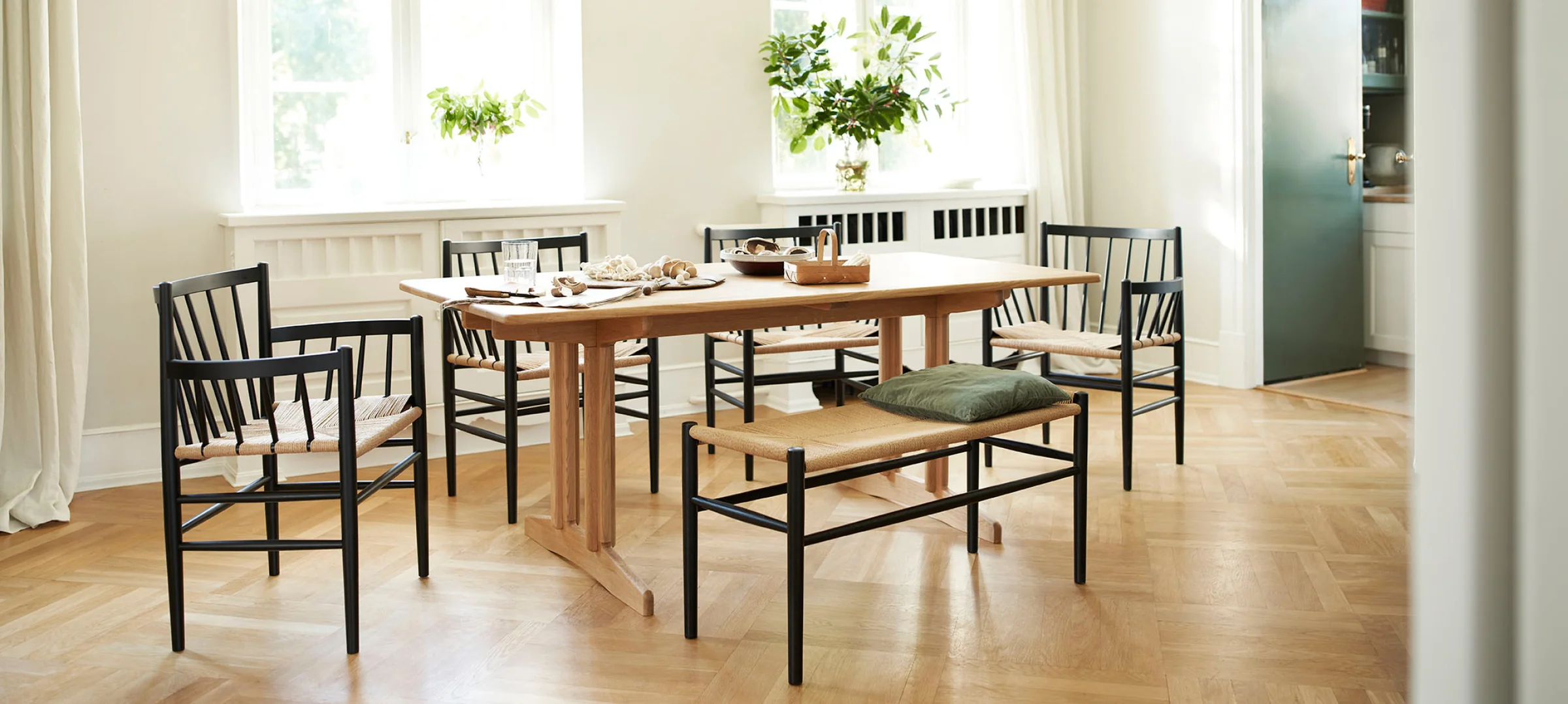 Bækmark joined FDB Møbler in 1958 and served as design director for nine years. During that period he shaped much of the manufacturer’s output, and the J80 series stands as one of its most enduring results. The construction is straightforward: solid wood frames, paper cord weaving, and a proportional honesty that has kept the chairs relevant across successive interiors.