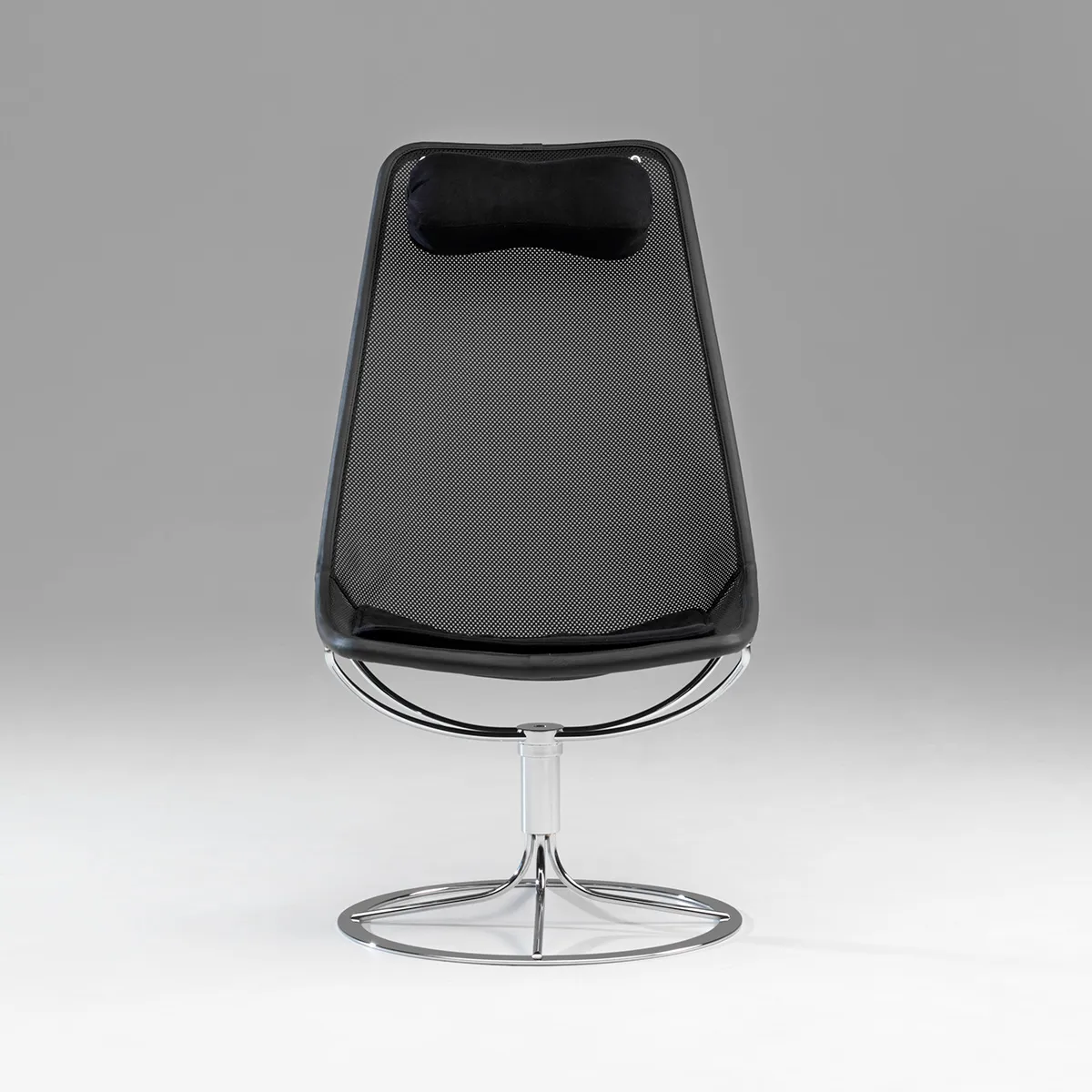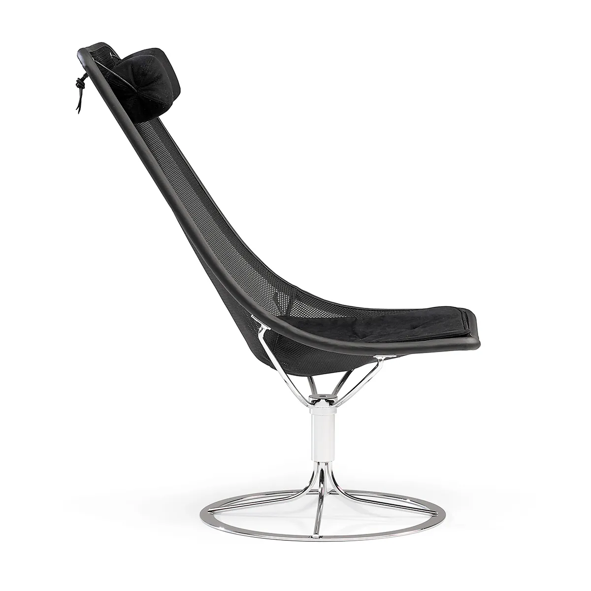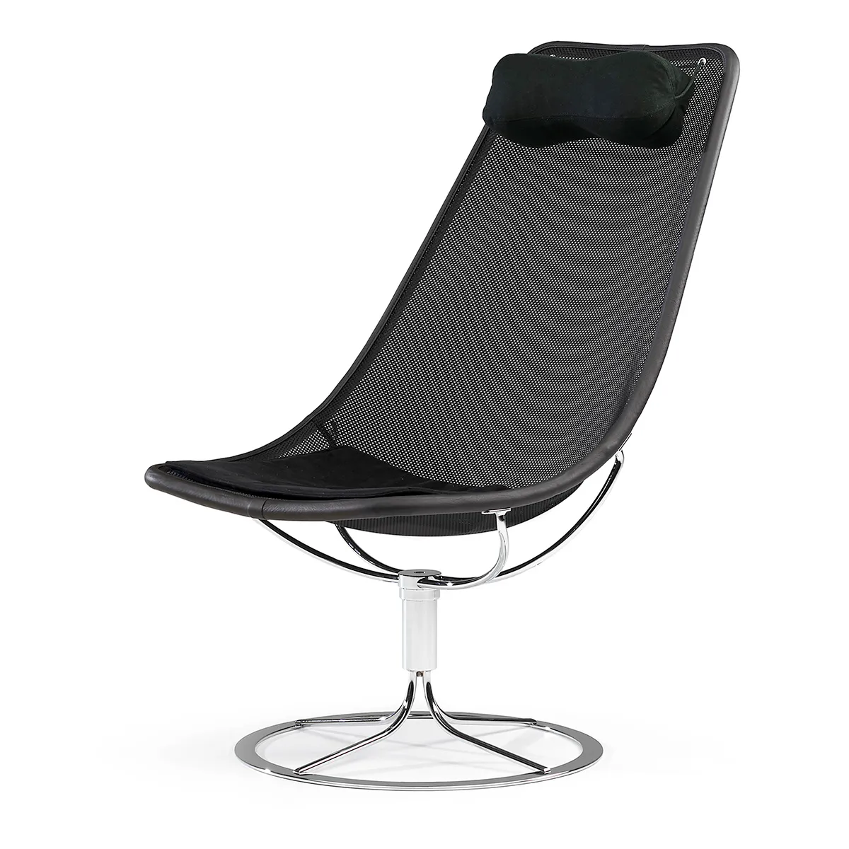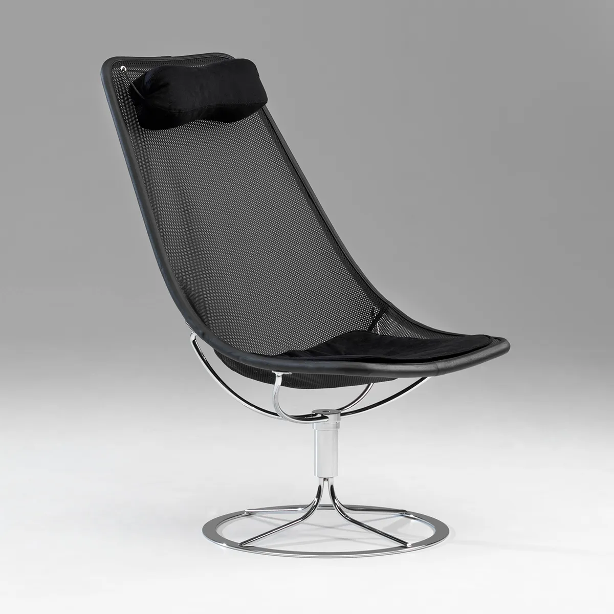 In 1965, inspired by the dawning space age, Bruno Mathsson designed the sculptural futuristic looking easychair Jetson for which he developed a new solution of using a frame with the supporting textiles forming the seat. Bruno Mathsson experimented with many materials available at that time but many such as net failed to meet the technical requirements the design demanded.