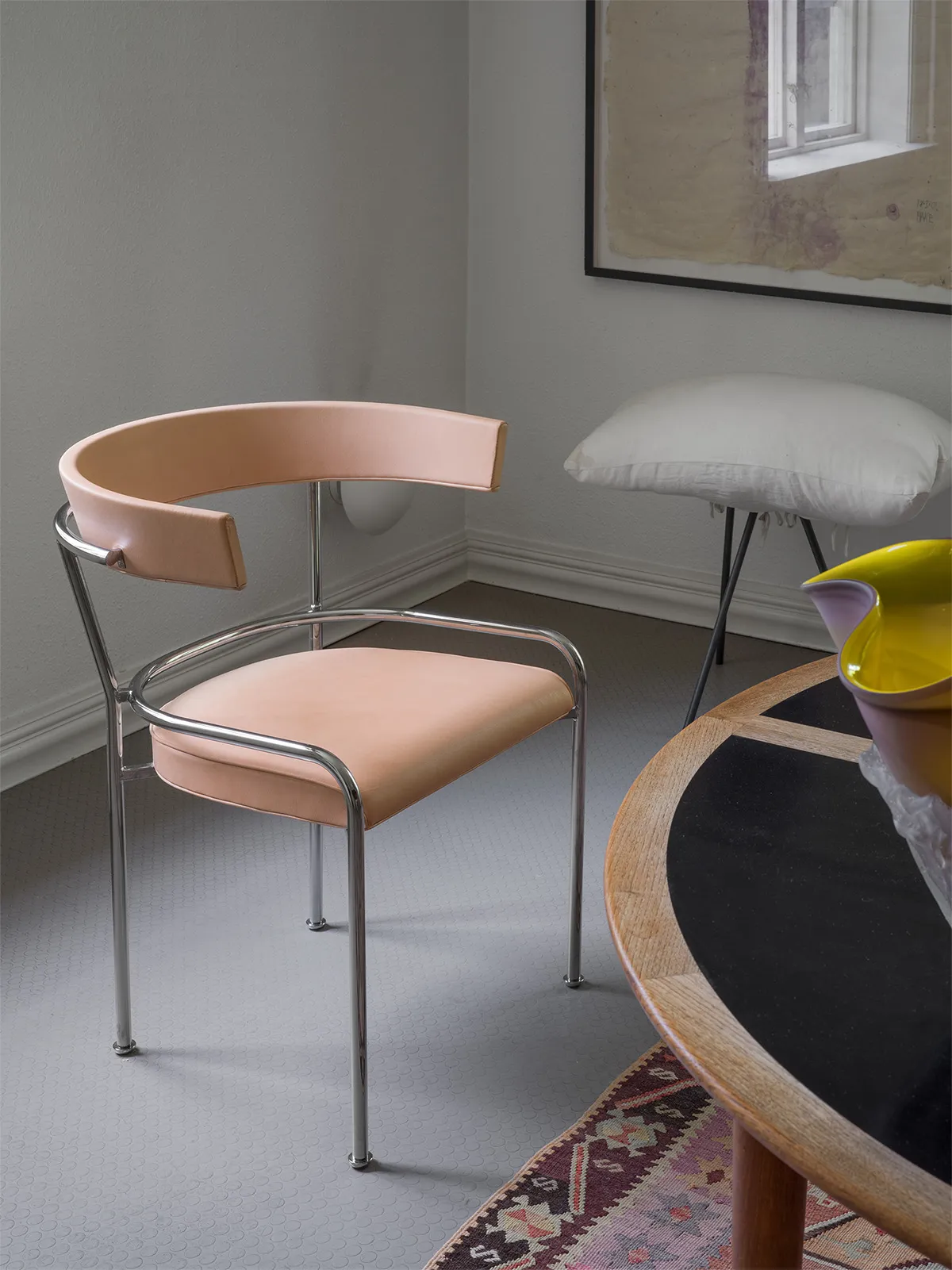 The seating furniture for the mentioned boardroom – a chair and an armchair – are worth highlighting for other reasons as well. They were created immediately after the significant Stockholm Exhibition of 1930, for which Asplund was responsible. He had been appointed as the exhibition’s chief architect following the Stockholm Public Library project, a classically inspired building that received criticism from modernist-oriented colleagues. With the exhibition, he faced criticism from another direction, but this time for being too modern. The same year he worked on the furniture, the modernist manifesto *acceptera* was published, one of the few Swedish architectural theoretical writings that has attracted significant international interest. It was a collective work, but according to some testimonies, Asplund was the leading force. Among the five authors was also the younger Uno Åhrén (1897–1977), who three years earlier had criticized the public library for being outdated. The furniture for the Swedish Society of Crafts and Design is thus part of a kind of turning point, a changed stance by Asplund in relation to his time. He now used steel tube constructions, but less radically than the modernist pioneers. The chair still retains its traditional arm, albeit fixed in a steel frame, and the armchair maintains the rounded club shape, though supported by gently curved metal legs.