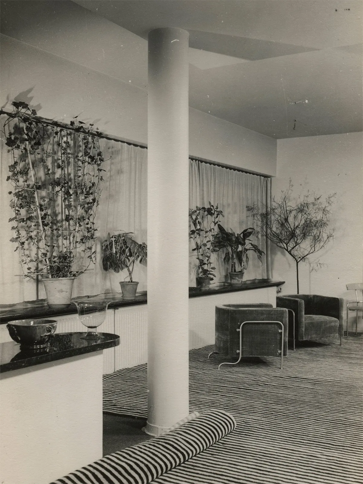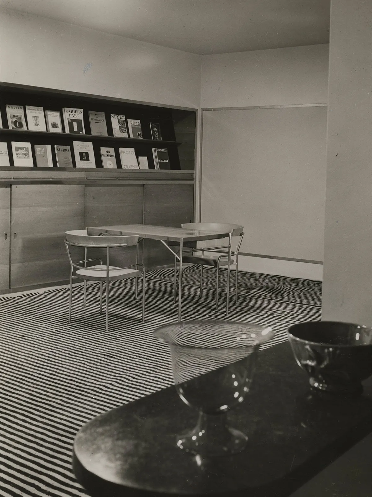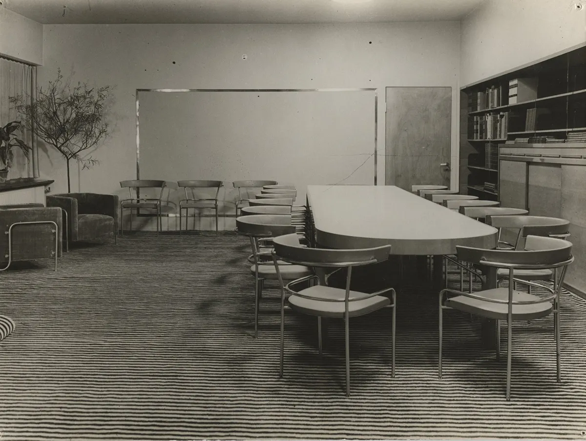 The seating furniture for the mentioned boardroom – a chair and an armchair – are worth highlighting for other reasons as well. They were created immediately after the significant Stockholm Exhibition of 1930, for which Asplund was responsible. He had been appointed as the exhibition’s chief architect following the Stockholm Public Library project, a classically inspired building that received criticism from modernist-oriented colleagues. With the exhibition, he faced criticism from another direction, but this time for being too modern. The same year he worked on the furniture, the modernist manifesto *acceptera* was published, one of the few Swedish architectural theoretical writings that has attracted significant international interest. It was a collective work, but according to some testimonies, Asplund was the leading force. Among the five authors was also the younger Uno Åhrén (1897–1977), who three years earlier had criticized the public library for being outdated. The furniture for the Swedish Society of Crafts and Design is thus part of a kind of turning point, a changed stance by Asplund in relation to his time. He now used steel tube constructions, but less radically than the modernist pioneers. The chair still retains its traditional arm, albeit fixed in a steel frame, and the armchair maintains the rounded club shape, though supported by gently curved metal legs.