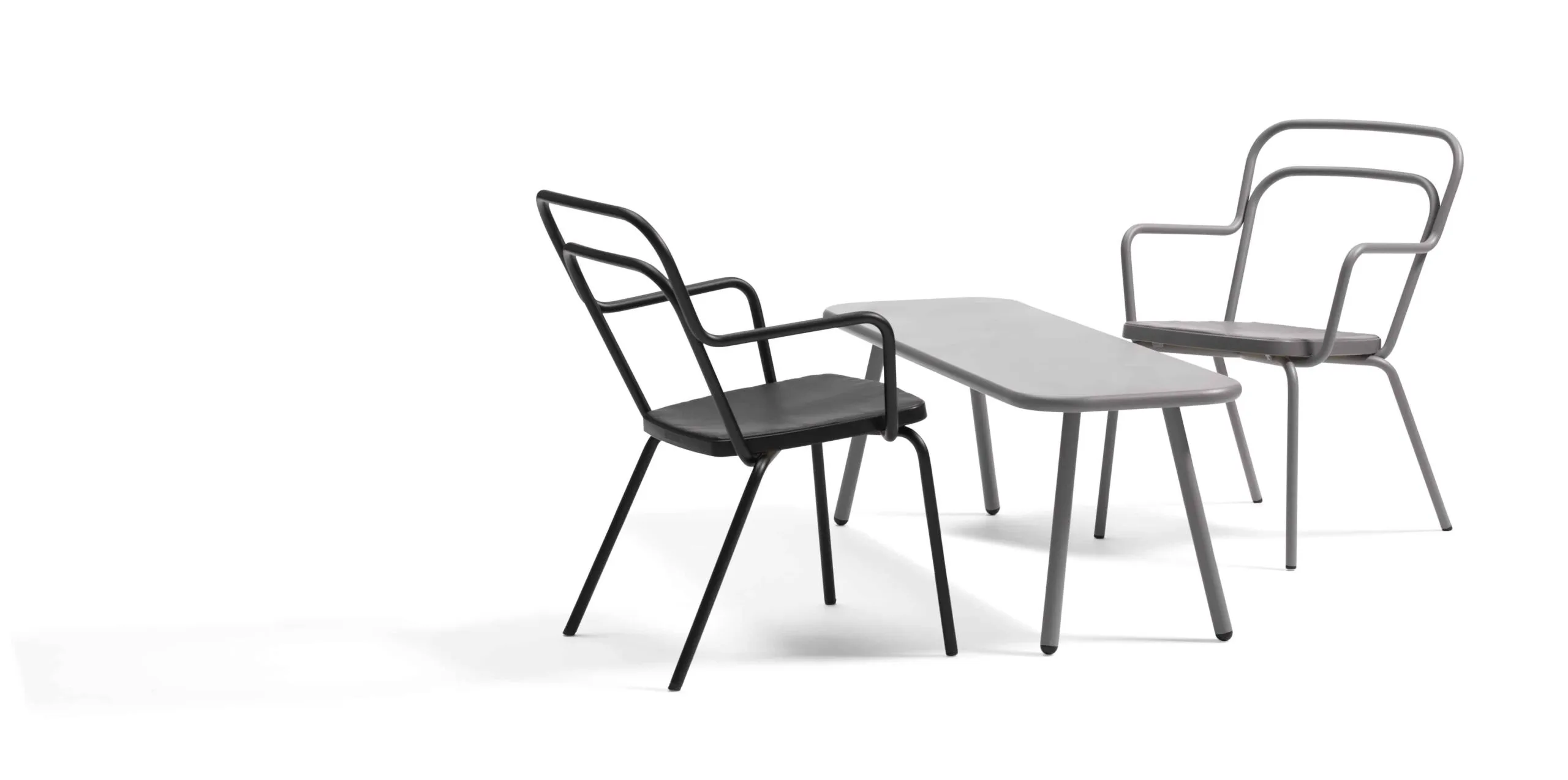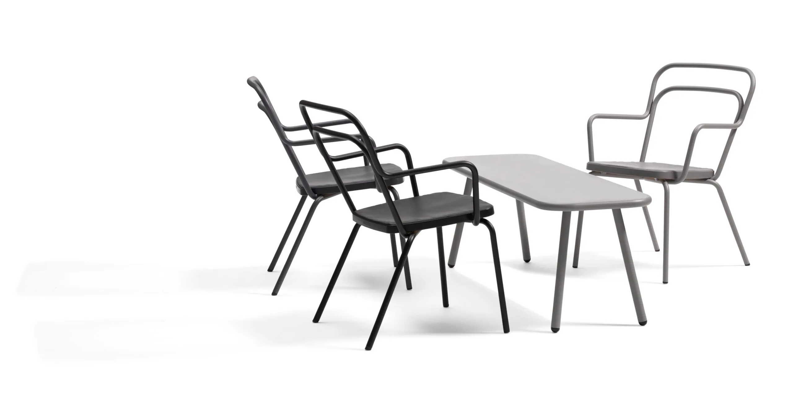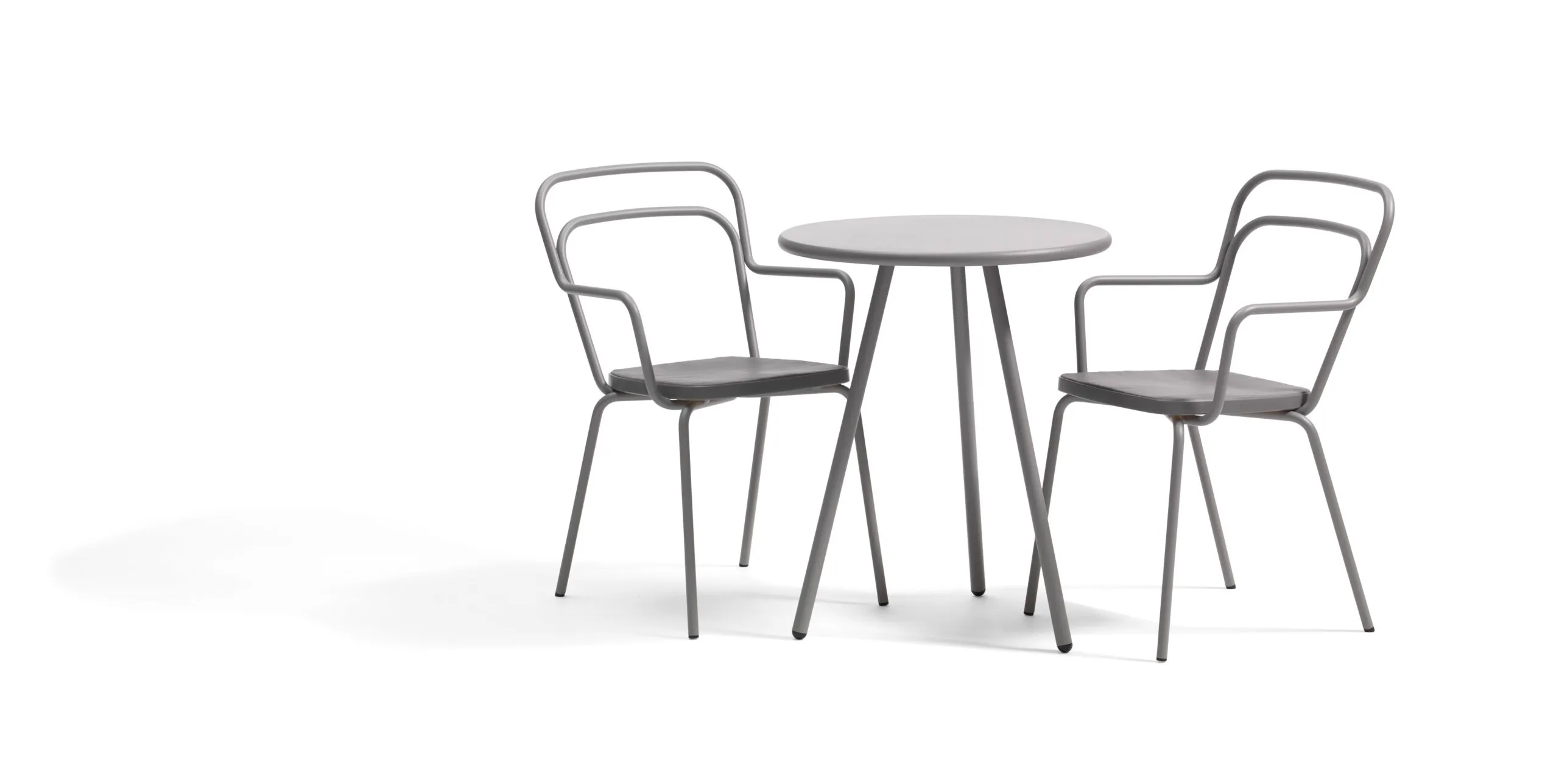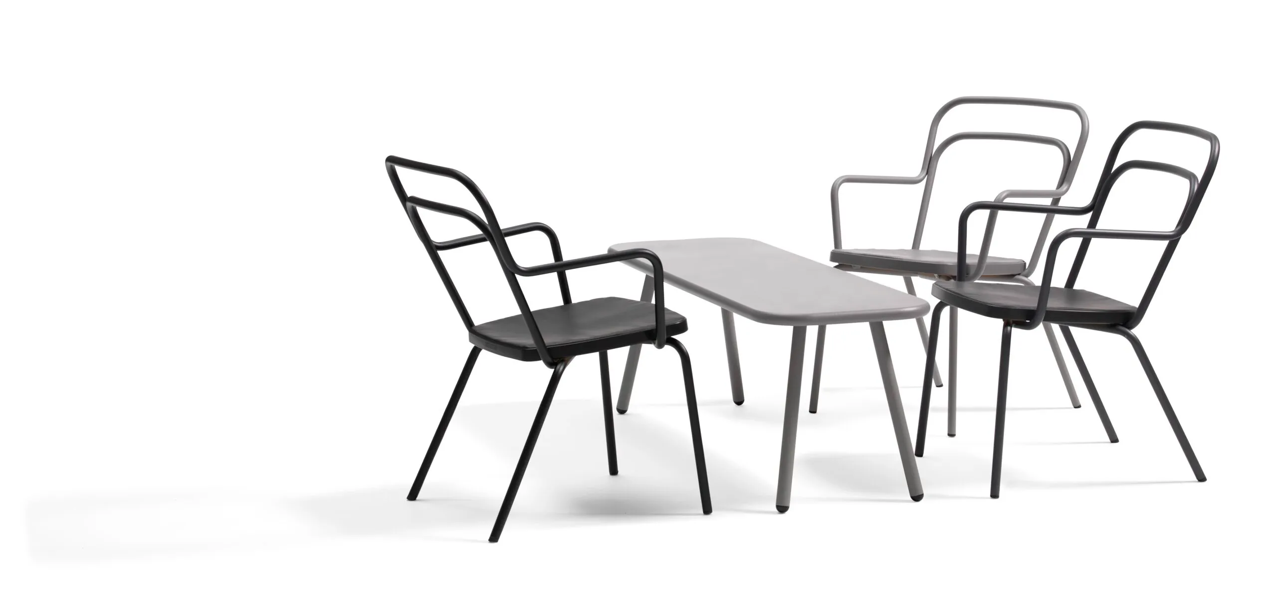 The Kaffe family is equally at home indoors and outdoors. It is built to withstand outdoor environments that demand a great deal in terms of durability, but is also an ideal choice indoors. The “well-used” look of the seat creates a cosy, comfortable impression. Design-wise, Kaffe is a more formal take on the classic café chair; its straightforward, elemental lines are matched by the naturalness of the colours – light grey, grey and black.