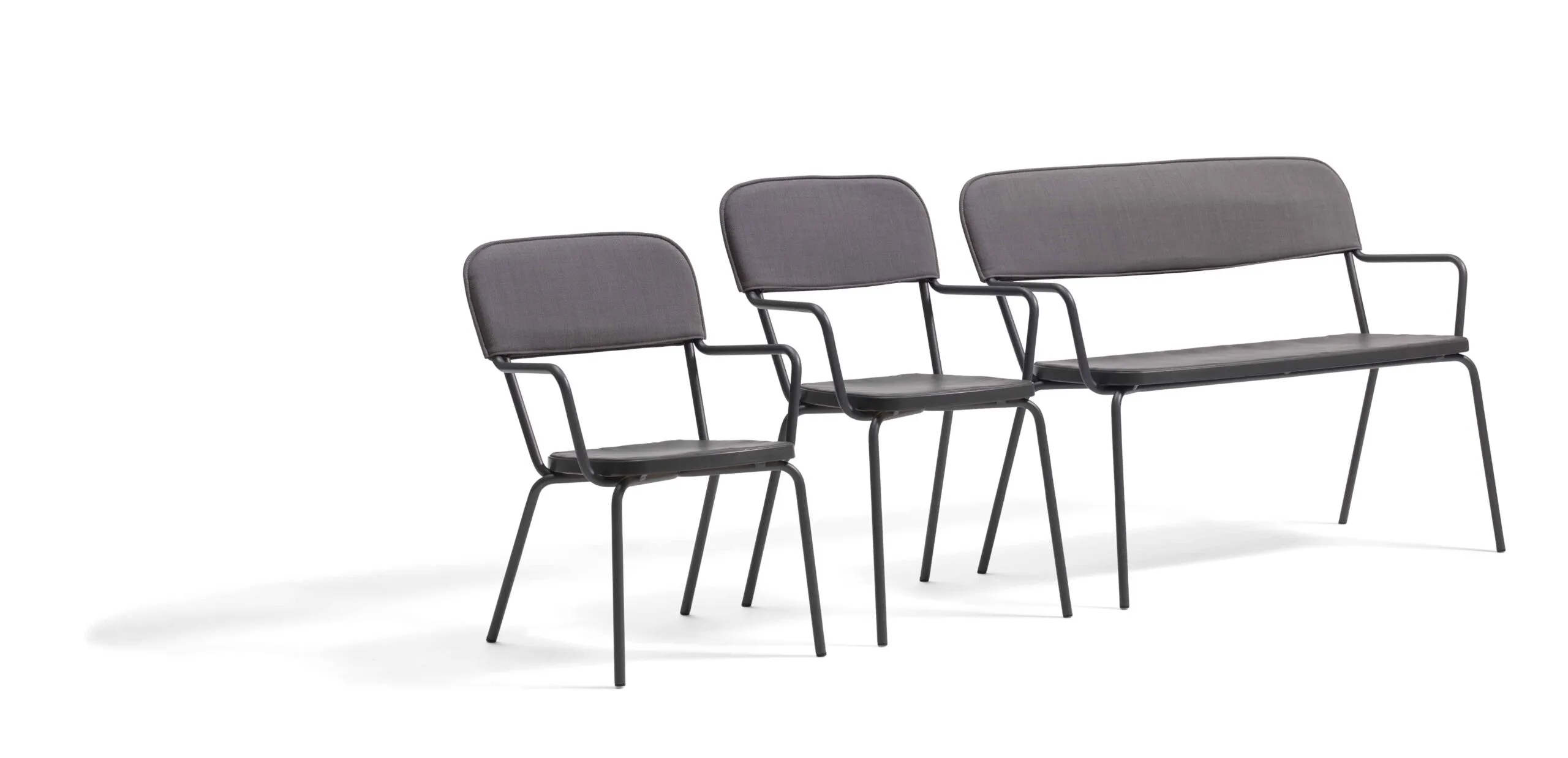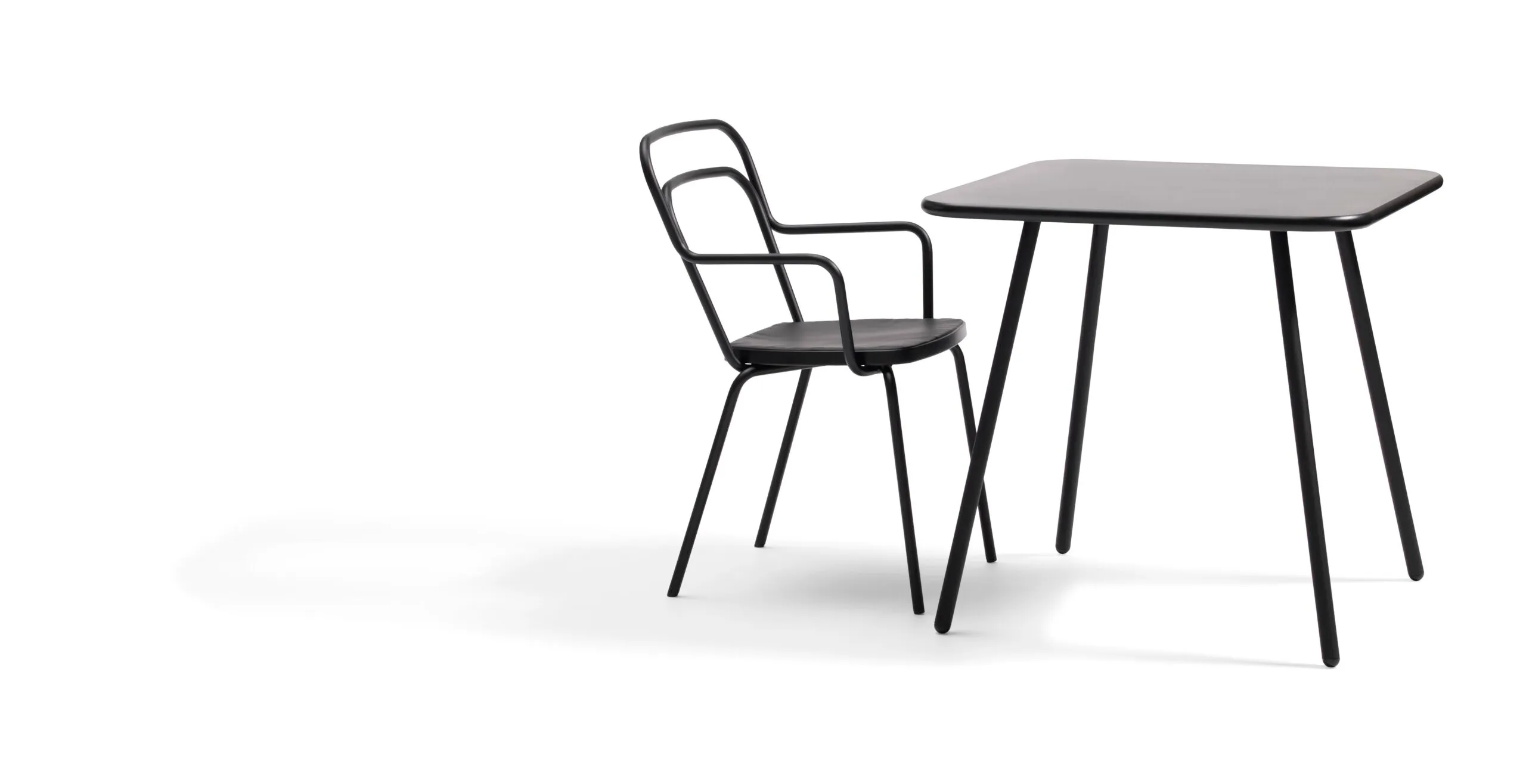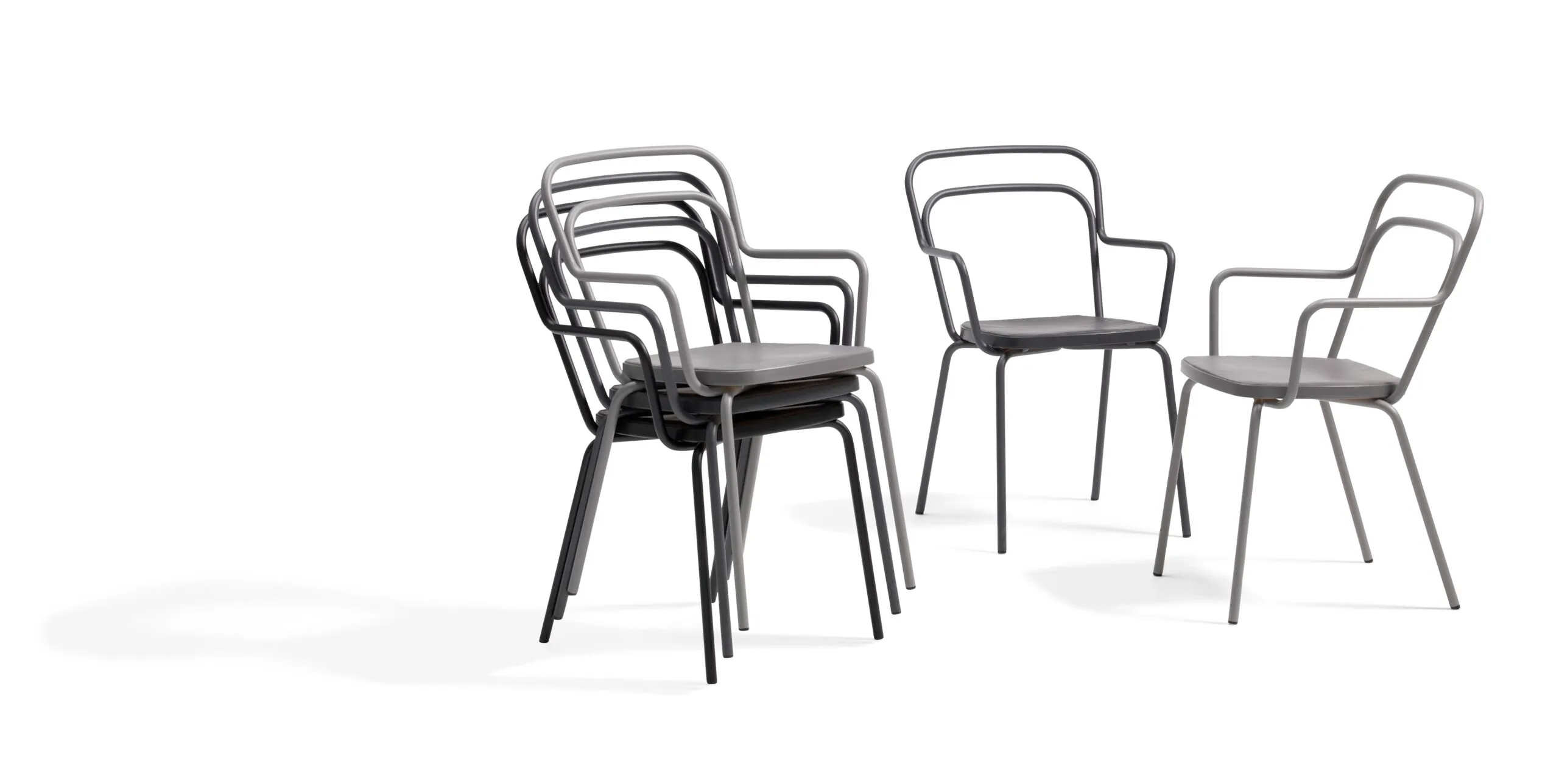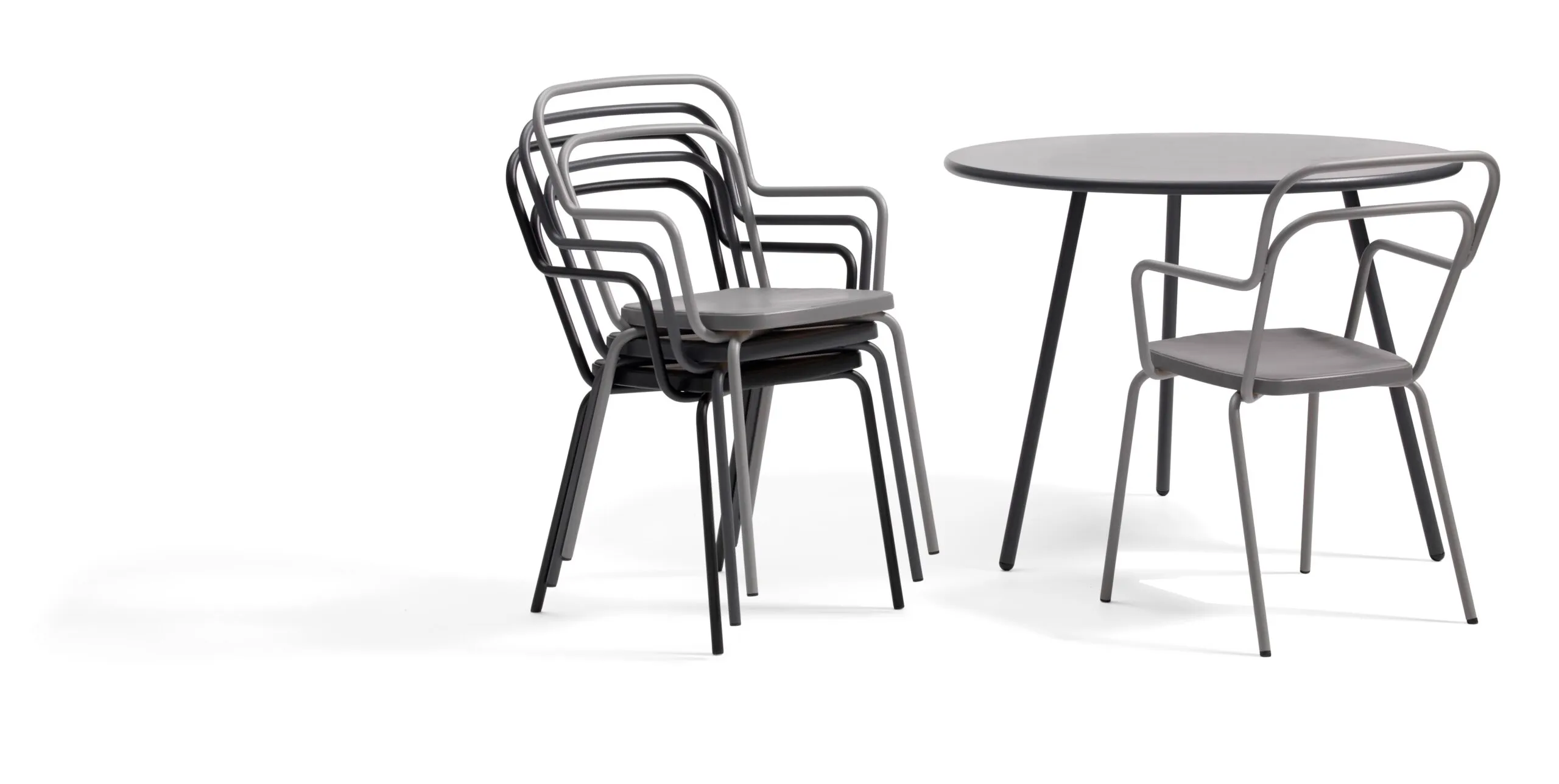 The Kaffe family is equally at home indoors and outdoors. It is built to withstand outdoor environments that demand a great deal in terms of durability, but is also an ideal choice indoors. The “well-used” look of the seat creates a cosy, comfortable impression. Design-wise, Kaffe is a more formal take on the classic café chair; its straightforward, elemental lines are matched by the naturalness of the colours – light grey, grey and black.