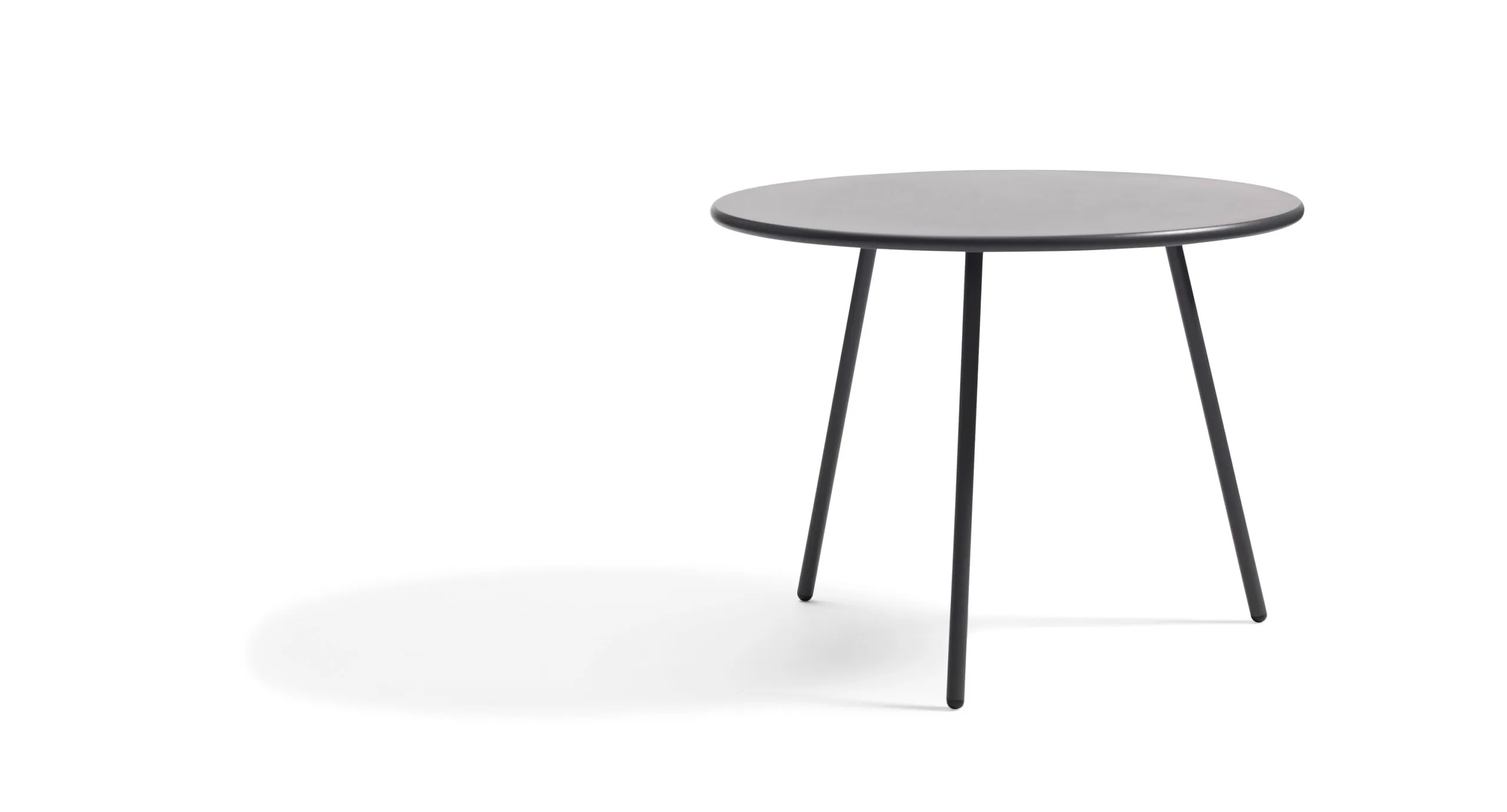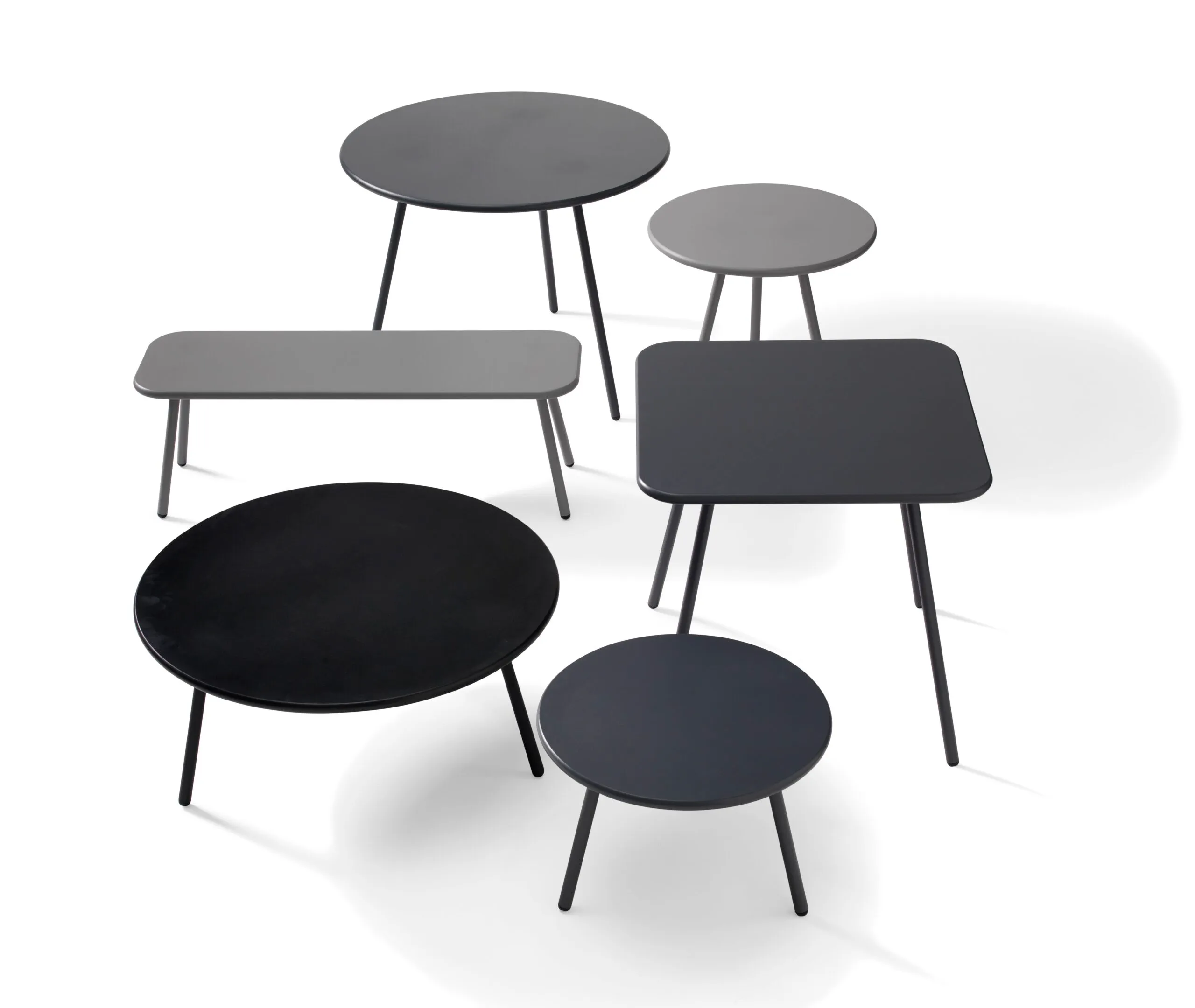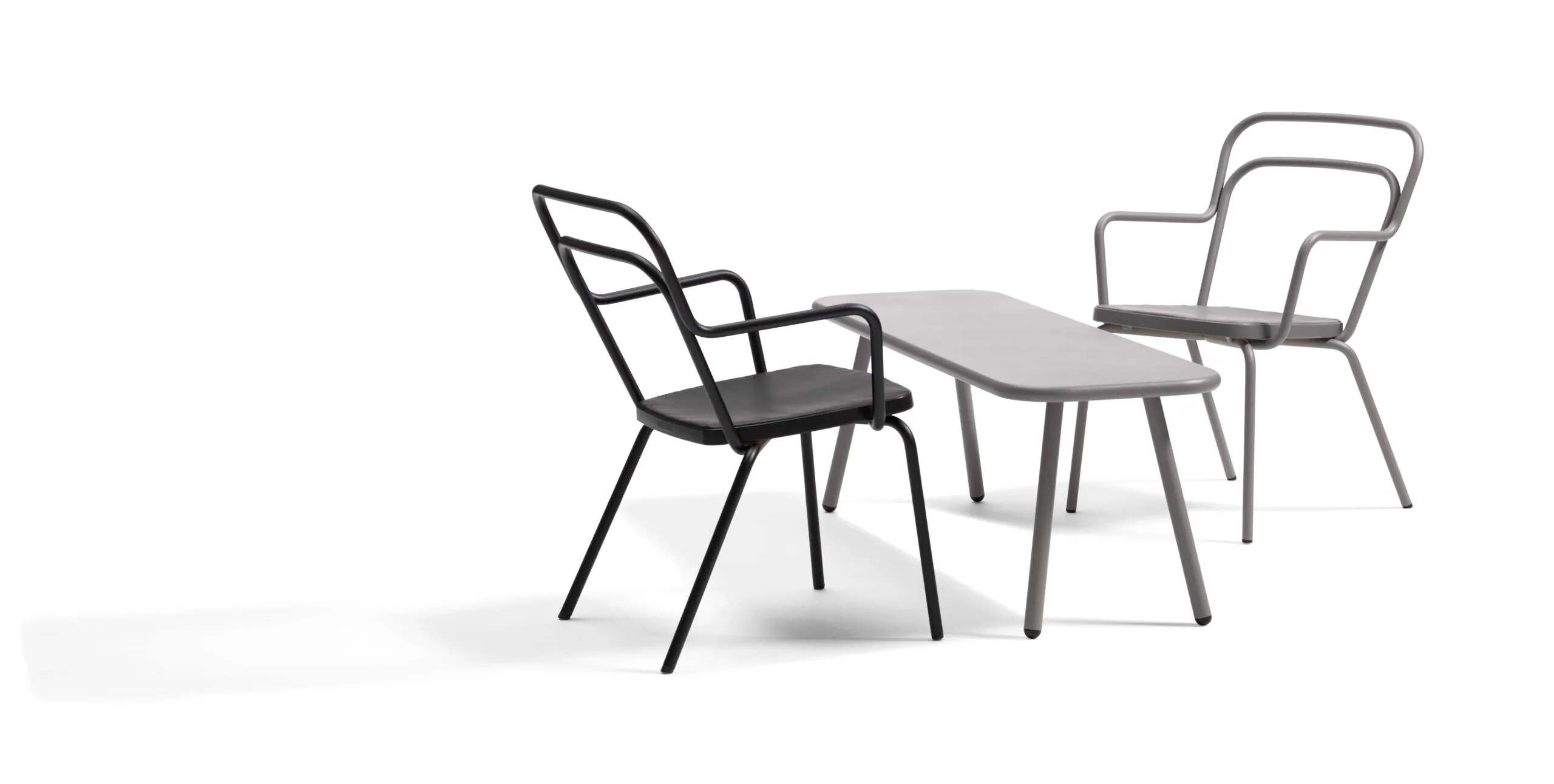 Frame in galvanized and lacquered tubular steel. Seat of moulded polyurethane foam (PUR). Kaffe table can be dismantled. Legs of galvanized lacquered tubular steel. Tops of solid wood or powder-lacquered outdoor grade MDF. Plastic feet.