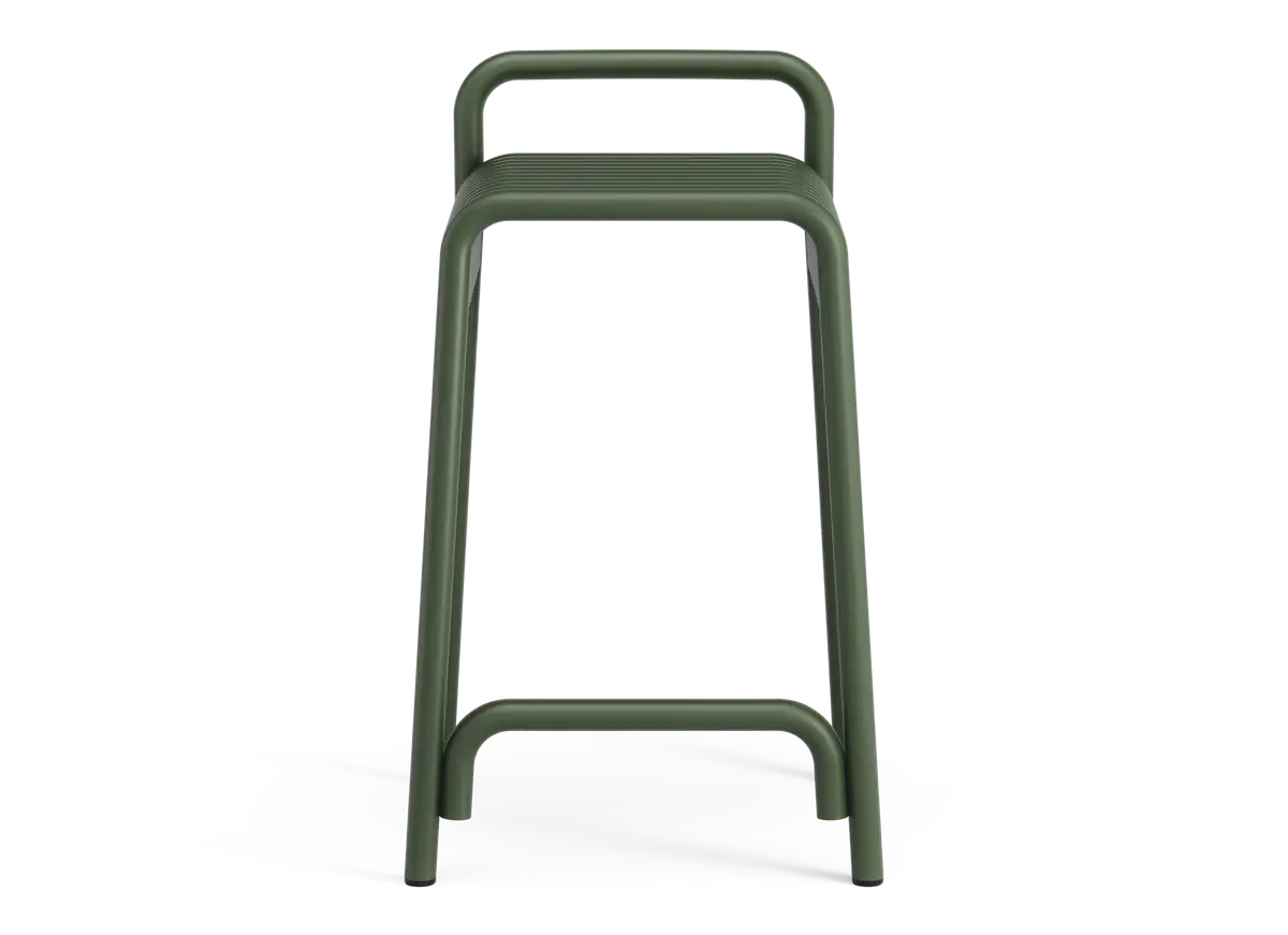 The Kane Stool Low, with its 45 cm seat height, shares the same refined aesthetic while offering versatile seating for various environments. The lightweight yet robust aluminum construction makes it practical without sacrificing elegance.
