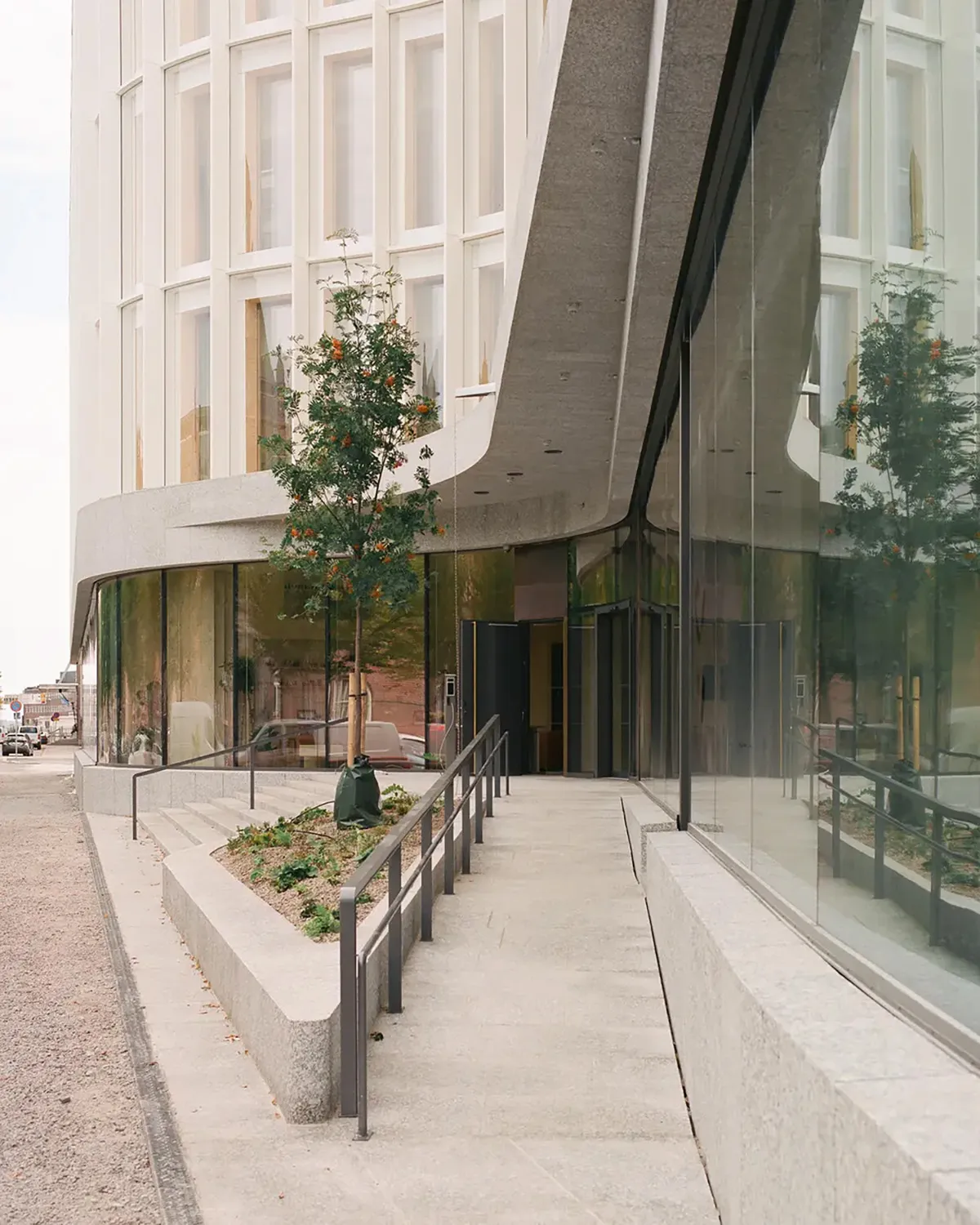 The building has four floors above the ground, a publicly accessible green rooftop terrace, and a basement that houses technical facilities and parking. The building was designed as the new head office of the leading Nordic forestry company Stora Enso, and half of it is occupied by a hotel. The street-level spaces connect to the surrounding city on both sides and feature a large, shared open foyer, restaurant, café, and conference spaces. The structural system and the design of the spaces allow for maximal flexibility and adaptability of the interior over a long lifecycle. The exposed spruce structures together with careful spruce and ash detailing exhibit the natural diversity of wood as a building material. The design of the interior has been guided by a preference for materials that are natural, sustainable, and will age beautifully. Besides wood, the Viitasaari gray granite used on the facades and on the pavement outside as well as inside connects the building to its urban environment. The outdoor spaces of the building are inspired by northern nature and feature a birch grove in the courtyard and archipelago meadows on the rooftop.