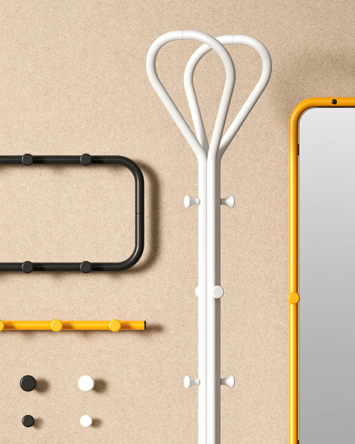 The items launching in 2025 include several categories such as a slender freestanding coat stand with an airy bow-like top, an efficient coat hanger nodding to the 50s hat rack by its shape, a slim minimalist hook strip, and a hallway mirror with extra hooks for a keychain or other essentials. And of course, the wall mounted hooks, available in two sizes. All five new designs in the Classic 2025 range, are produced locally in southern Sweden and available in several colors, lengths and versions.