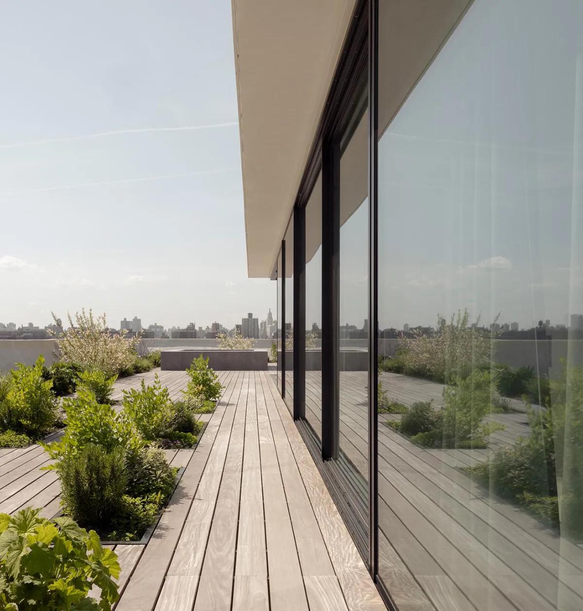 Expansive floor-to-ceiling windows flood the space with natural light, blurring the boundary between the indoors and the breathtaking surroundings. Beyond the windows, a large wooden deck beckons, offering breathtaking views of the Manhattan cityscape. It’s a serene retreat, where urban life meets tranquil living, with every detail carefully curated for a sense of unity and calm – a perfect blend of urban energy and quiet retreat.