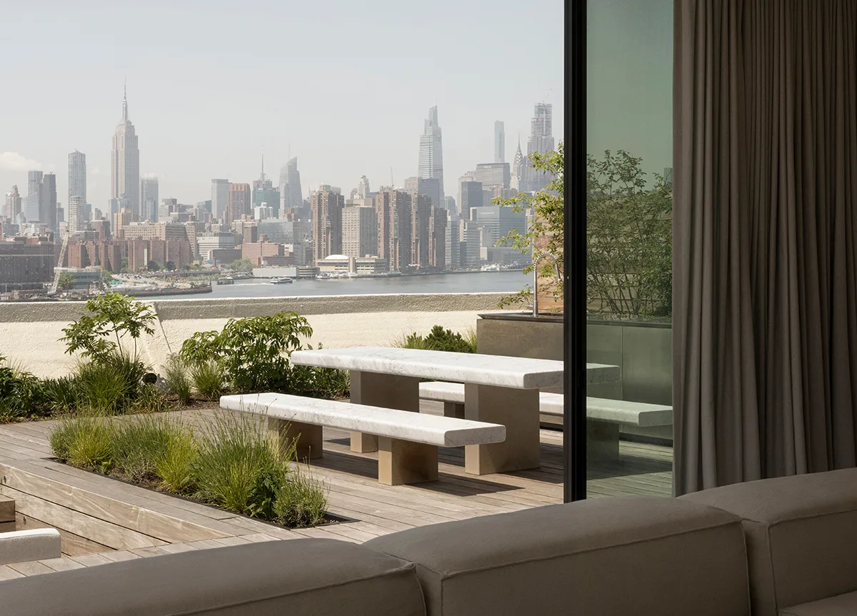 With its blend of modern design and tactile materials, the Kent Avenue penthouse embodies contemporary elegance and tranquility, delivering a space that feels both intimate and spacious.