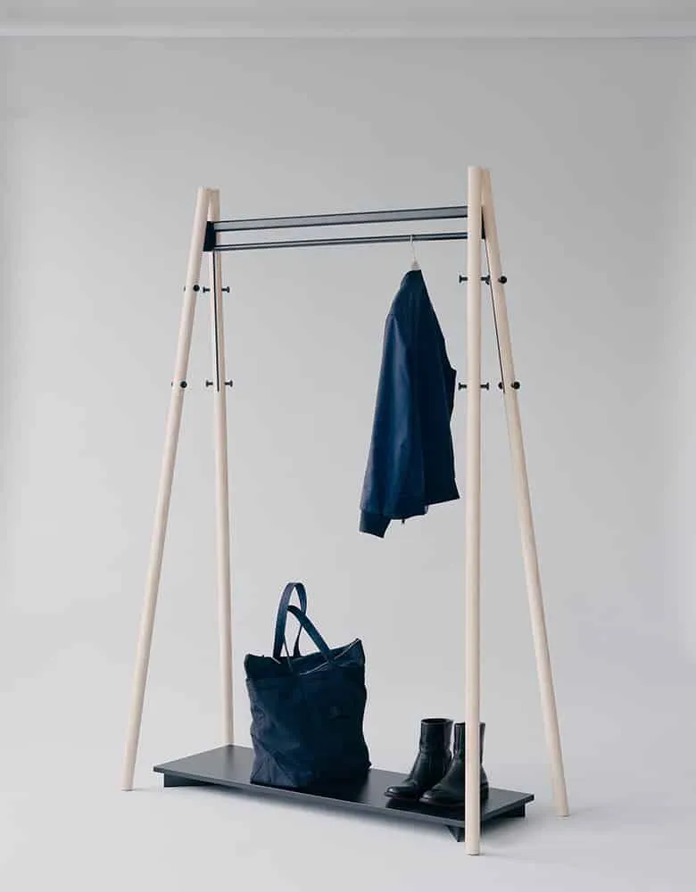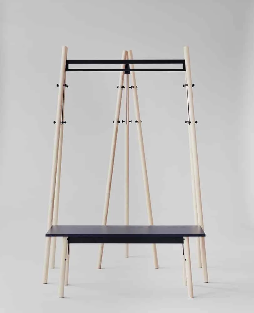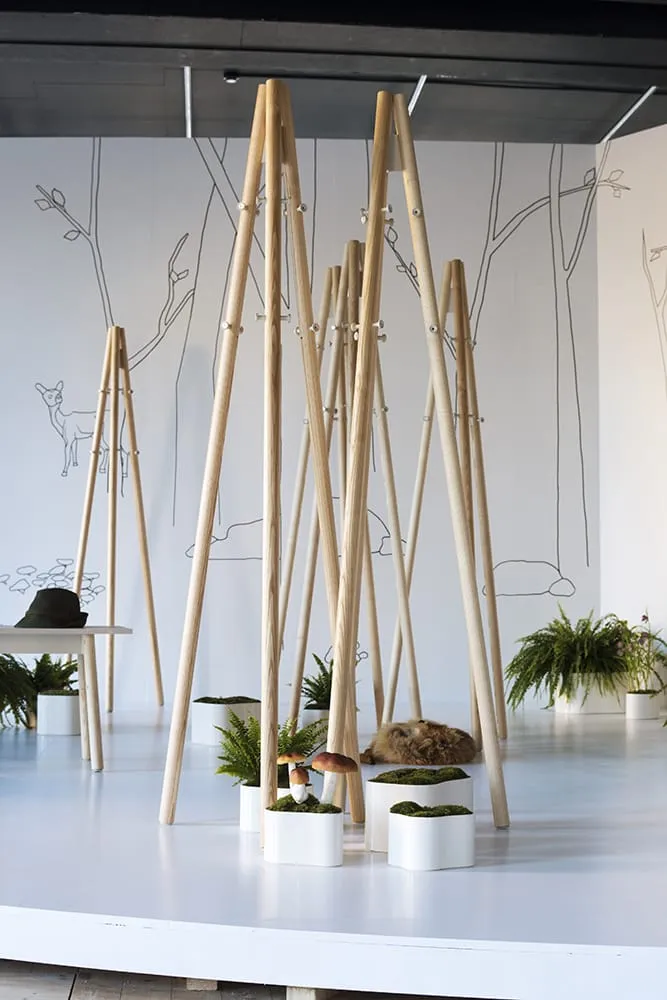 Rybakken’ s Kiila system includes a unique wedge-shaped joint (Kiila translates as ‘ wedge’ in Finnish) made from powder-coated metal onto which solid wooden legs are fitted. They are secured with metal pins which double as hanging pegs on the coat stand and coat rack. Rybakken has purposefully kept all aspects of the construction visible; “How the pieces are produced is put on display. These are transparent designs; nothing is hidden from the user.”The Kiila family of objects is robust, designed for longevity. This quality has been articulated visually in the heft of the wooden rods used; they are unapologetically heavy. Inventing a system of construction, rather than designing individual pieces, pays homage to the origins of some of Aalto’ s most famous designs. In Rybakken’ s own words: “There is a very apparent logic to the Kiila series and I recognise this in Aalto designs too. These are products designed within the parameters of industrial manufacture, they are intended to be part of a system that can be repeated.” What is more, thanks to a clever approach to production, all the products in the Kiila family can be shipped flat-packed; a last nod towards a recognised Artek standard.